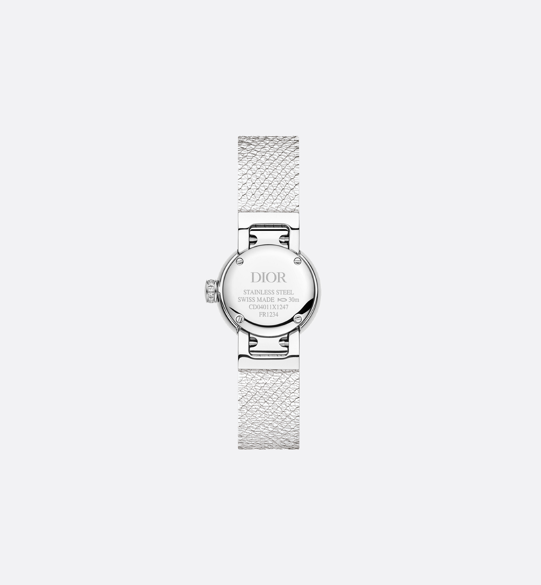 Case: 19-mm (0.7-inch) steel. Stainless steel bezel set with 40 brilliant-cut diamonds (0.32 ct). Steel crown set with 13 brilliant-cut diamonds (0.03 ct). Water resistant: 30 meters (98 feet). Cannage-engraved satin motif dial. Polished dauphine hands. Anti-glare sapphire crystal. Milanese stainless steel bracelet with satin motif and Cannage engraving, steel folding clasp. Quartz movement. Functions: Hours – Minutes. Two-year warranty. Made in Switzerland. *The stone weights are based on average weights only.