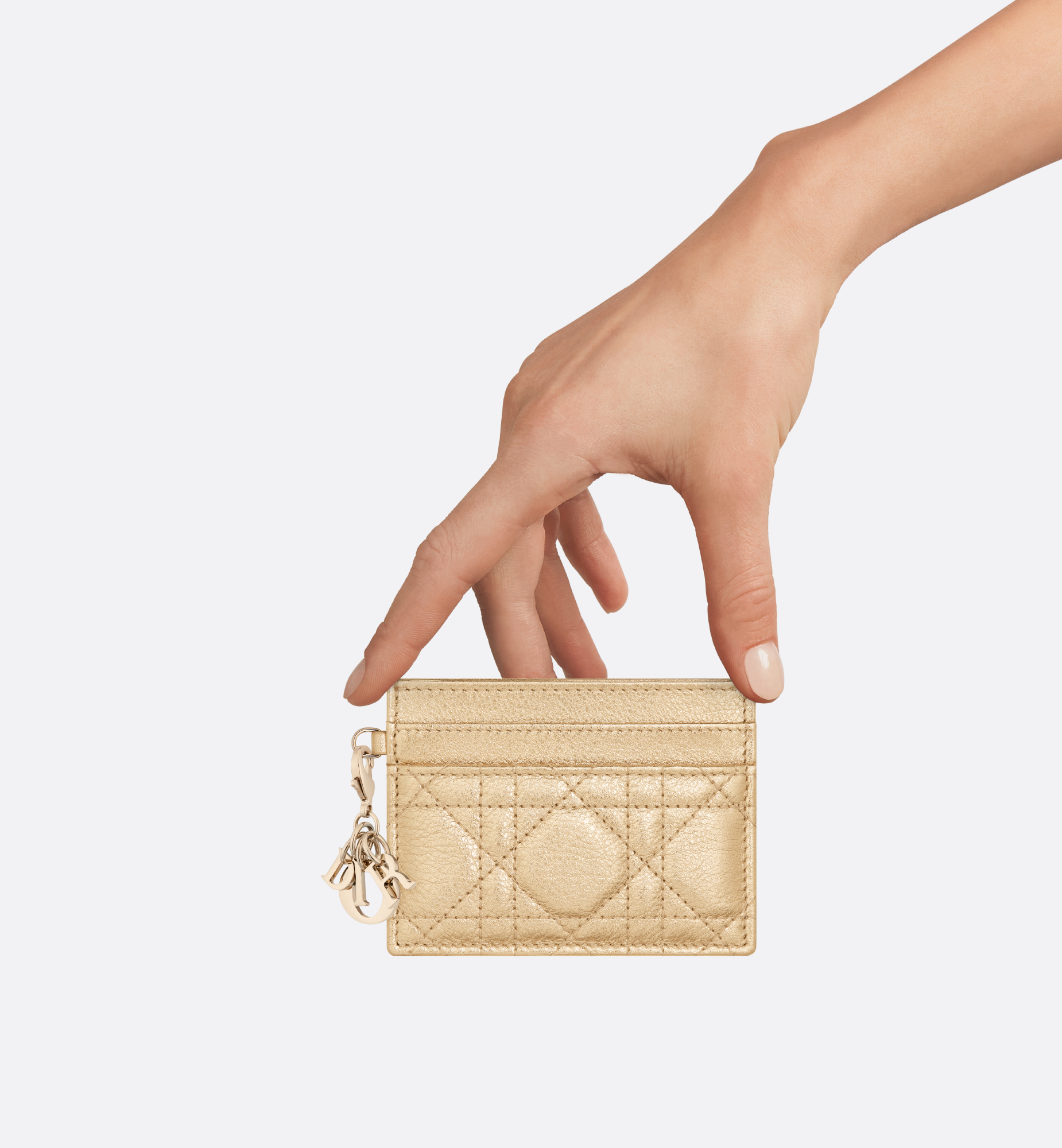 The Lady Dior Freesia card holder presents an elegant and practical design. Crafted in metallic pale gold-tone calfskin with Cannage stitching, it is embellished with detachable D.I.O.R. charms. Featuring five card slots, the refined accessory will easily slip into any pocket or bag and can be paired with other Lady Dior creations. Main composition: calfskin. Technical fabric and lambskin lining. Detachable D.I.O.R. charms. Five card slots. Made in Italy
