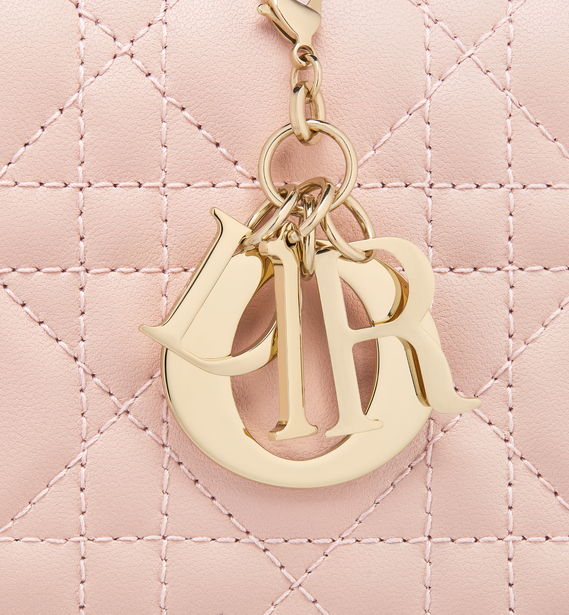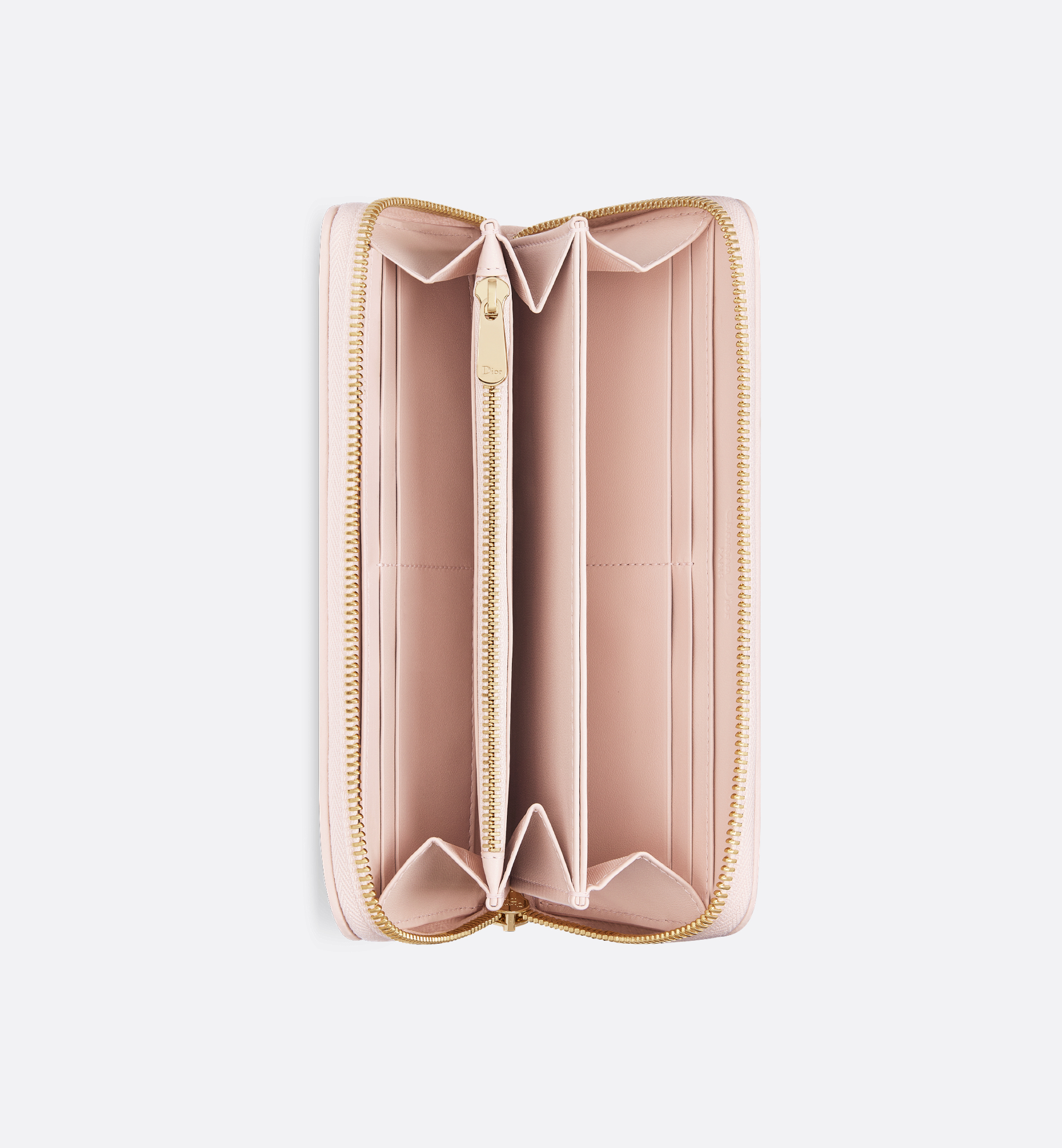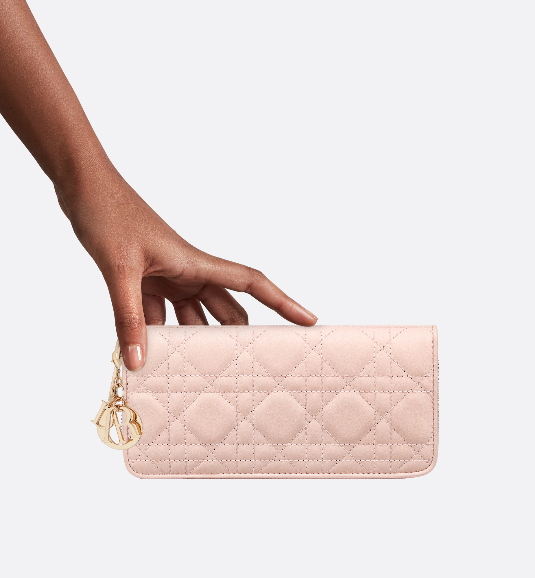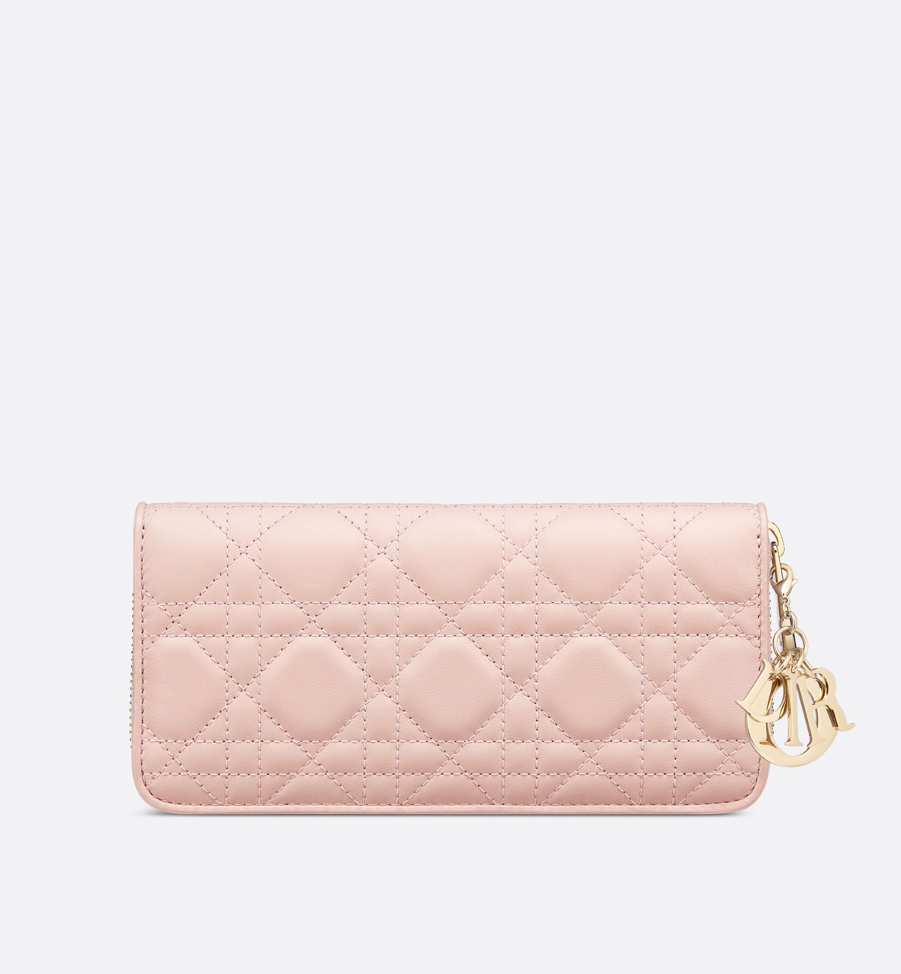 The Lady Dior Voyageur wallet is crafted in powder pink lambskin and offers a contemporary variation of the iconic Cannage topstitching. A spacious and chic companion, the wallet is embellished with D.I.O.R. charms and may be paired with other bags from the same line. Main composition: lambskin. Lambskin and technical fabric lining. Detachable D.I.O.R. charms. Three compartments. Eight card slots. Three slip pockets. One zip pocket. Made in Italy or Spain