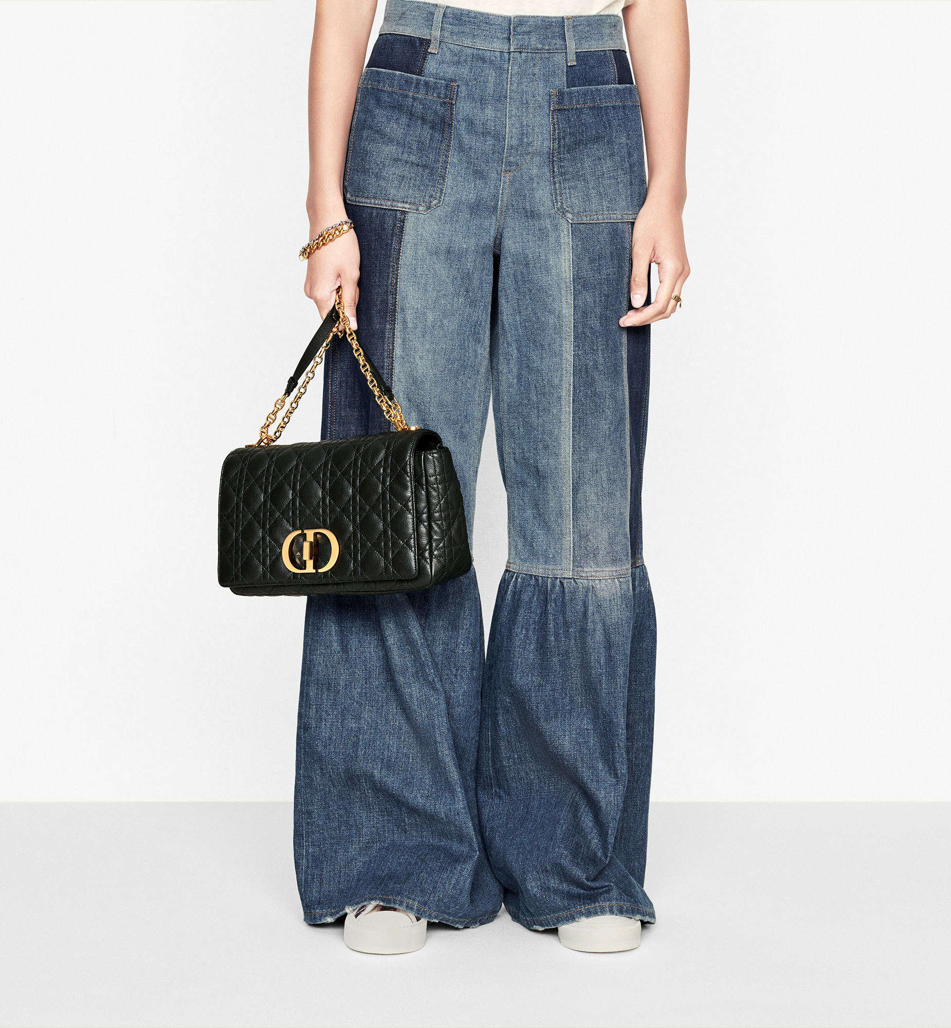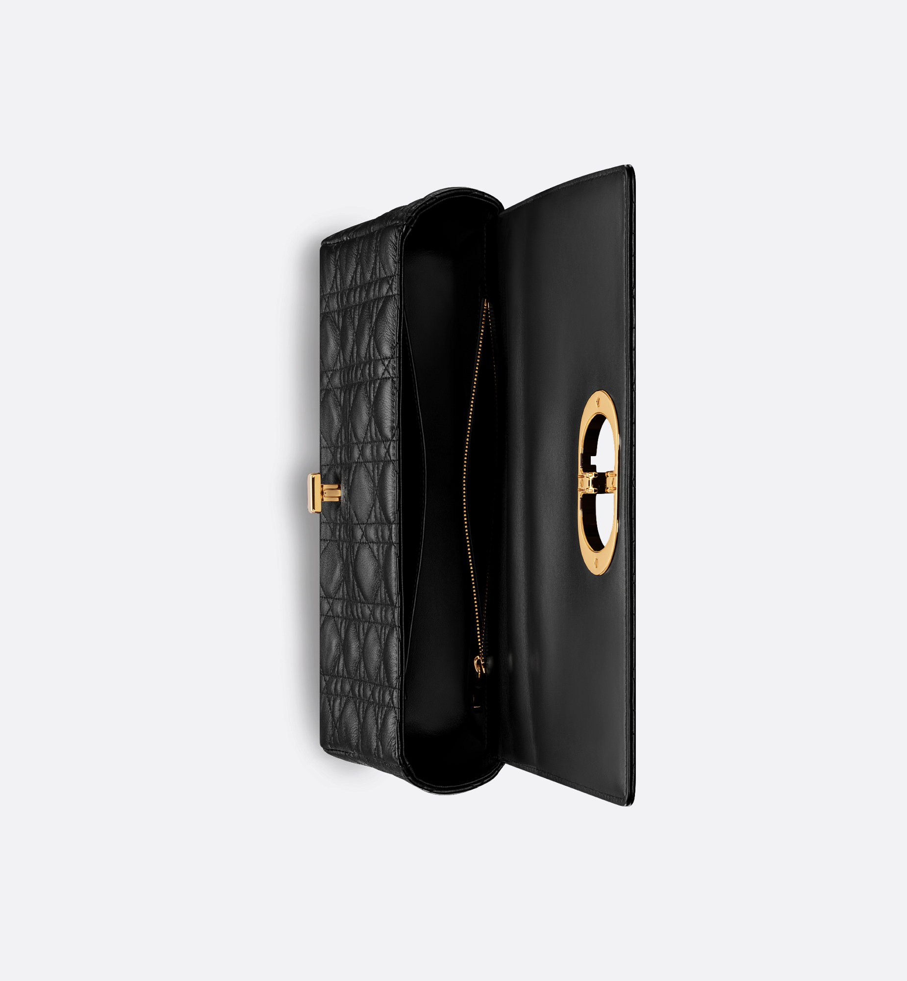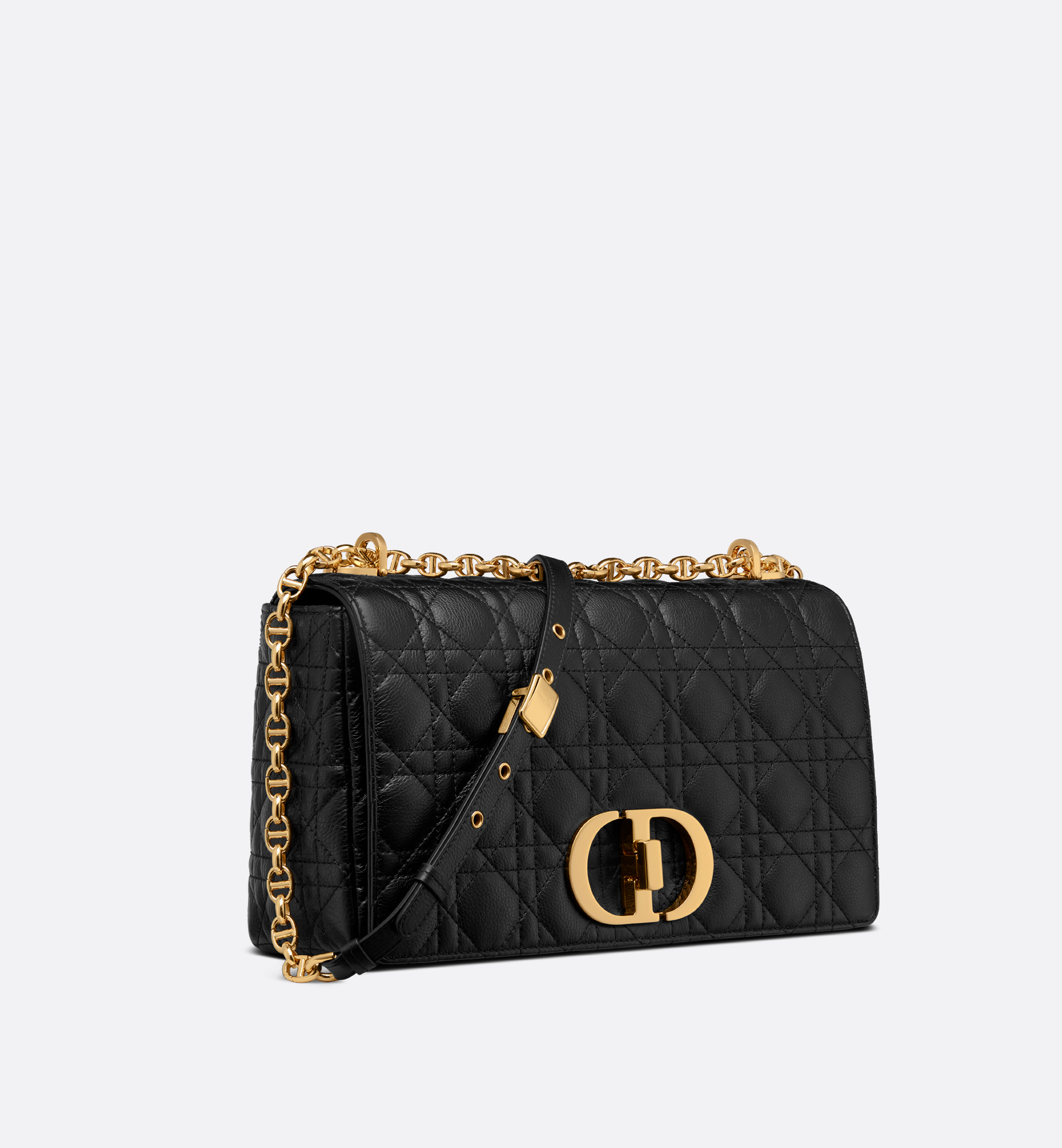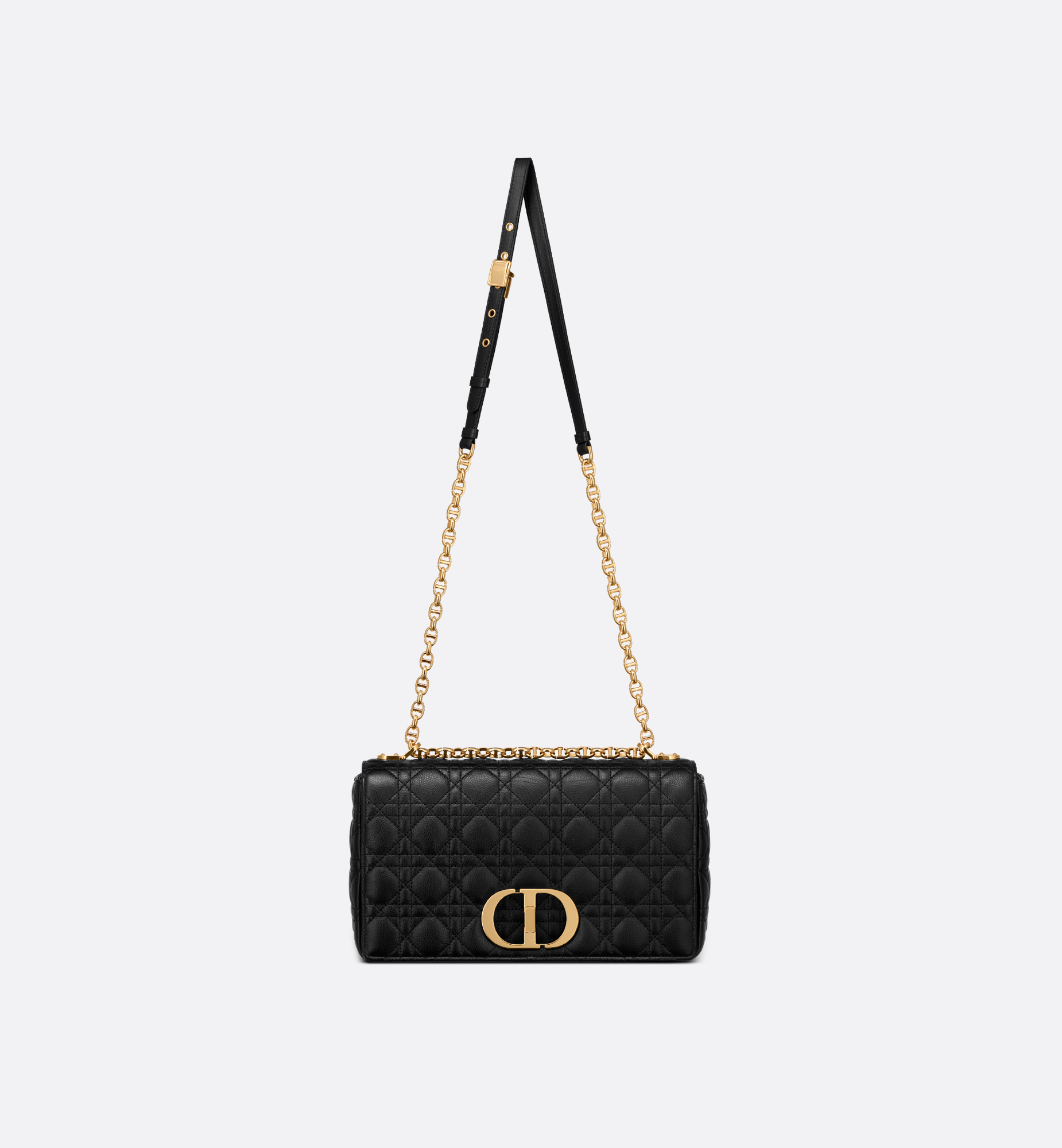 The Dior Caro bag combines modernity with timeless elegance. The silhouette is crafted in black supple calfskin with Cannage stitching. The bag features a flap adorned with an antique gold-finish metal CD twist clasp, inspired by the seal of a Christian Dior perfume bottle. The detachable chain strap with CD signature links allows the large bag to be carried by hand, worn over the shoulder or crossbody, and may be replaced by one of the House’s wide embroidered straps for day or evening attire. Main composition: calfskin. Lambskin and calfskin lining. Flap closure with CD twist clasp. Embossed 30 Montaigne signature on the back. Adjustable, detachable CD chain link strap with Christian Dior Paris military-inspired buckle. Two removable links with an X-shaped center notch allow the chain to be opened. Interior zip pocket and slip pocket. Back pocket. The bag may be paired with the House’s different embroidered straps. Dust bag included. Made in Italy