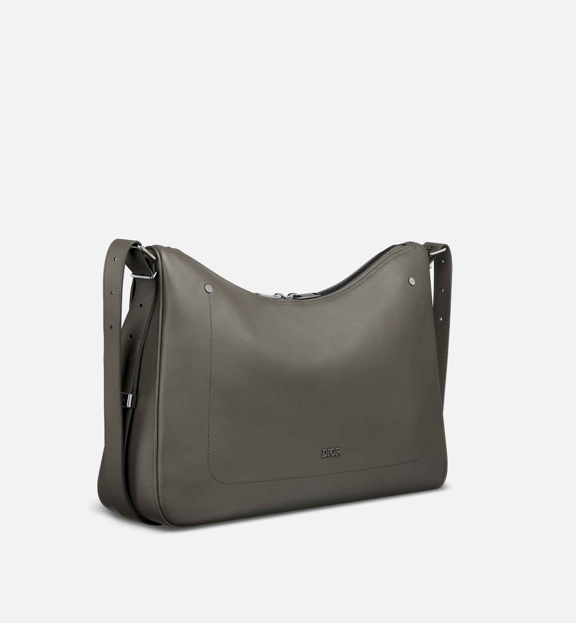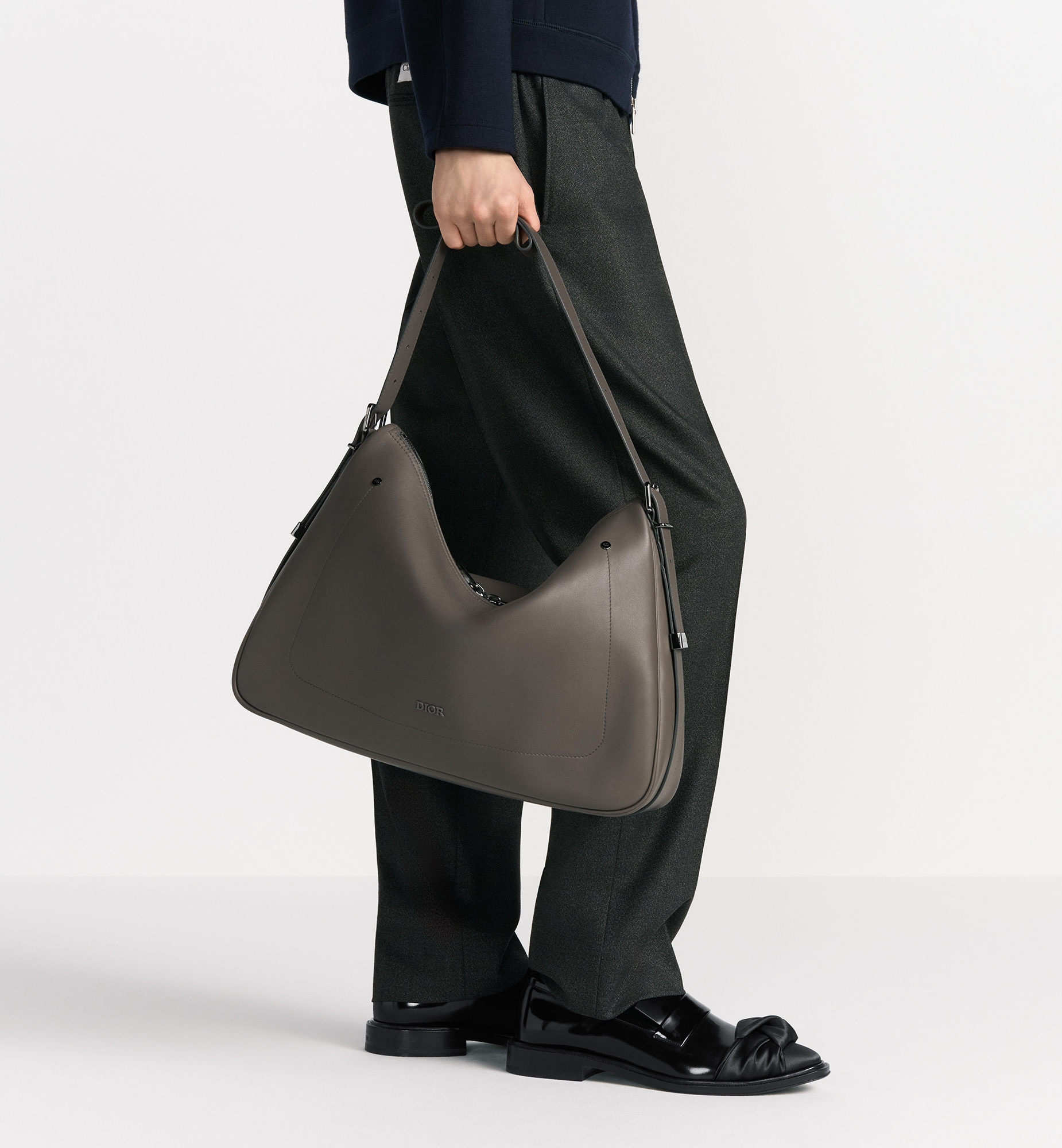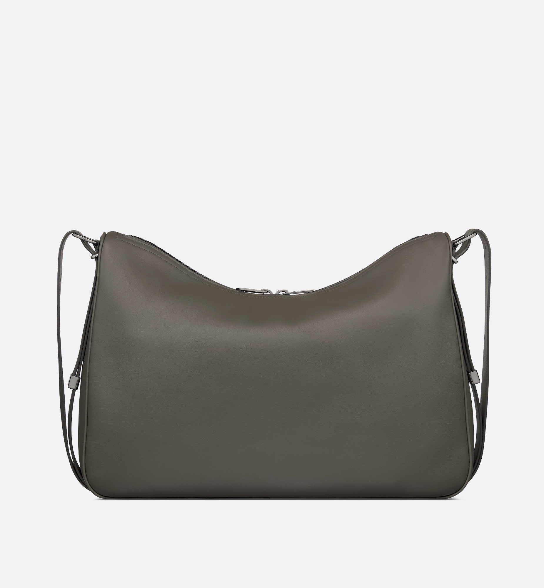 Debuted at the Winter 2025-2026 Fashion Show, the Dior Slider zipped hobo bag is refined and modern. Its streamlined, supple silhouette in gray smooth calfskin is enhanced by topstitch detailing and decorative metal rivets on the front, as well as a tonal Dior signature. The spacious compartment features a zip pocket, and the leather strap can be adjusted using the metal Dior Slider hardware, which combines function with sleek design. The large style can be worn over the shoulder or crossbody for a signature Dior look. Main composition: calfskin. Technical fabric and calfskin lining. Main zip compartment. Interior zip pocket. Adjustable leather shoulder strap with Dior Slider hardware. Topstitching and decorative rivets on the front. Tonal Dior signature on the front. Embossed Dior signature on the interior. Dust bag included. Made in Italy