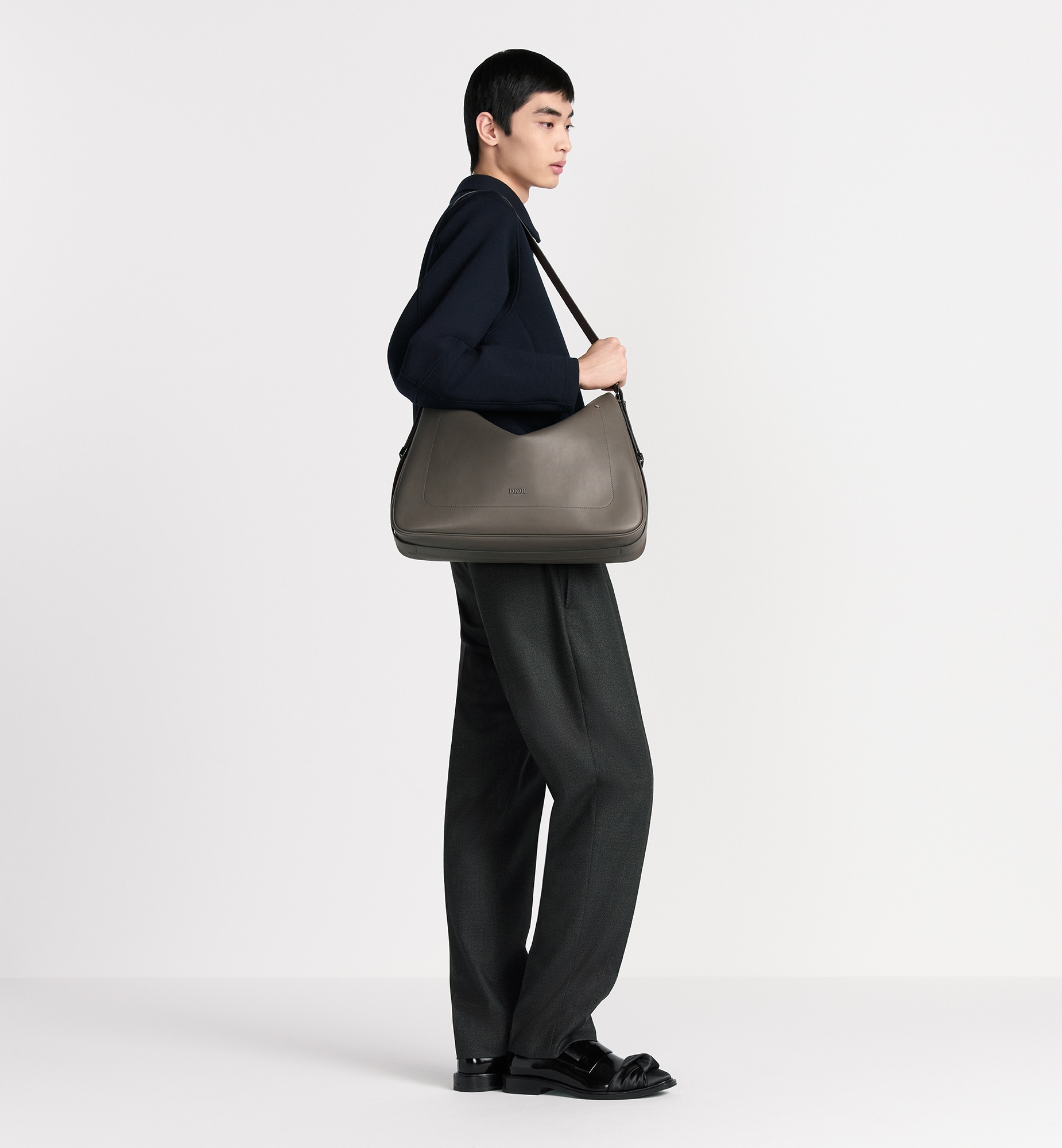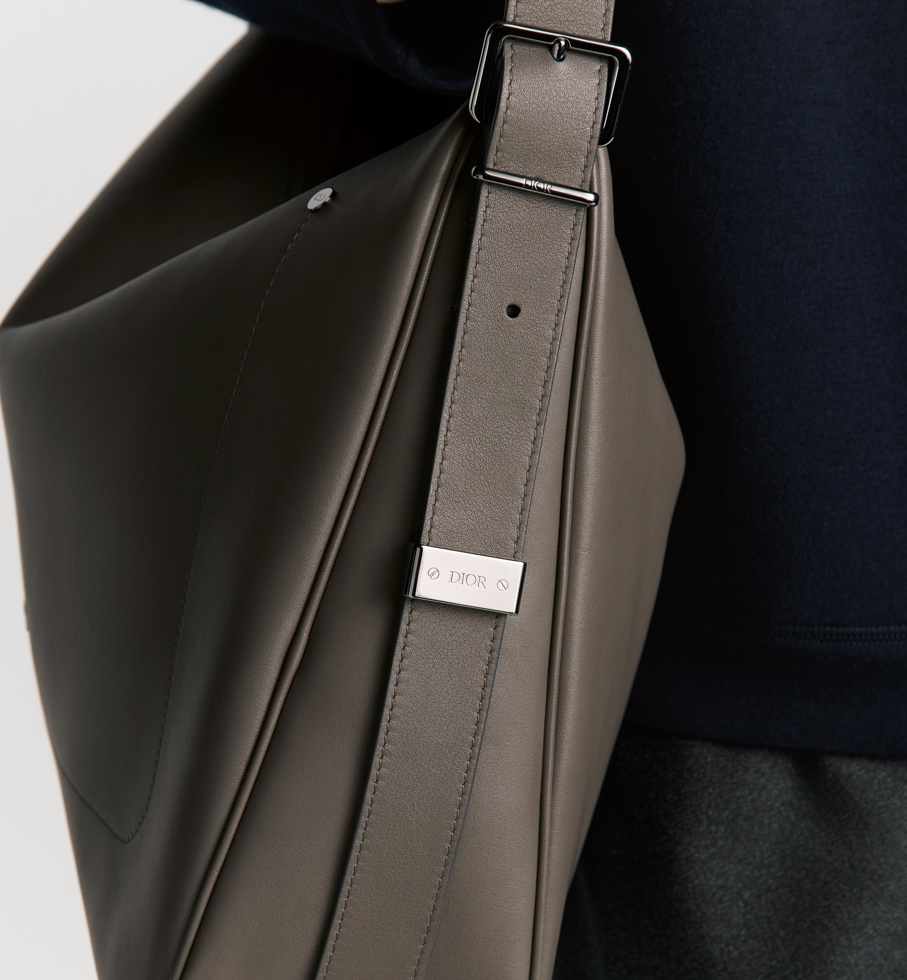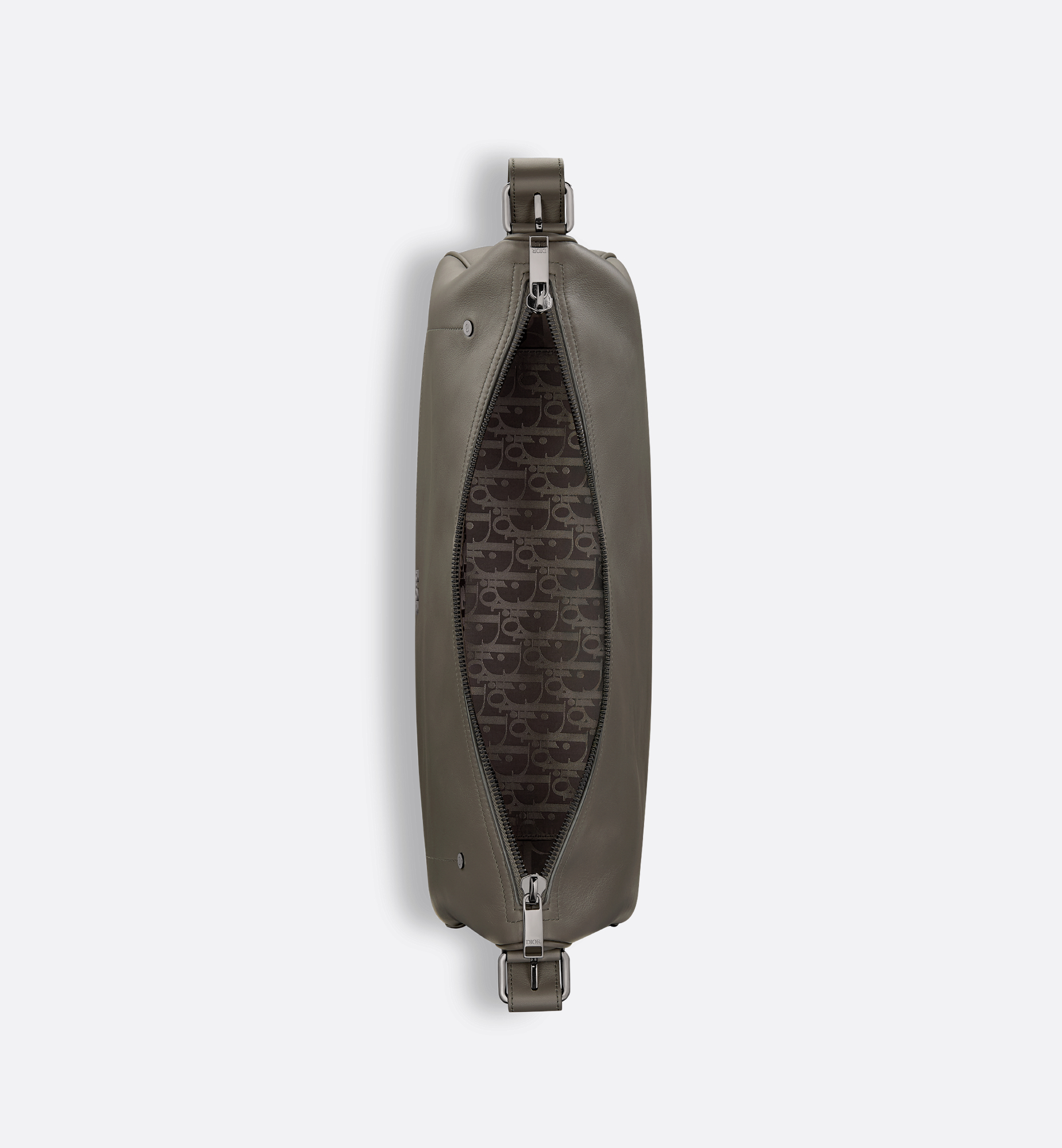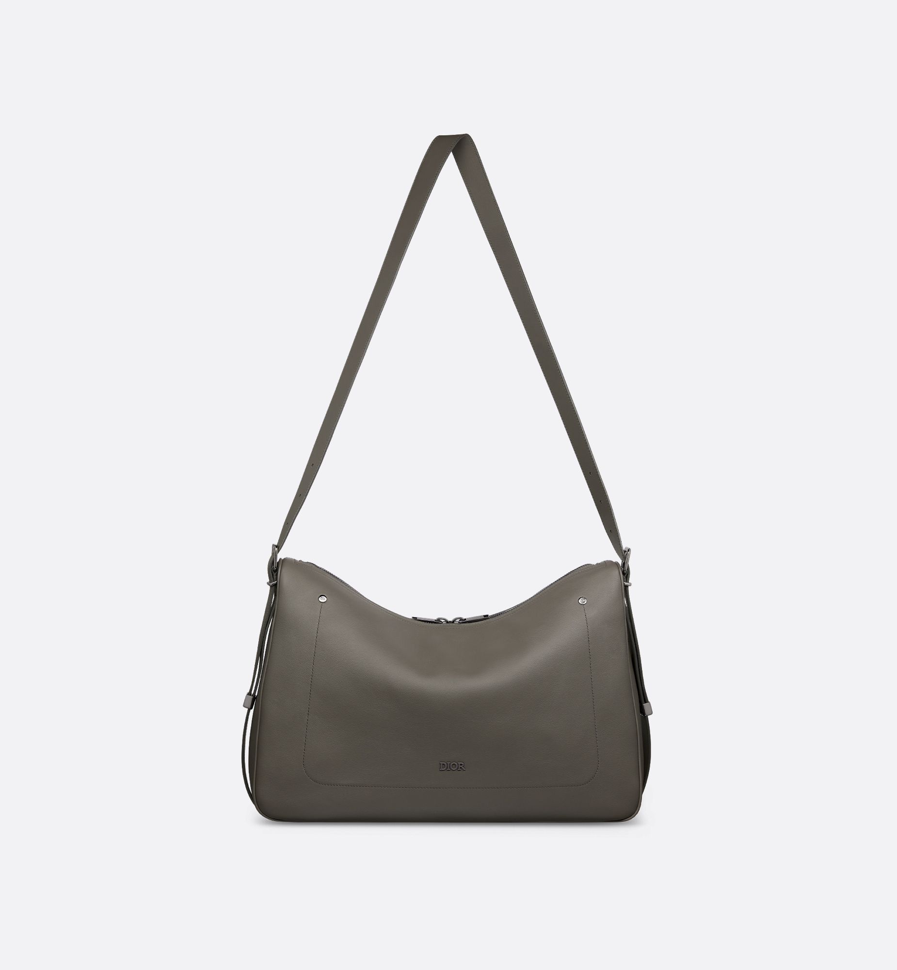 Debuted at the Winter 2025-2026 Fashion Show, the Dior Slider zipped hobo bag is refined and modern. Its streamlined, supple silhouette in gray smooth calfskin is enhanced by topstitch detailing and decorative metal rivets on the front, as well as a tonal Dior signature. The spacious compartment features a zip pocket, and the leather strap can be adjusted using the metal Dior Slider hardware, which combines function with sleek design. The large style can be worn over the shoulder or crossbody for a signature Dior look. Main composition: calfskin. Technical fabric and calfskin lining. Main zip compartment. Interior zip pocket. Adjustable leather shoulder strap with Dior Slider hardware. Topstitching and decorative rivets on the front. Tonal Dior signature on the front. Embossed Dior signature on the interior. Dust bag included. Made in Italy