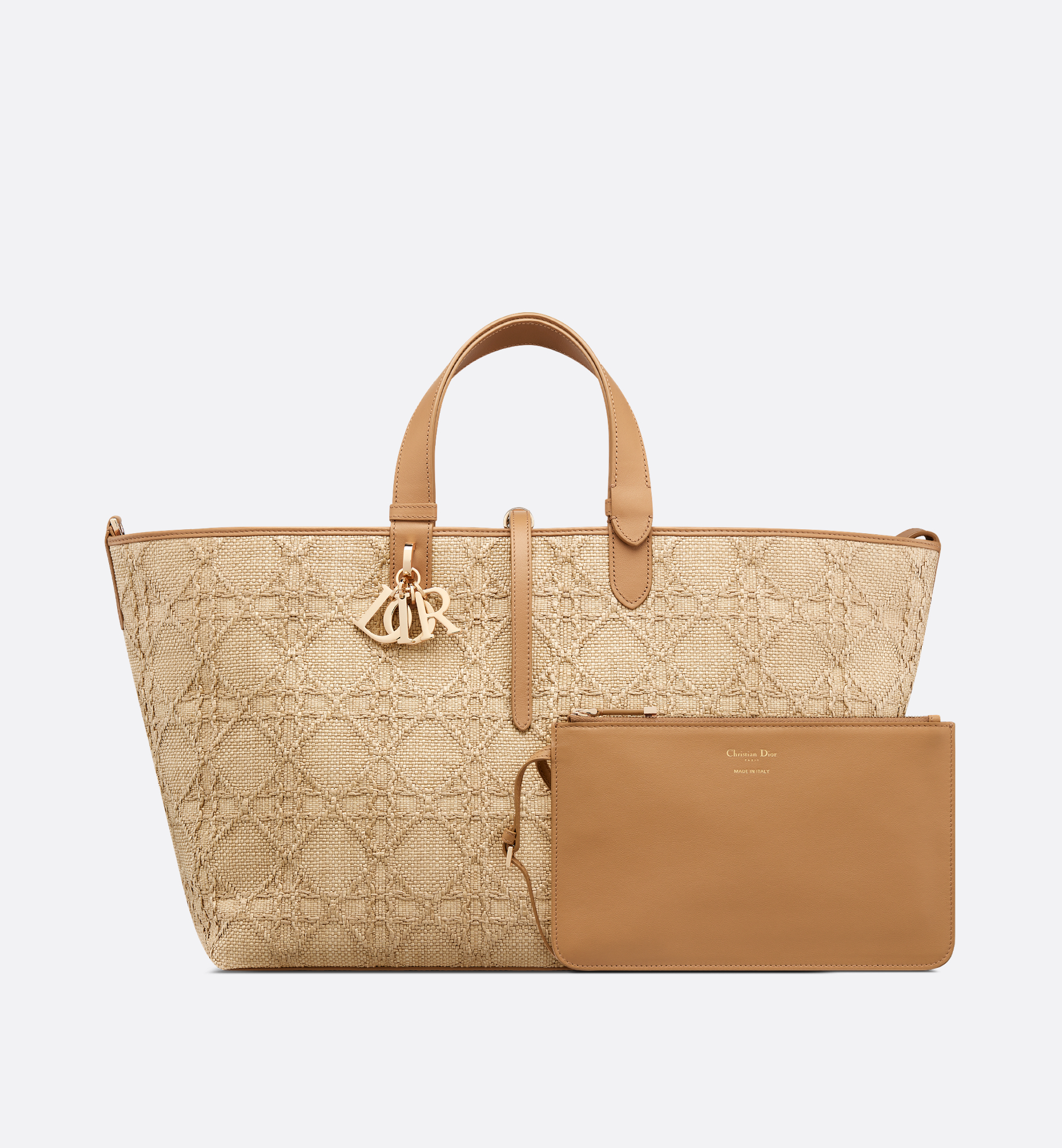 The Dior Toujours bag is distinguished by a casual and practical design. Demonstrating the House’s savoir-faire, the style is constructed in natural raffia with the iconic Cannage motif. It showcases a spacious interior compartment with a matching pouch to organize the essentials. Its thin leather strap closure keeps items secure while the D of the CD Lock closure twists to alter the sides and enhance the bag’s silhouette. The leather top handles can be adjusted using the small notches to allow the large bag to be carried by hand or worn over the shoulder. Main composition: technical fabric and calfskin. Technical fabric and calfskin lining. Double closure: a thin lace-through strap and a Christian Dior Paris strap with a CD Lock clasp. D.I.O.R. charms. Removable interior pouch. Adjustable leather top handles. Dust bag included. Made in Italy