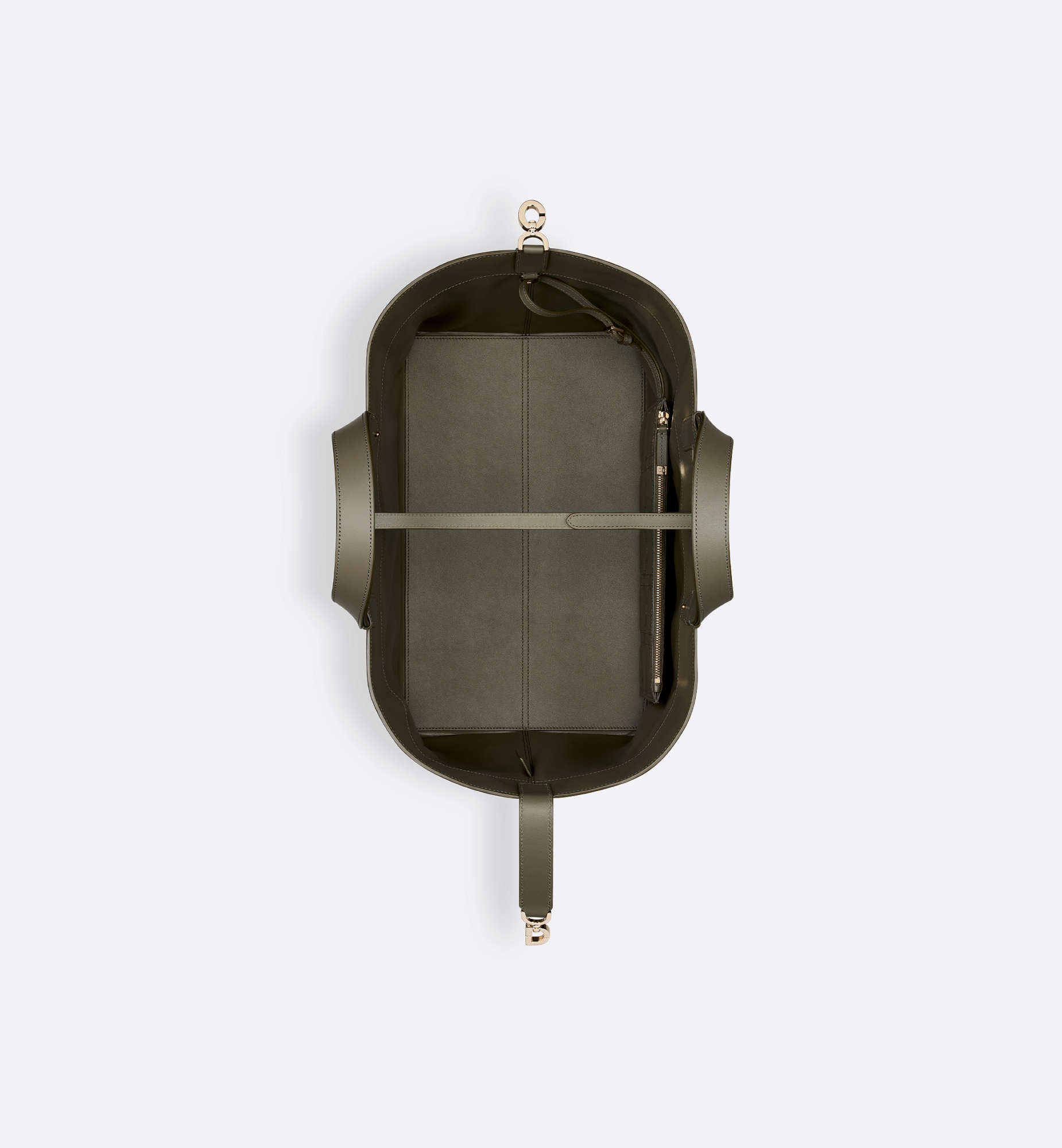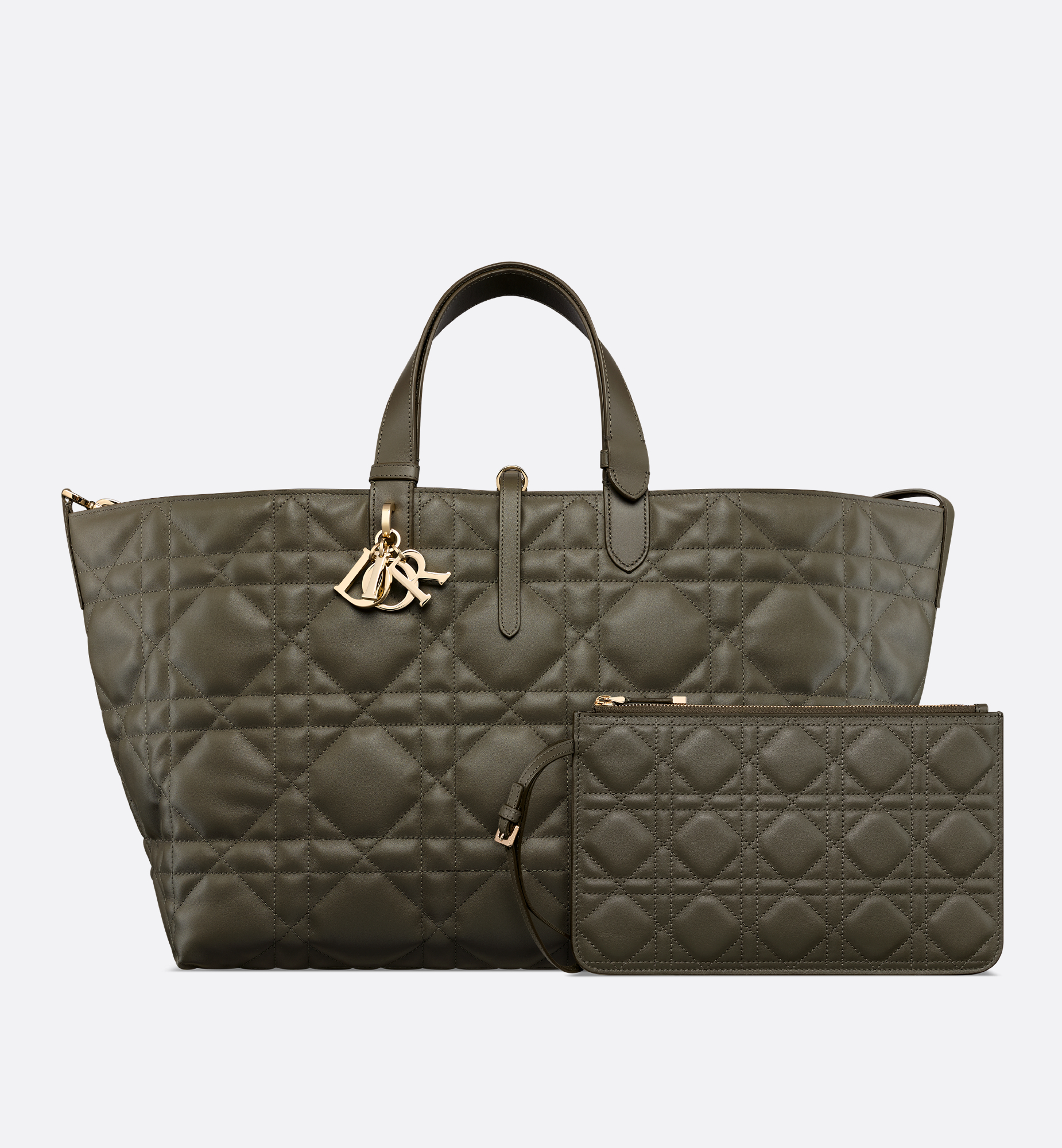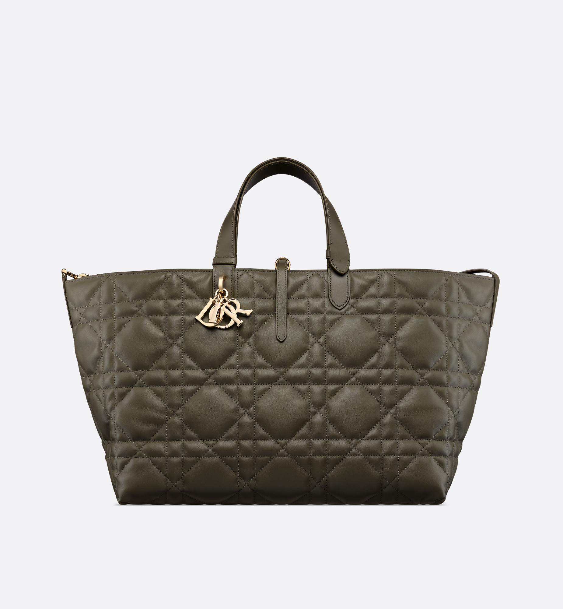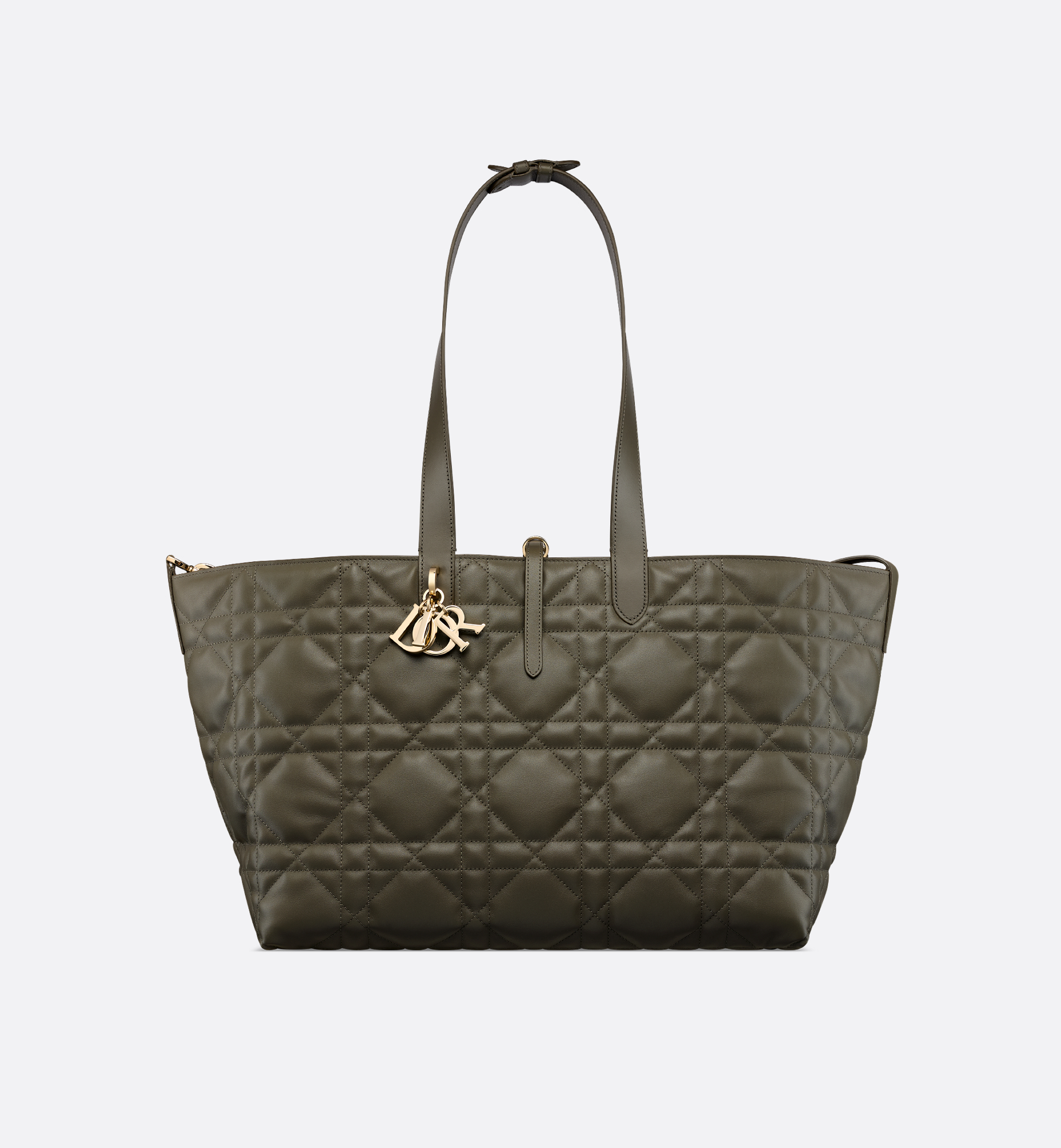 The Dior Toujours bag is distinguished by a casual and practical design. Crafted in olive taupe calfskin with Macrocannage topstitching, the style showcases a spacious interior compartment with a matching pouch to organize the essentials. Its thin leather strap closure keeps items secure while the D of the CD Lock clasp twists to adjust the sides and enhance the bag’s silhouette. The leather top handles can be adjusted using the small notches so the large bag can be carried by hand or worn over the shoulder. Main composition: calfskin. Calfskin lining. Double closure: a thin lace-through strap and a Christian Dior Paris strap with a CD Lock clasp. Pale gold-finish metal D.I.O.R. charms. Removable interior pouch. Adjustable leather top handles. Dust bag included. Made in Italy