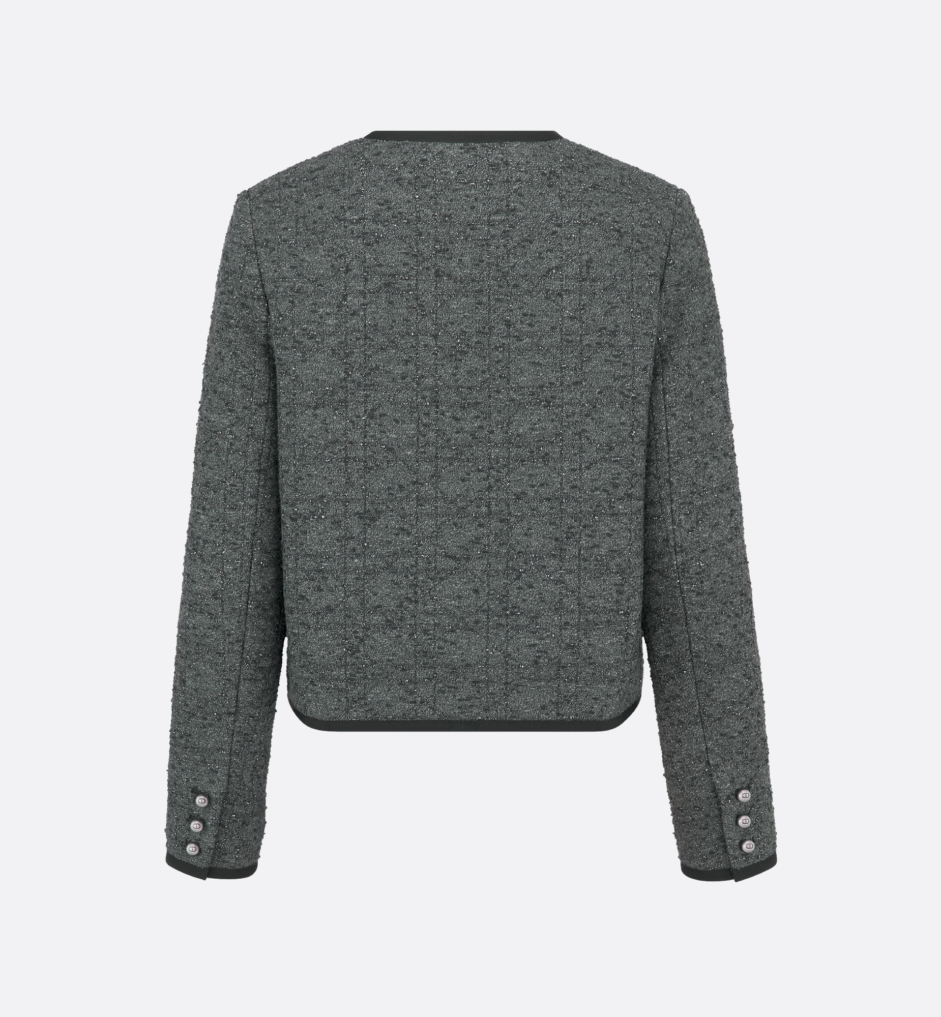 The cropped jacket offers a modern take on Dior’s codes of elegance. Crafted in gray cotton-blend tweed embroidered with the Macrocannage motif in silver-tone metallic thread, it features a cropped, regular-fit silhouette adorned with Dior Tribales buttons, showcasing a CD resin pearl inspired by the iconic House earring. Complete with patch pockets and black grosgrain detailing, the jacket can be paired with other Macrocannage creations for a signature look. Front Dior Tribales button closure. Grosgrain details. Lined sleeves. 53% cotton, 26% acrylic, 18% polyamide, 3% metallic polyester and lining: 100% silk. Made in Italy. We recommend removing the accessories before cleaning