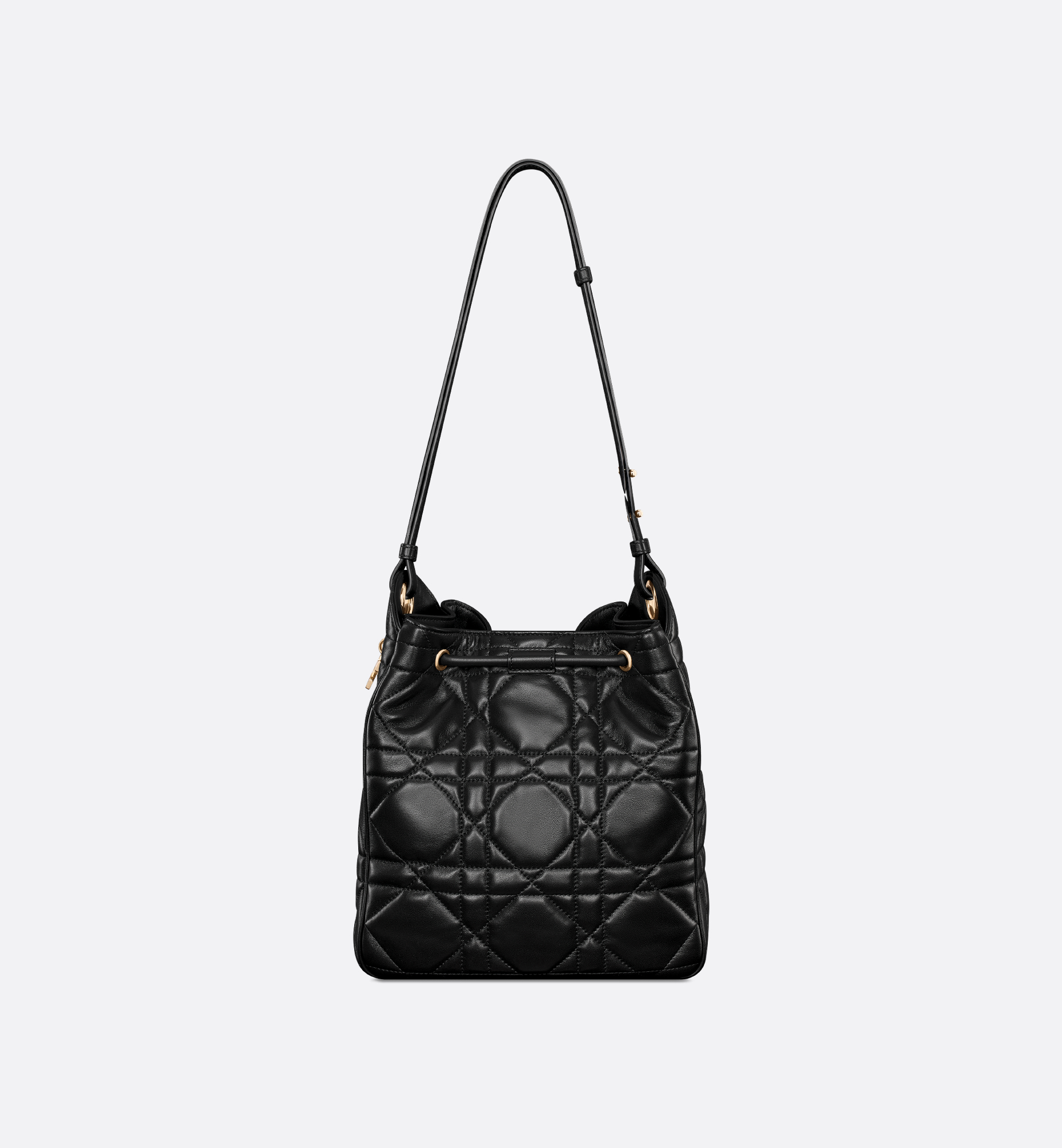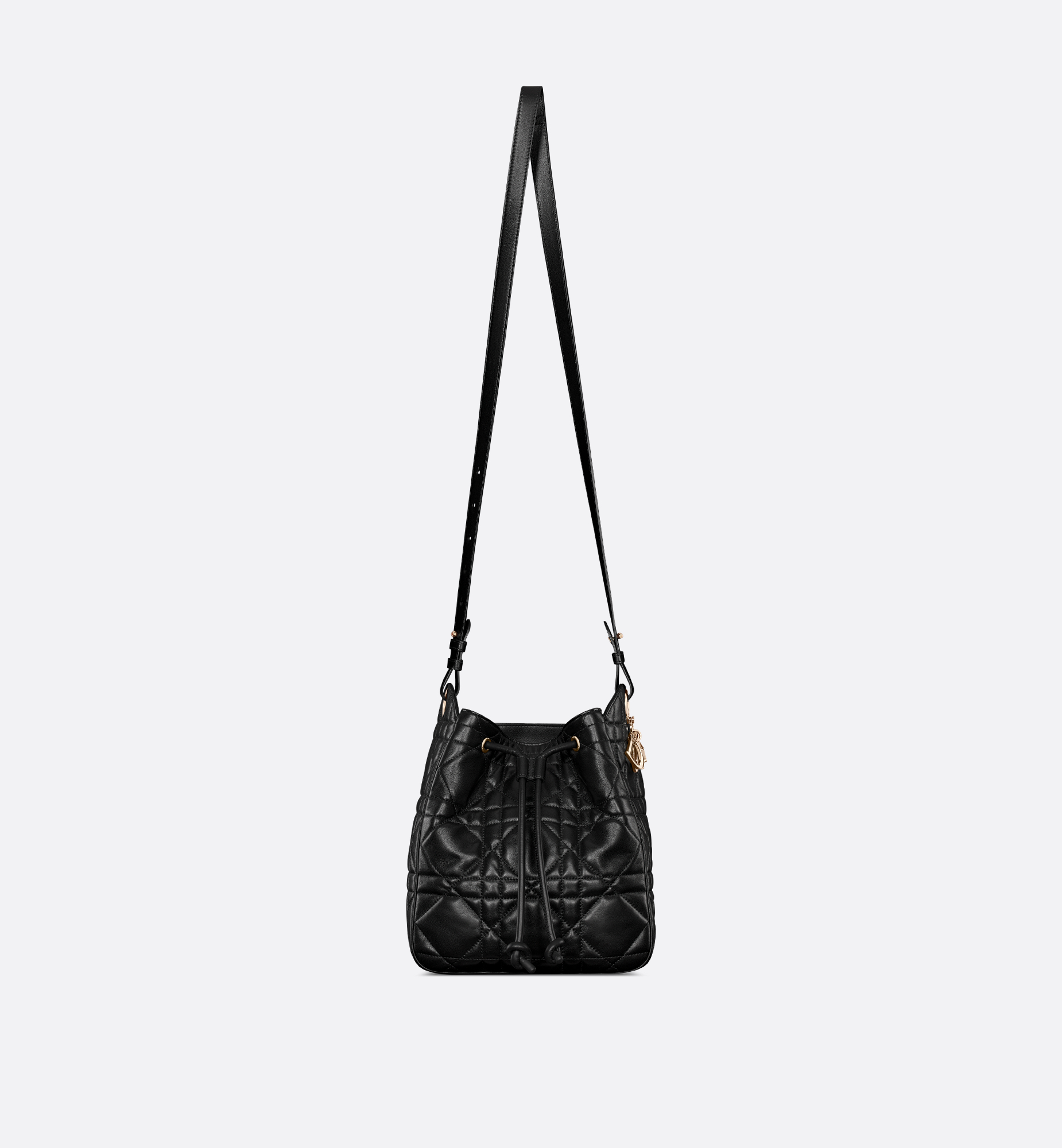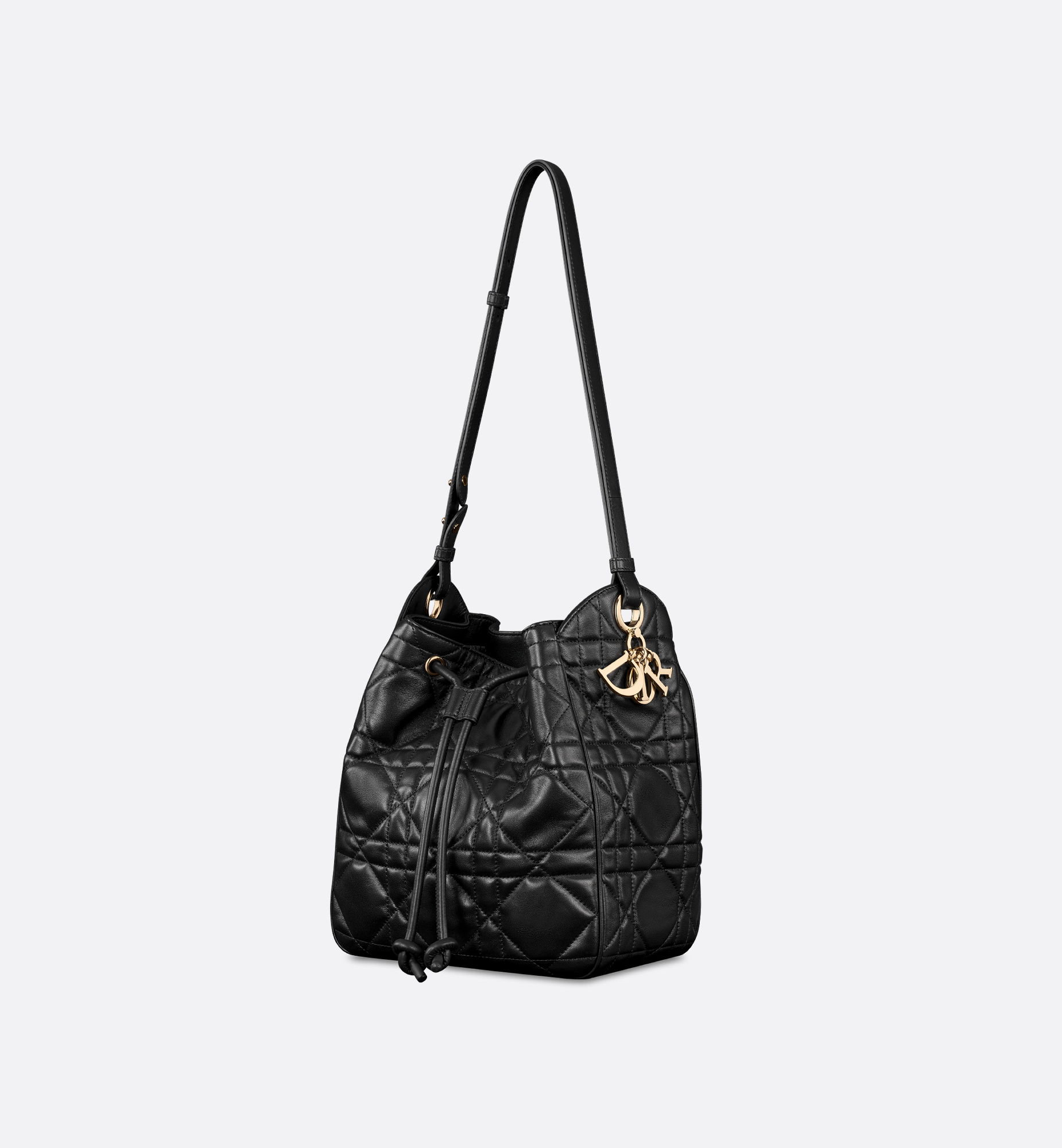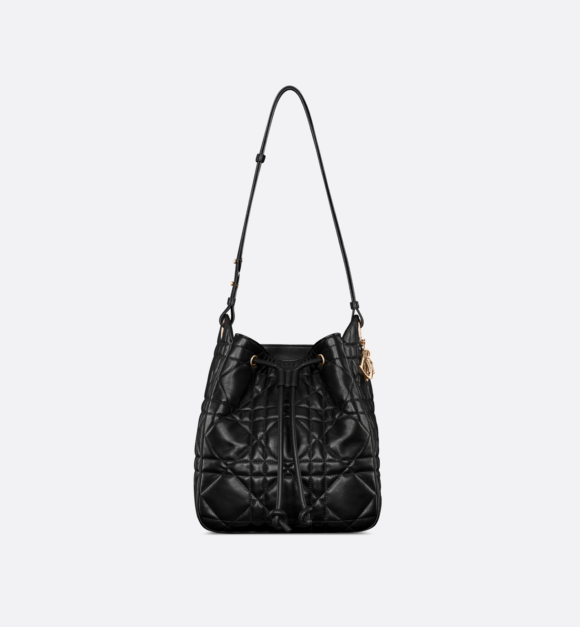 New for Winter 2025, the D-Motion bag is distinguished by a modern and practical bucket design. Crafted in black lambskin with Macrocannage stitching, the supple style features a drawstring closure that opens to reveal a spacious interior compartment with a zip pocket for all the essentials. Adorned with pale gold-finish metal D.I.O.R. charms, the medium bag has an adjustable strap with a sliding design, allowing it to be worn on the shoulder or crossbody. Main composition: lambskin and calfskin. Calfskin lining. D.I.O.R. charms. Drawstring closure. Adjustable leather strap. Two exterior side pockets. Interior zip pocket. Dust bag included. Made in Italy