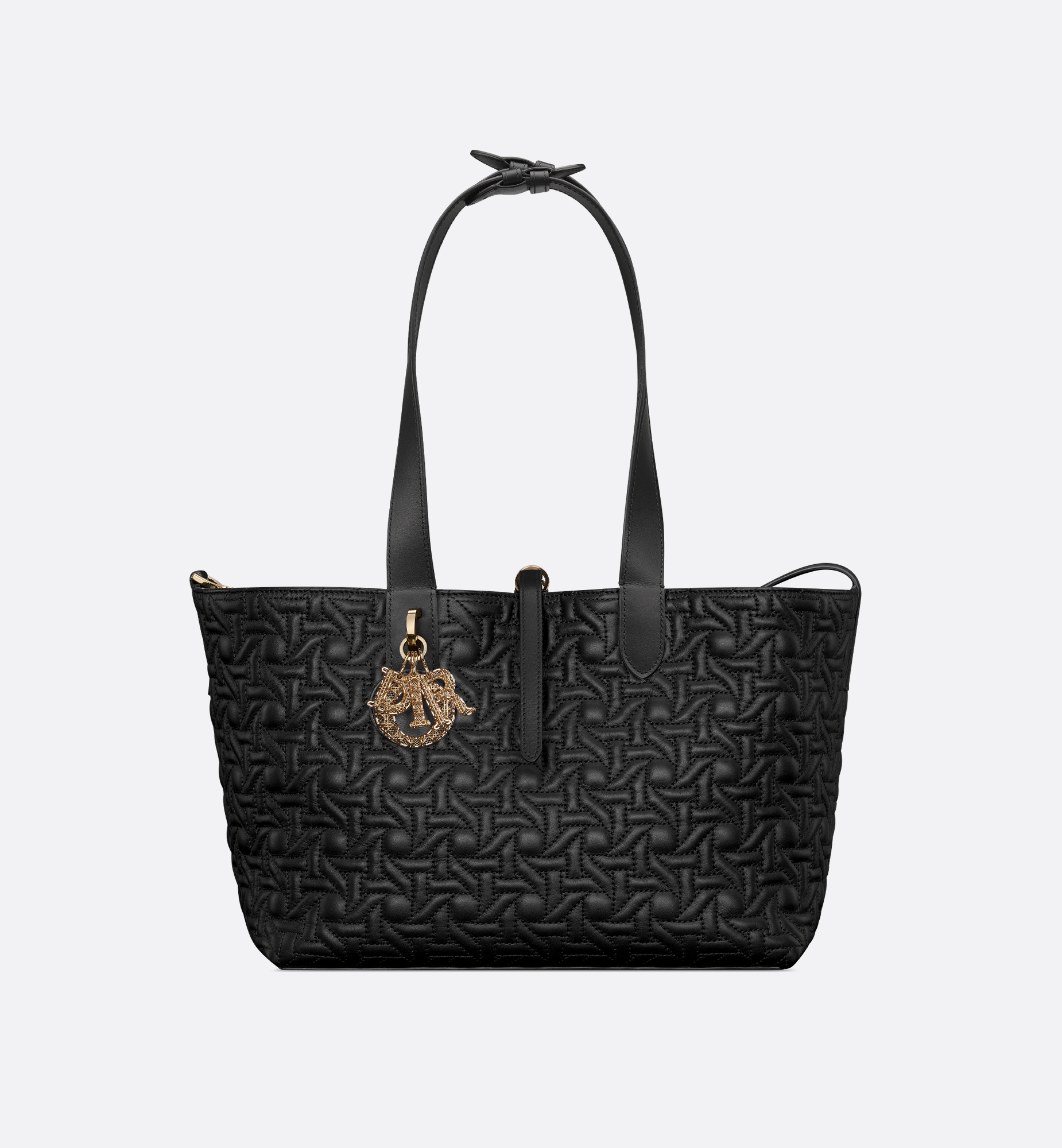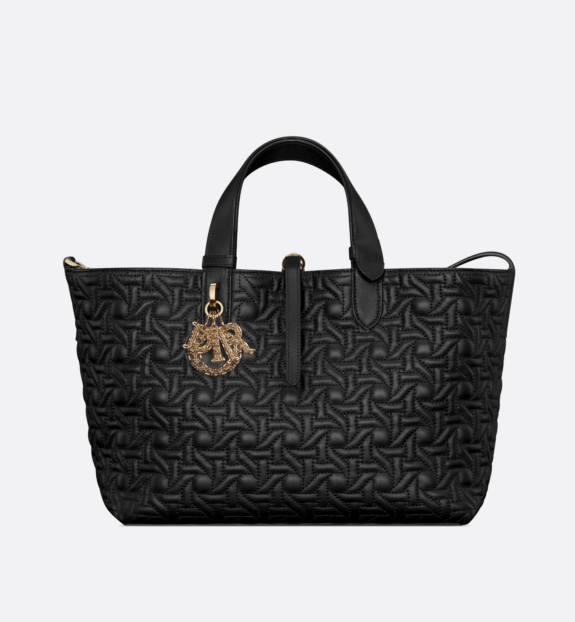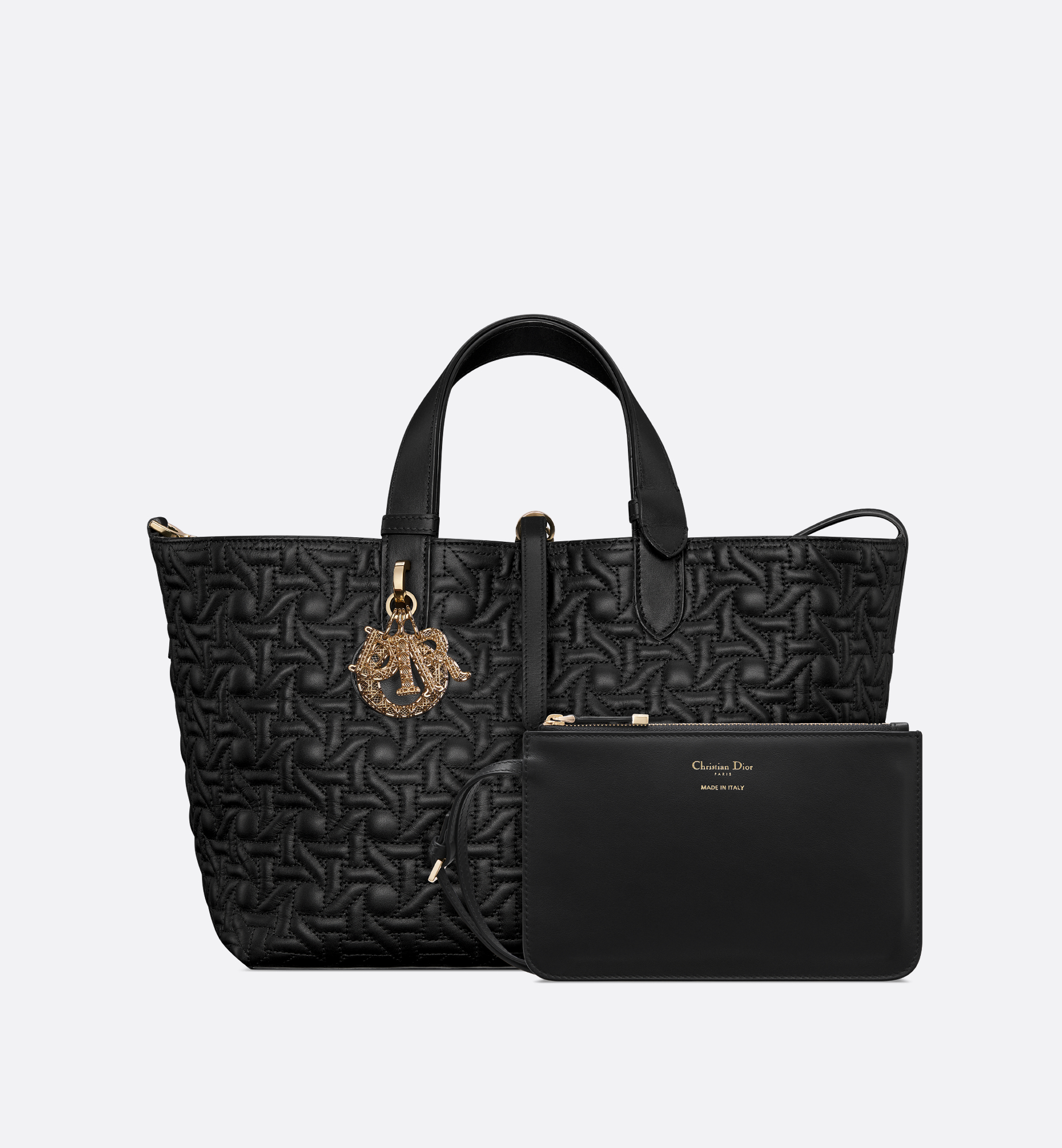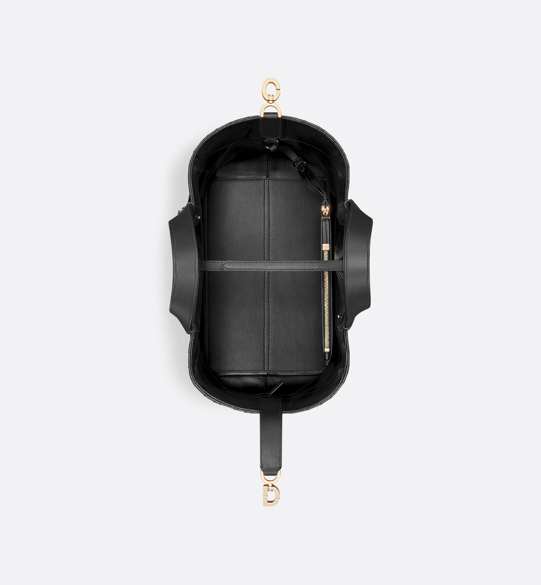 The Dior Toujours bag is distinguished by a casual and practical design. Crafted in black calfskin, it showcases the Graphic Cannage motif, offering a modern 3D version of the House icon. Pale gold-finish metal D.I.O.R. charms with a finely carved openwork Cannage motif lend an elegant touch. The style features a spacious interior compartment with a matching pouch to organize the essentials. Its thin leather strap closure keeps items secure while the D of the CD Lock clasp twists to alter the sides and enhance the bag’s silhouette. The leather top handles can be adjusted using the small notches, allowing the medium bag to be carried by hand or worn over the shoulder. Main composition: calfskin. Calfskin lining. Double closure: a thin lace-through strap and a Christian Dior Paris strap with a CD Lock clasp. D.I.O.R. charms. Removable interior pouch. Adjustable leather top handles. Dust bag included. Made in Italy