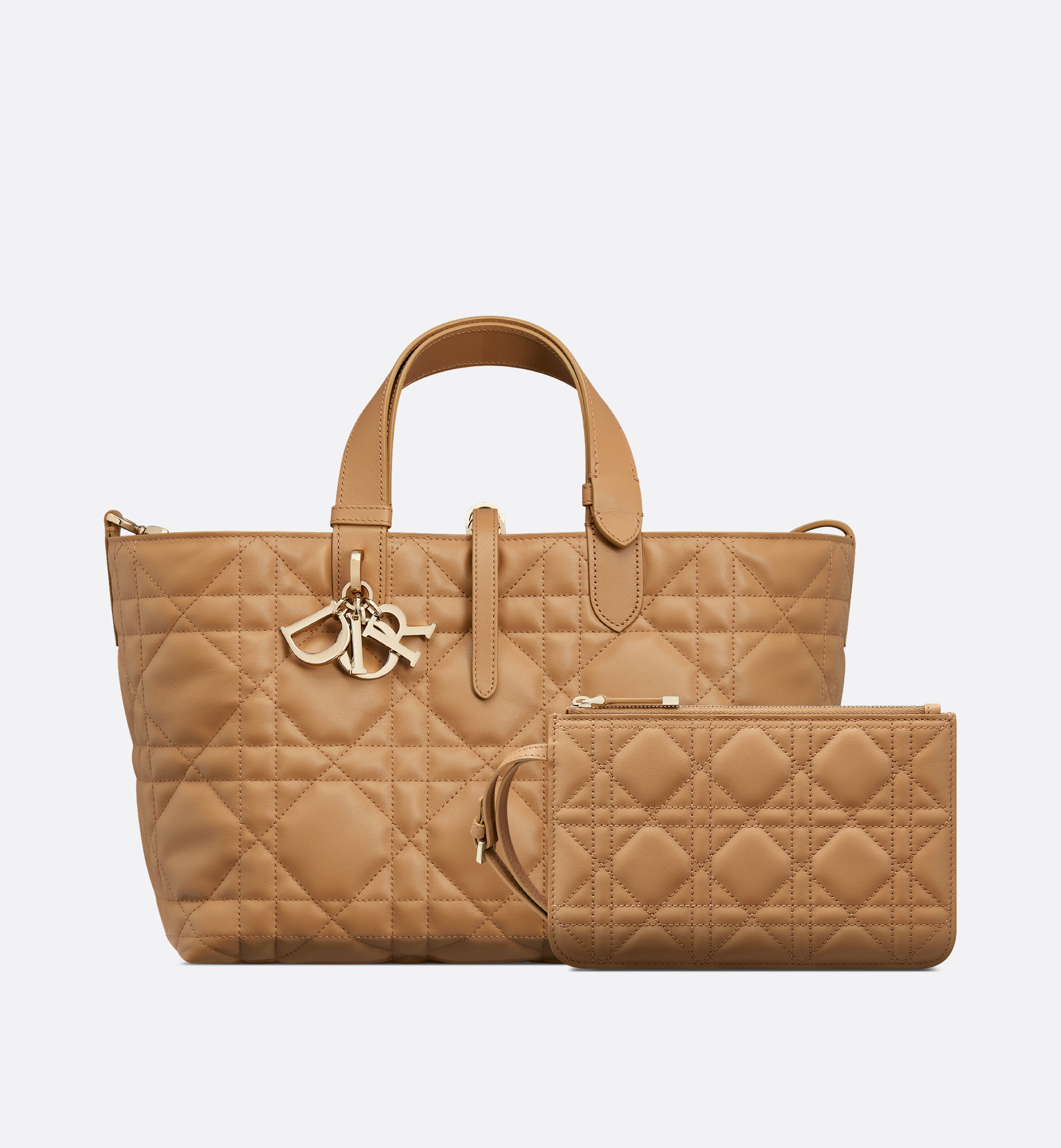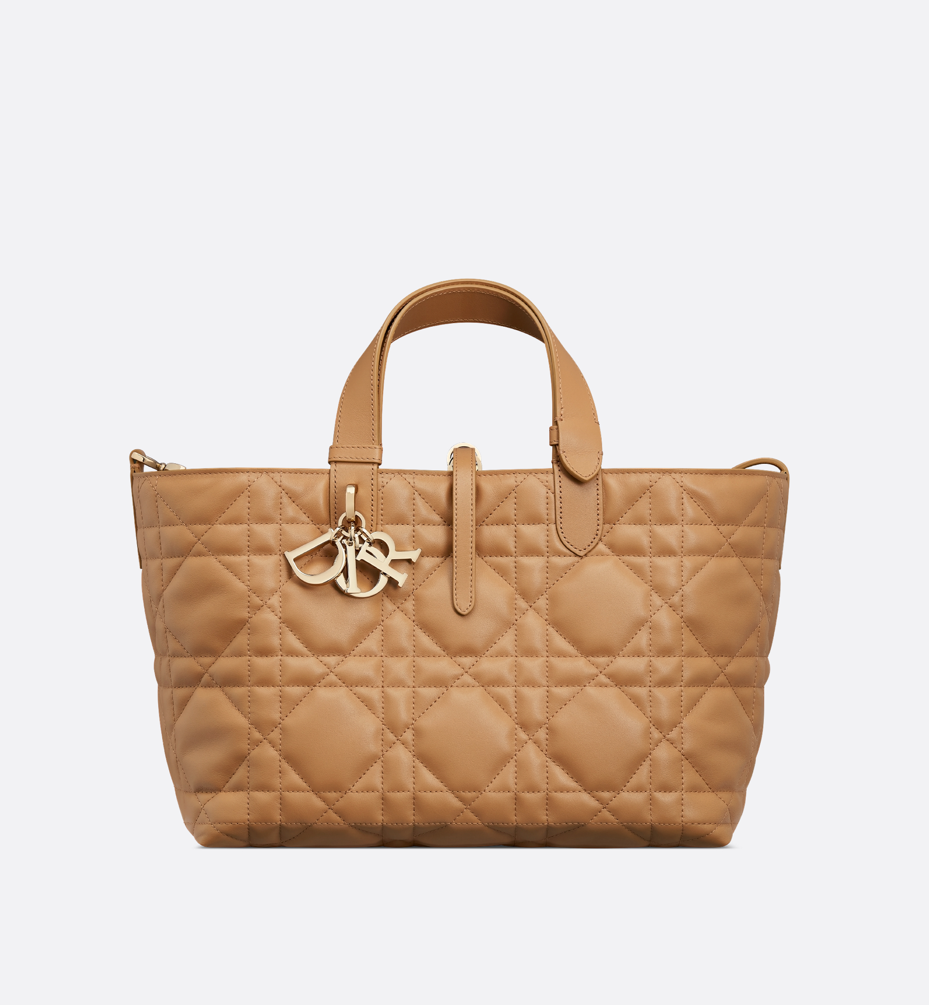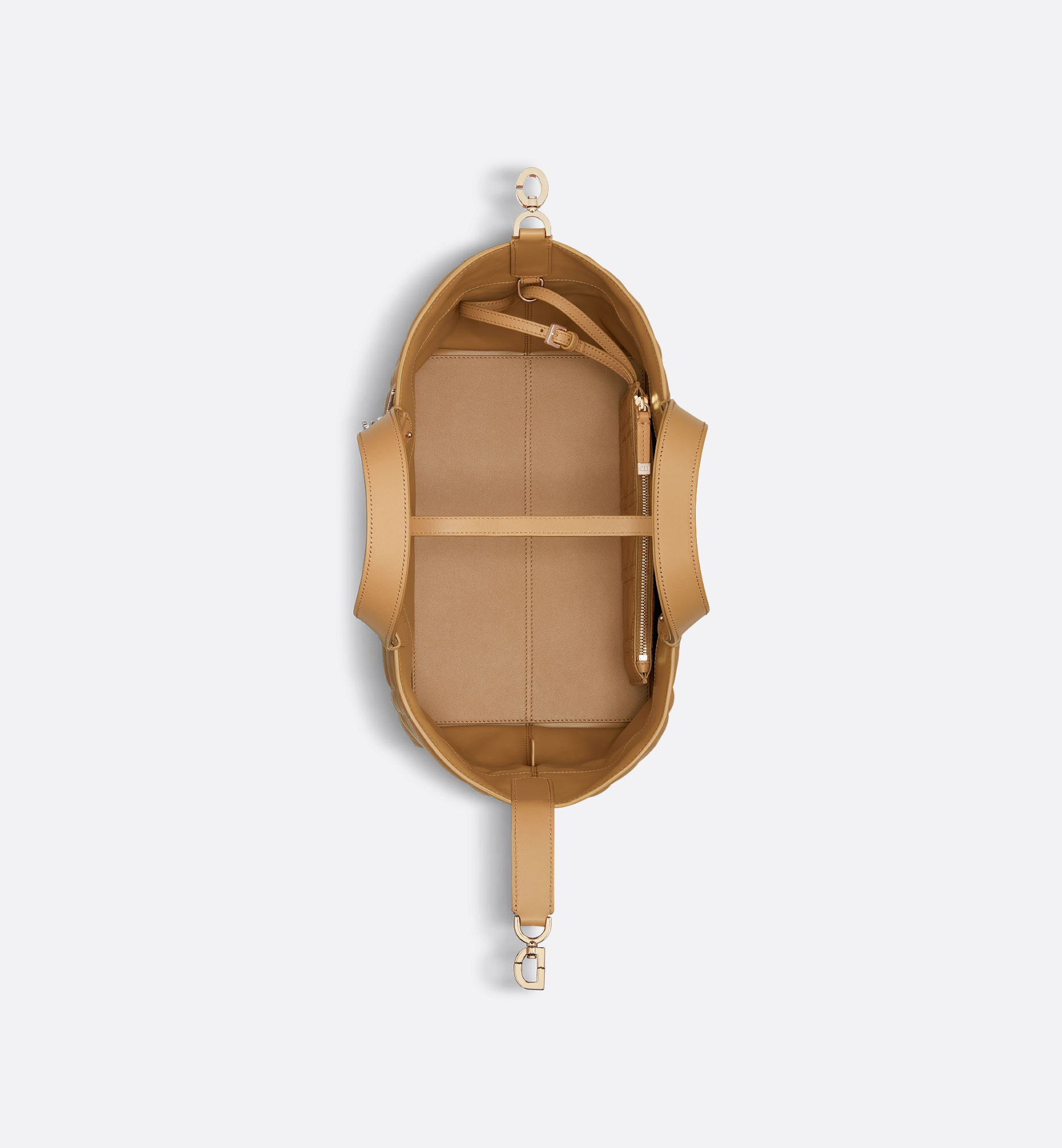The Dior Toujours bag is distinguished by a casual and practical design. Crafted in warm light gold-tone calfskin with Macrocannage topstitching, the style showcases a spacious interior compartment with a matching pouch to organize the essentials. Its thin leather strap closure keeps items secure while the D of the CD Lock clasp twists to adjust the sides and enhance the bag’s silhouette. The leather top handles can be adjusted using the small notches so the medium bag can be carried by hand or worn over the shoulder. Main composition: calfskin. Calfskin lining. Double closure: a thin lace-through strap and a Christian Dior Paris strap with a CD Lock clasp. Pale gold-finish metal D.I.O.R. charms. Removable interior pouch. Adjustable leather top handles. Dust bag included. Made in Italy