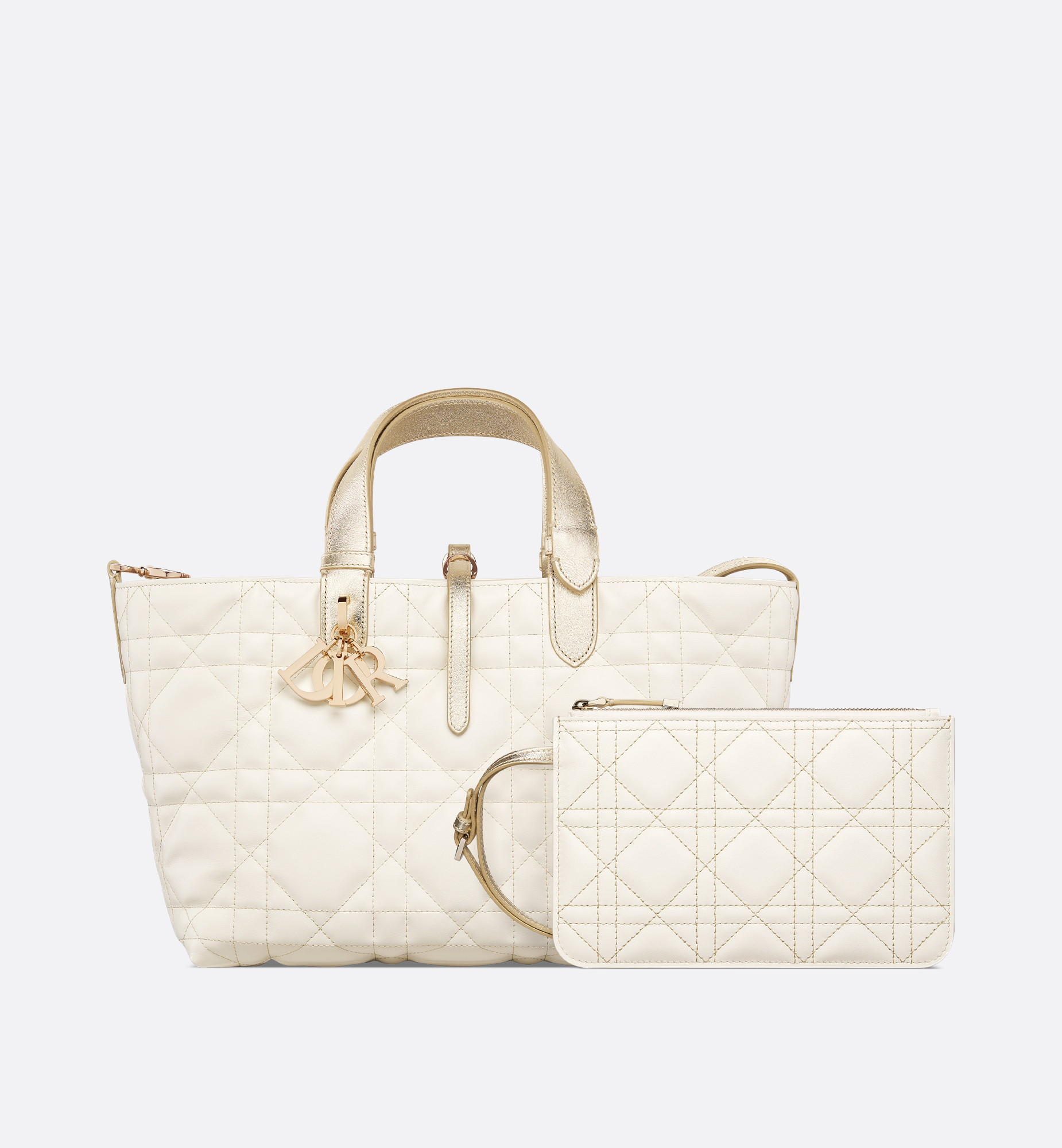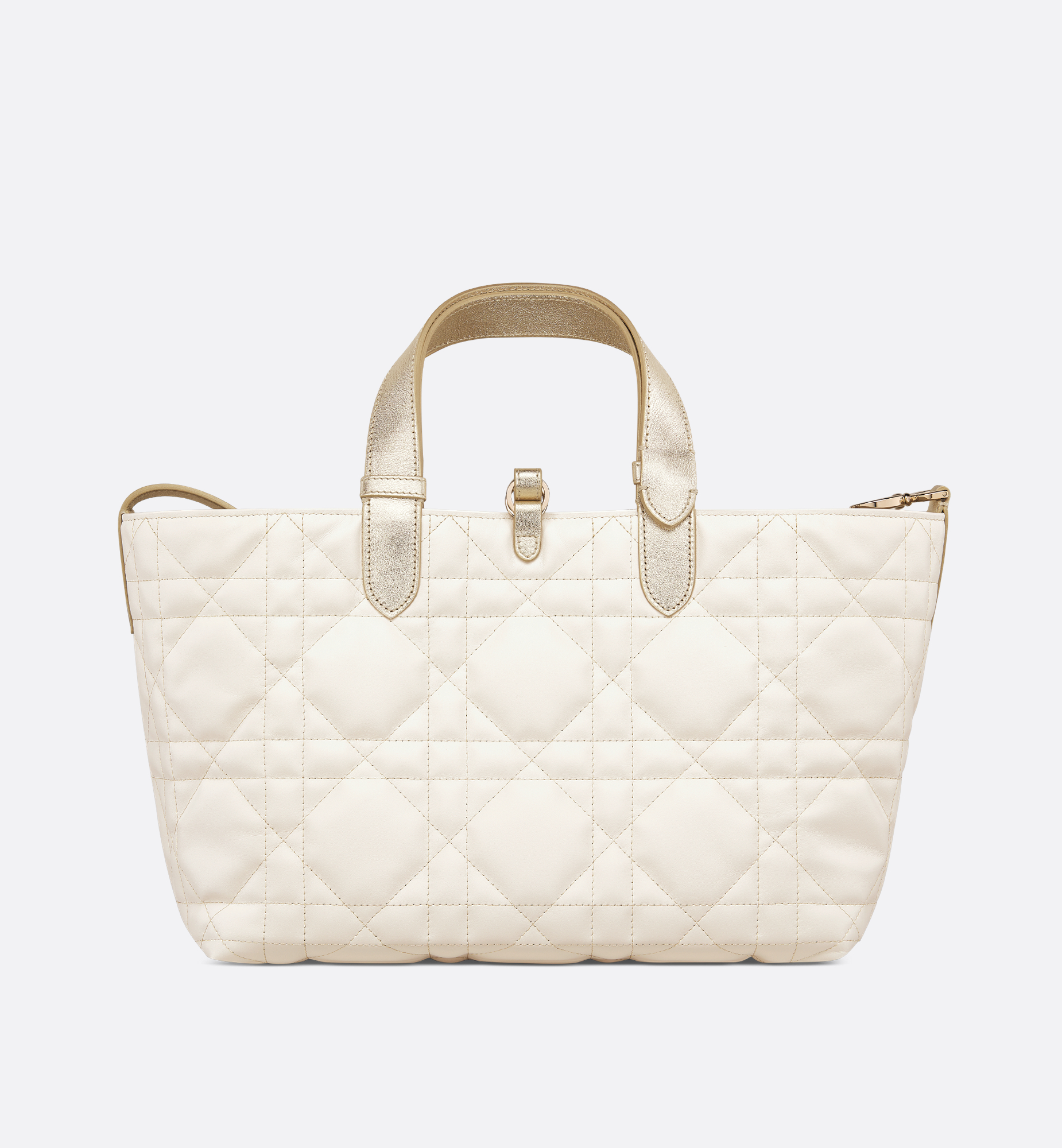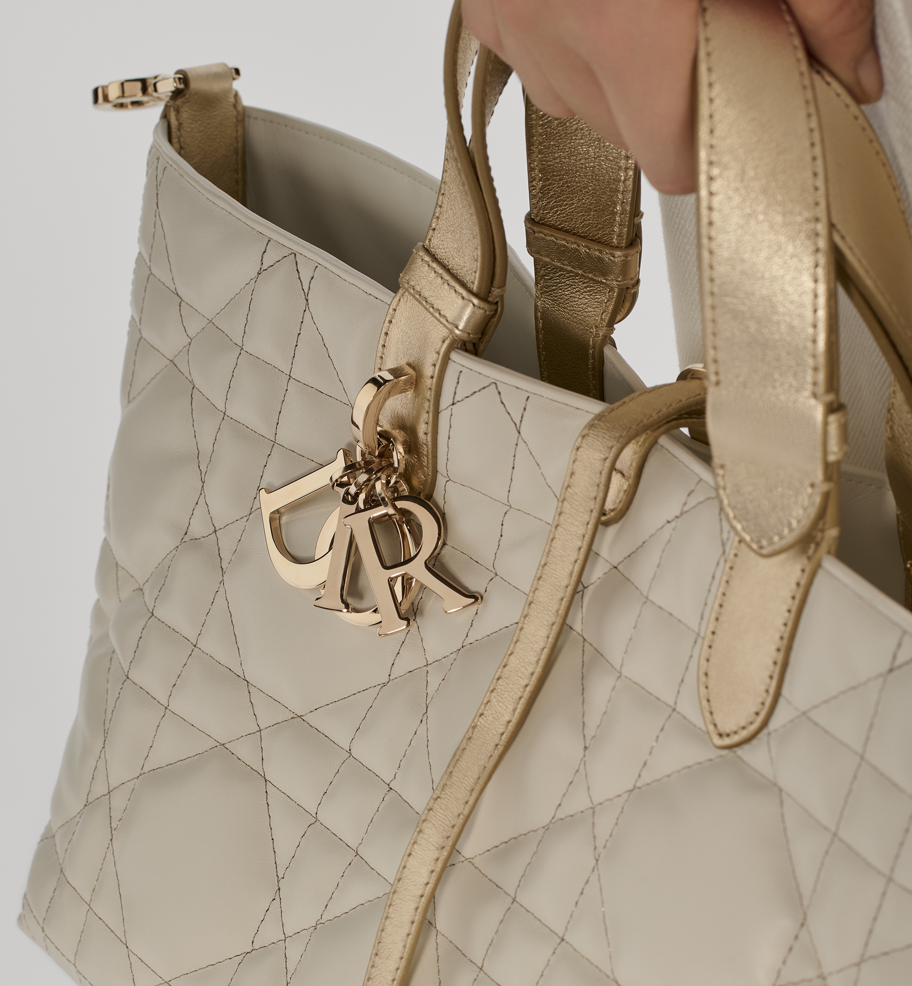 The Dior Toujours bag is distinguished by a casual and practical design. Crafted in calfskin, the two-tone gold and white style showcases Macrocannage stitching, reimagined with topstitching in subtly contrasting gold-tone metallic thread. The spacious interior compartment has a matching pouch to organize the essentials. Its thin leather strap closure keeps items secure while the D of the CD Lock clasp twists to adjust the sides and enhance the bag’s silhouette. The leather top handles can be adjusted using the small notches so the medium bag can be carried by hand or worn over the shoulder. Main composition: calfskin. Calfskin lining. Double closure: a thin lace-through strap and a Christian Dior Paris strap with a CD Lock clasp. Pale gold-finish metal D.I.O.R. charms. Removable interior pouch. Adjustable leather top handles. Dust bag included. Made in Italy