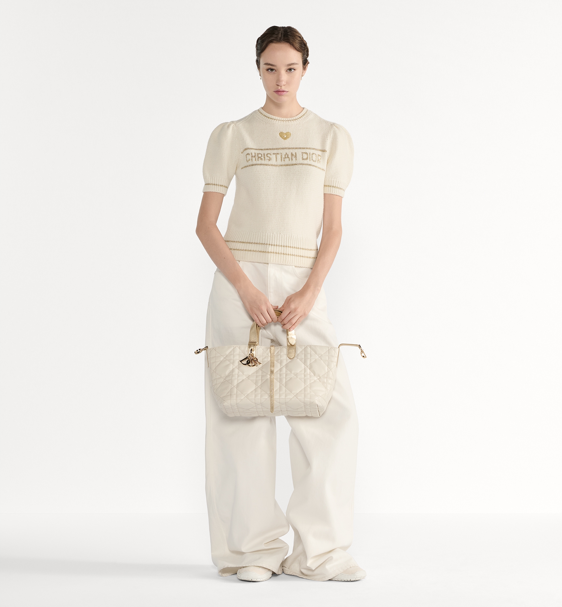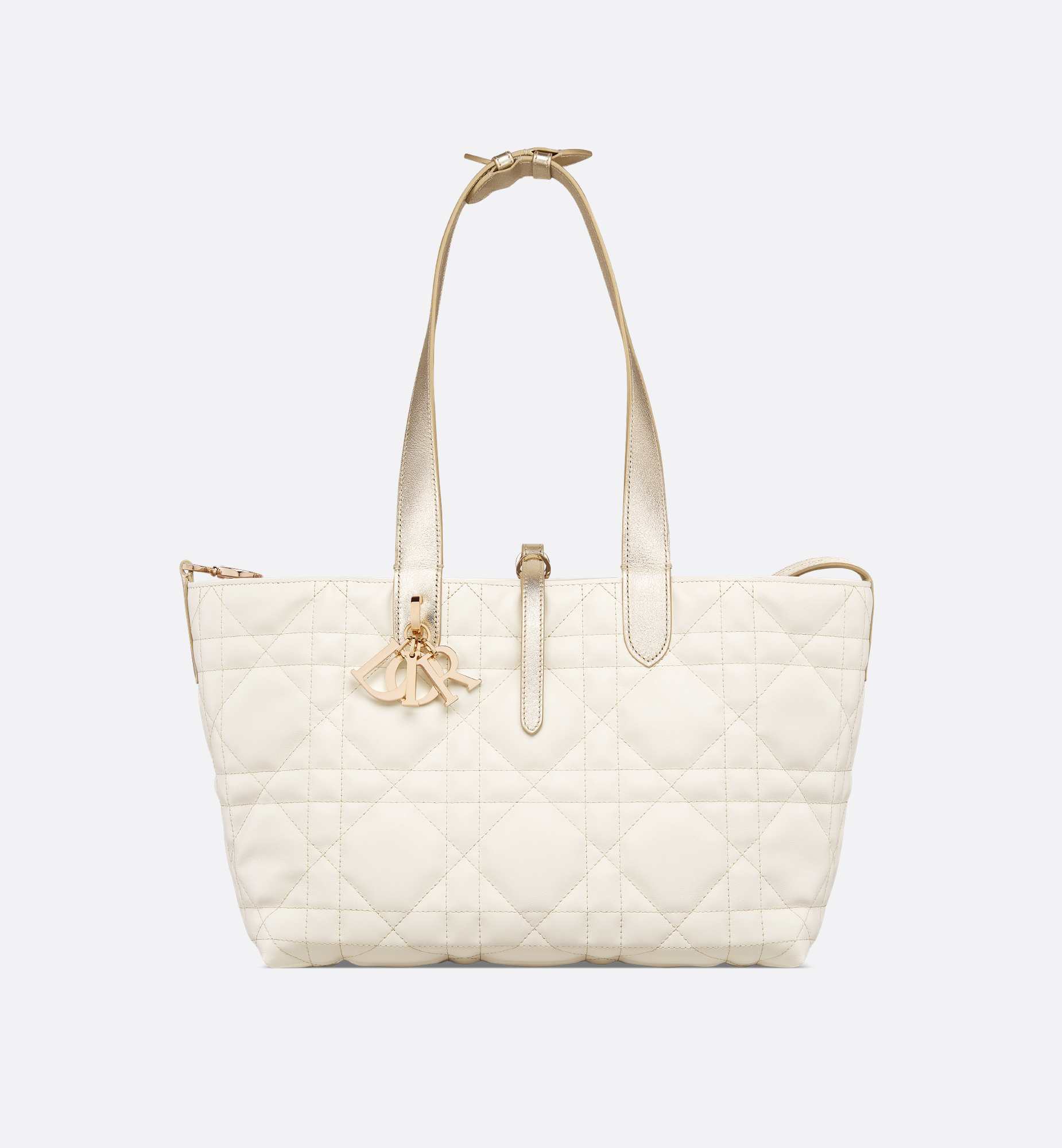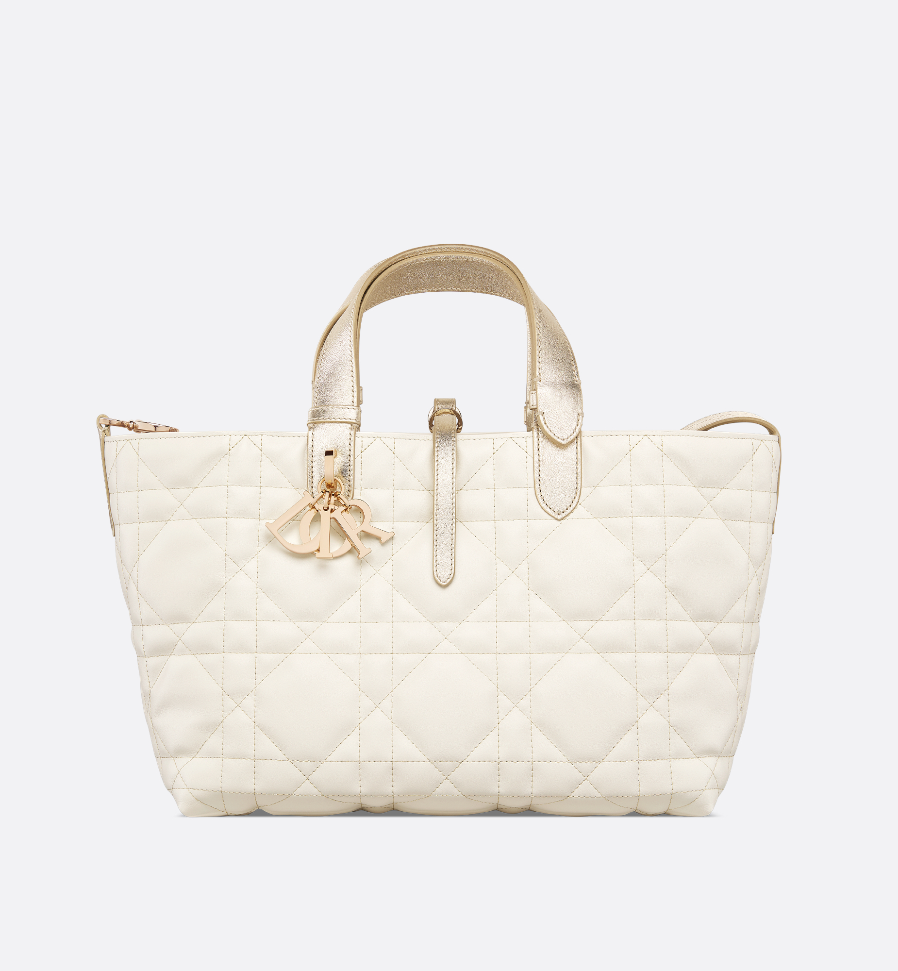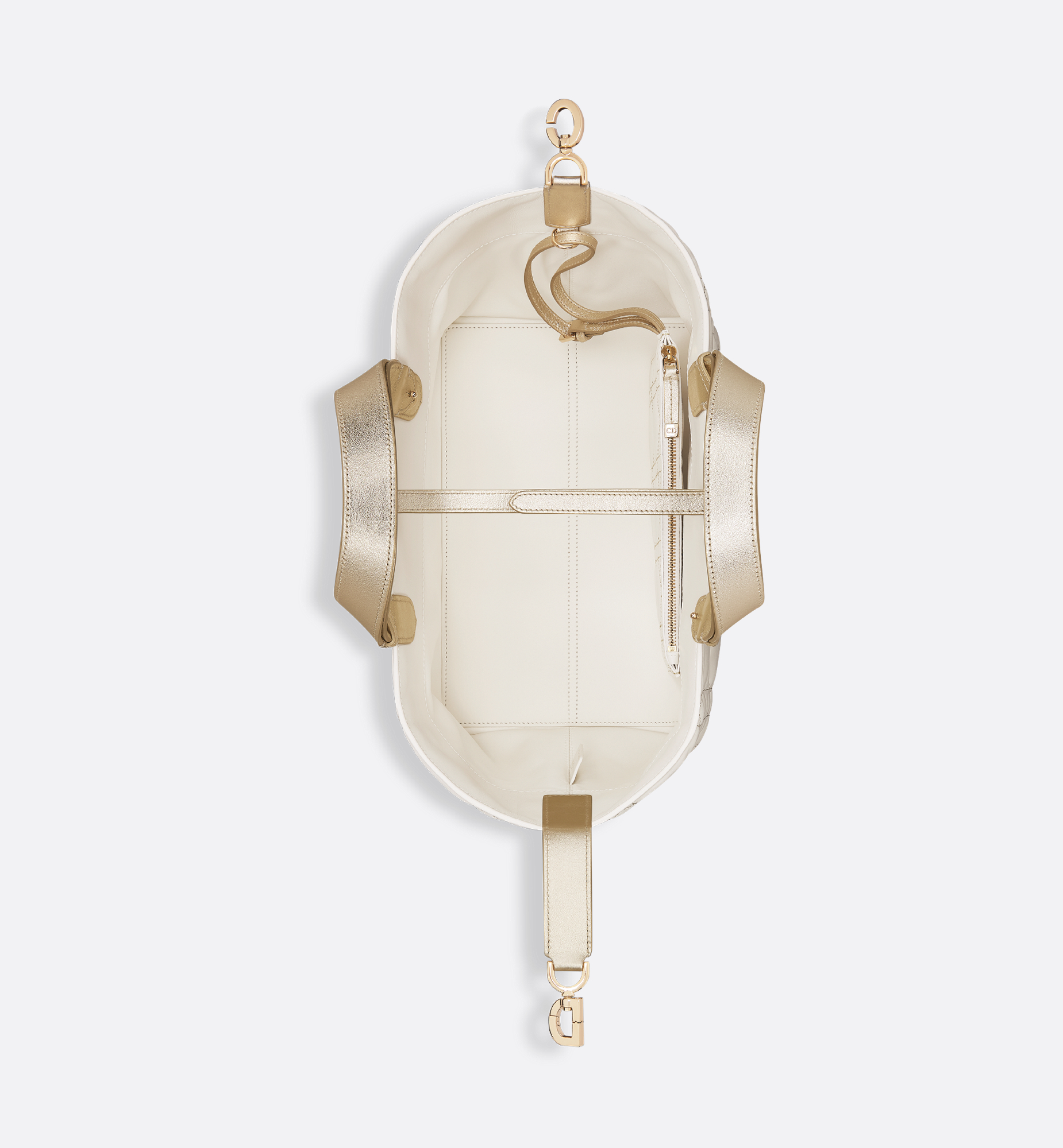 The Dior Toujours bag is distinguished by a casual and practical design. Crafted in calfskin, the two-tone gold and white style showcases Macrocannage stitching, reimagined with topstitching in subtly contrasting gold-tone metallic thread. The spacious interior compartment has a matching pouch to organize the essentials. Its thin leather strap closure keeps items secure while the D of the CD Lock clasp twists to adjust the sides and enhance the bag’s silhouette. The leather top handles can be adjusted using the small notches so the medium bag can be carried by hand or worn over the shoulder. Main composition: calfskin. Calfskin lining. Double closure: a thin lace-through strap and a Christian Dior Paris strap with a CD Lock clasp. Pale gold-finish metal D.I.O.R. charms. Removable interior pouch. Adjustable leather top handles. Dust bag included. Made in Italy