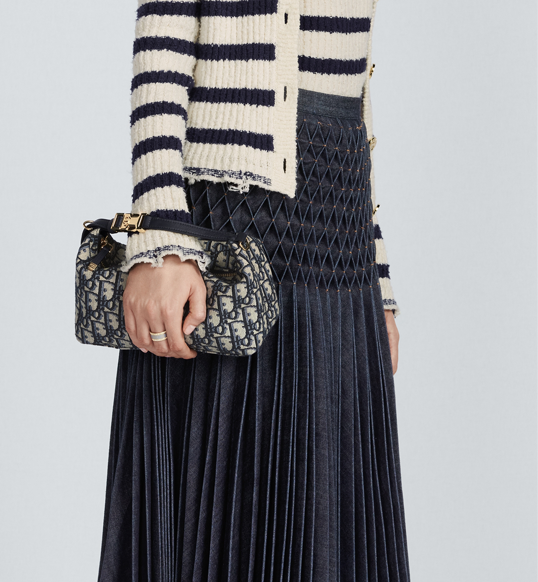 The DiorTravel Nomad pouch is a modern hybrid design. Crafted in blue Dior Oblique jacquard, it presents a spacious and flexible form that will accommodate all the essentials. The medium style can be carried by hand or worn over the shoulder thanks to the top handle, complete with a military-inspired CD buckle, while one of the House’s embroidered shoulder straps can be attached to the side rings. Main composition: cotton, lambskin and technical fabric. Cotton, linen and technical fabric lining. Zip closure. Adjustable top handle with CD buckle. Two metal rings to attach the embroidered shoulder straps and micro shoulder straps from the collection. Made in Italy