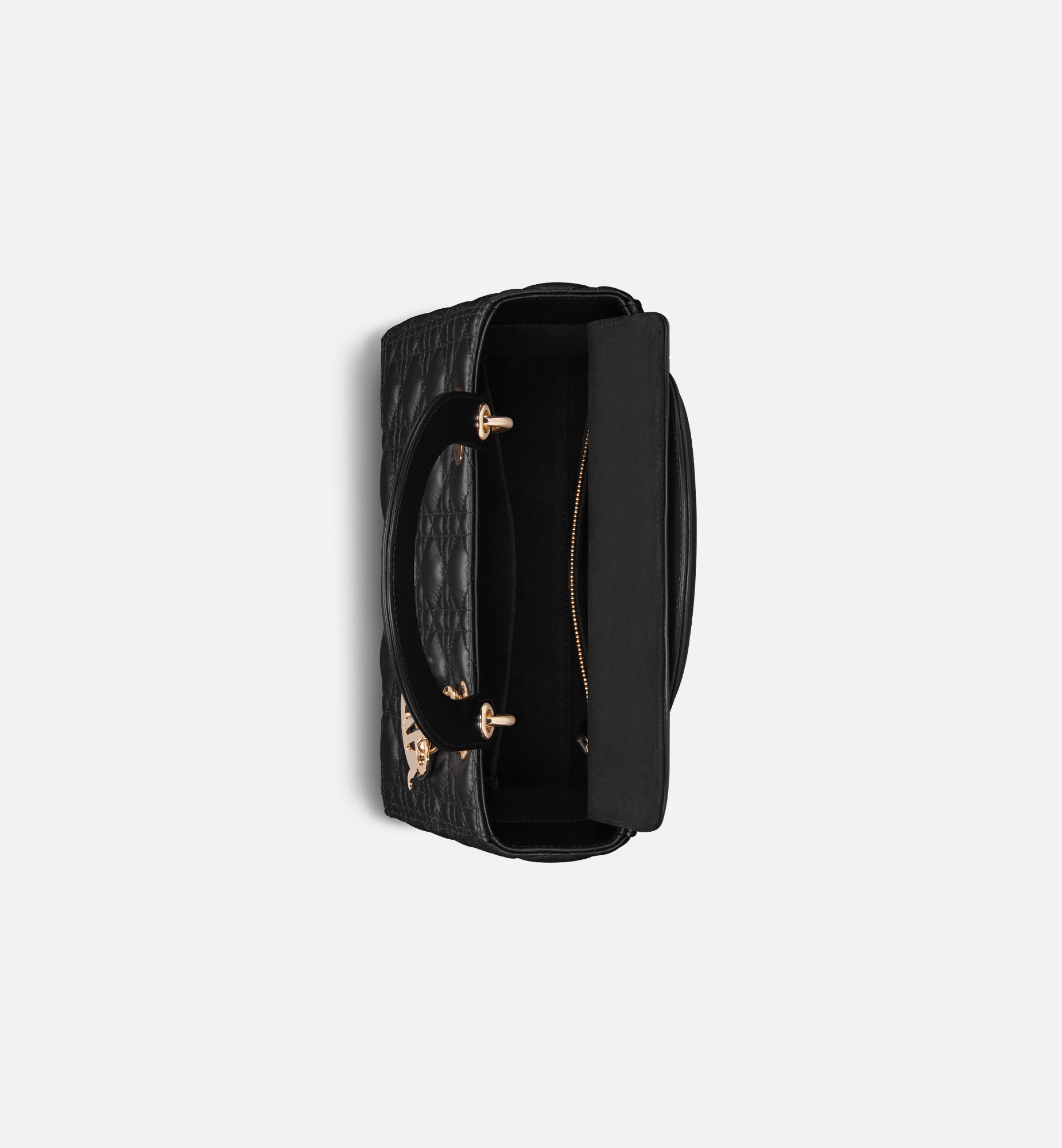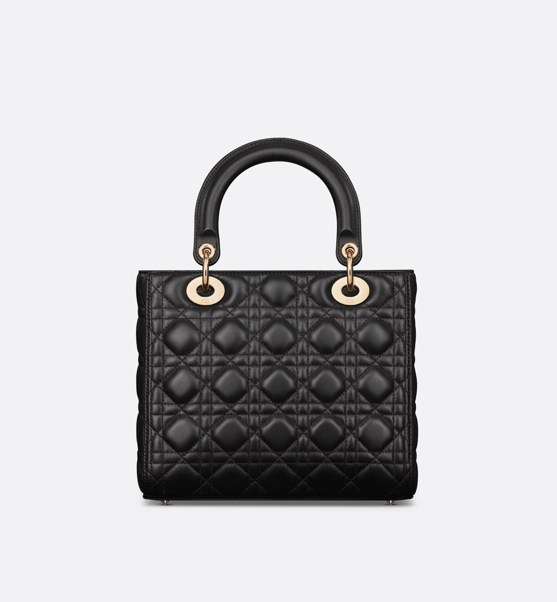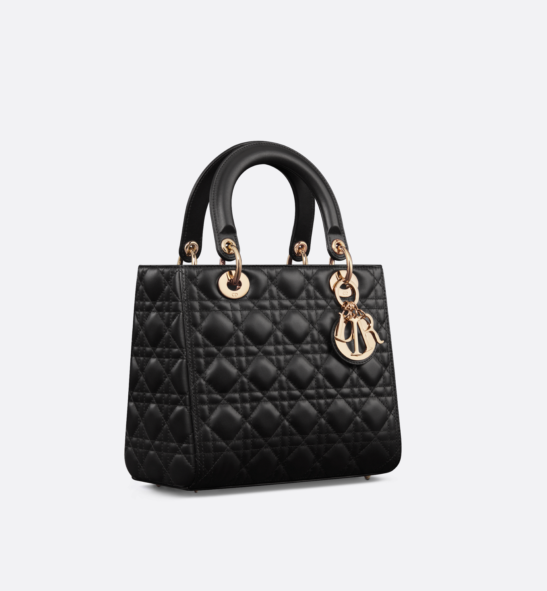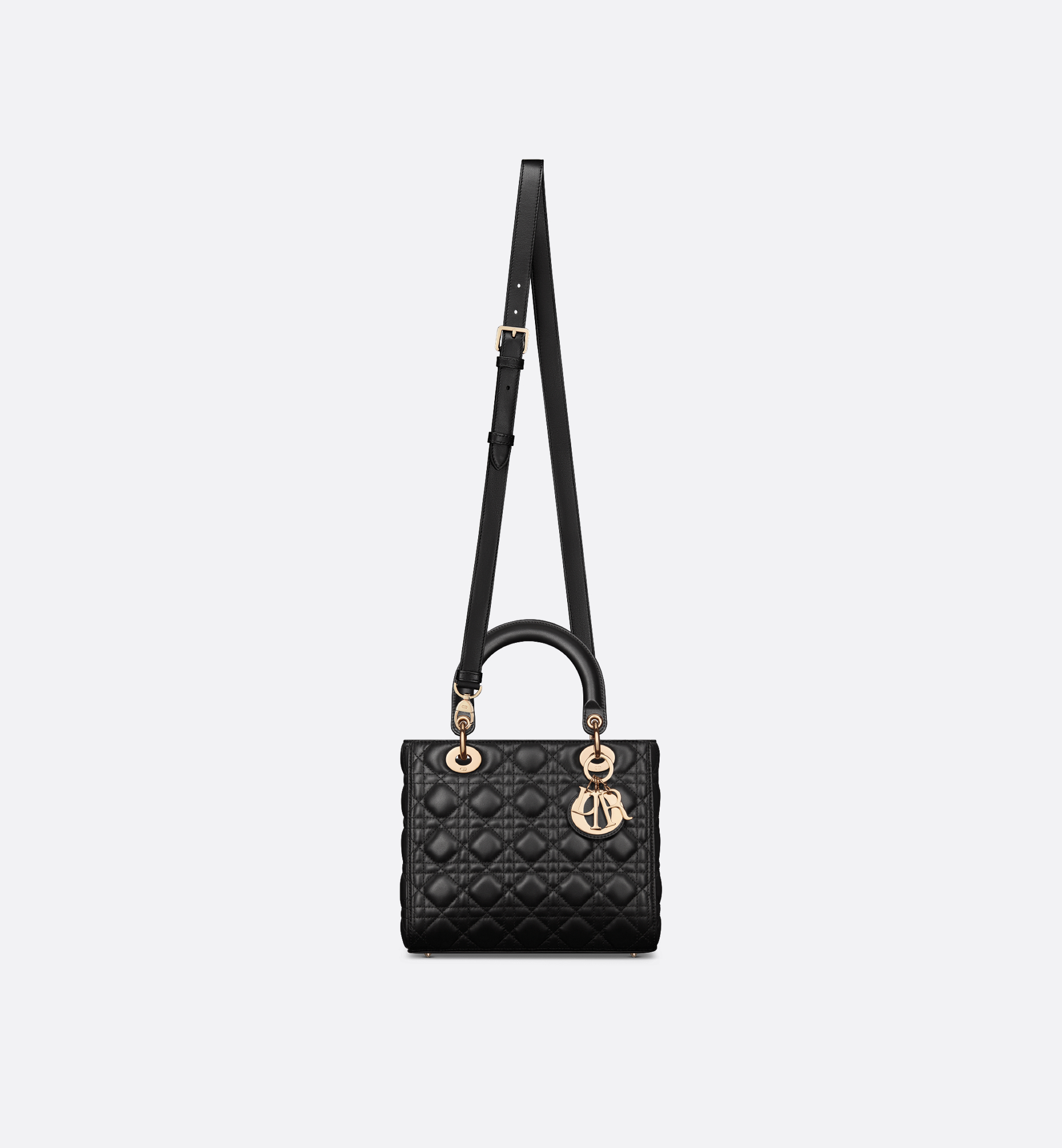 The Lady Dior bag epitomizes the House’s vision of elegance and beauty. Sleek and refined, the timeless creation is crafted in black lambskin with Cannage stitching, creating the instantly recognizable quilted texture. Pale gold-finish metal D.I.O.R. charms offer elegant appeal. Featuring a thin, removable leather shoulder strap, the medium Lady Dior bag can be carried by hand or worn crossbody. Main composition: lambskin. Goatskin and lambskin lining. Thin, adjustable and removable shoulder strap. Interior zip pocket. Large slip pocket. The bag may be paired with the House’s different embroidered straps. Dust bag included. Made in Italy