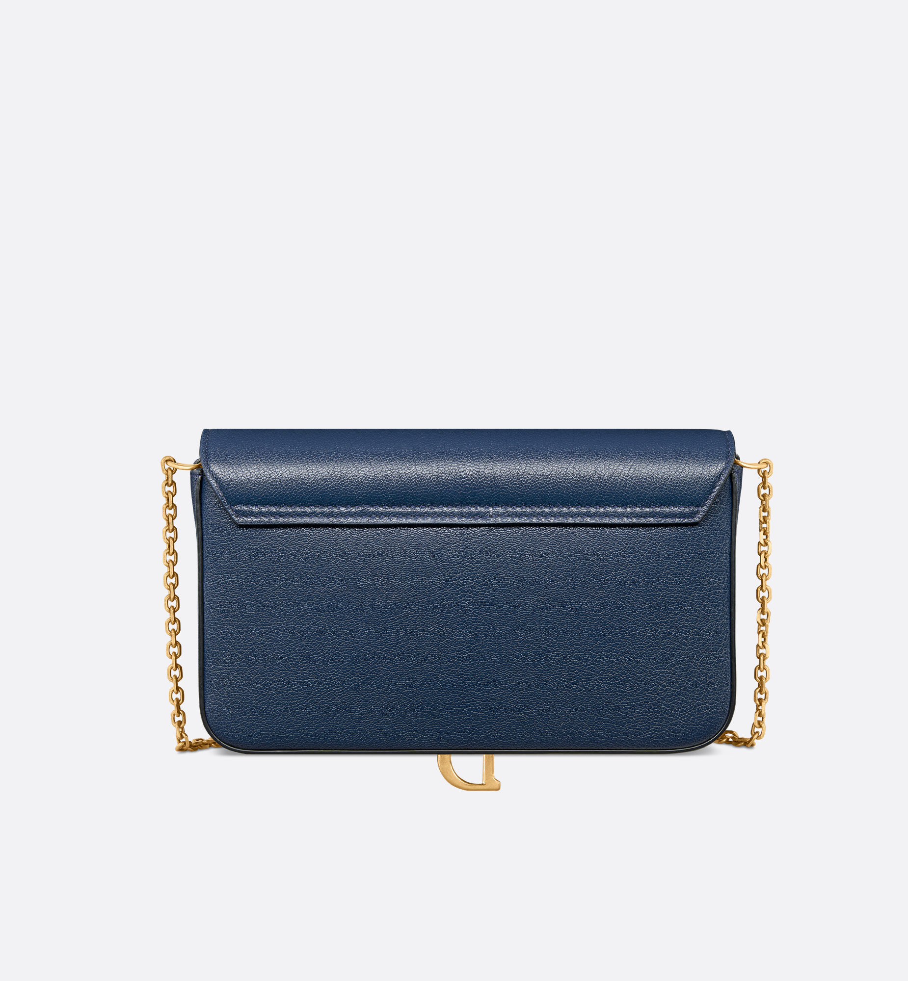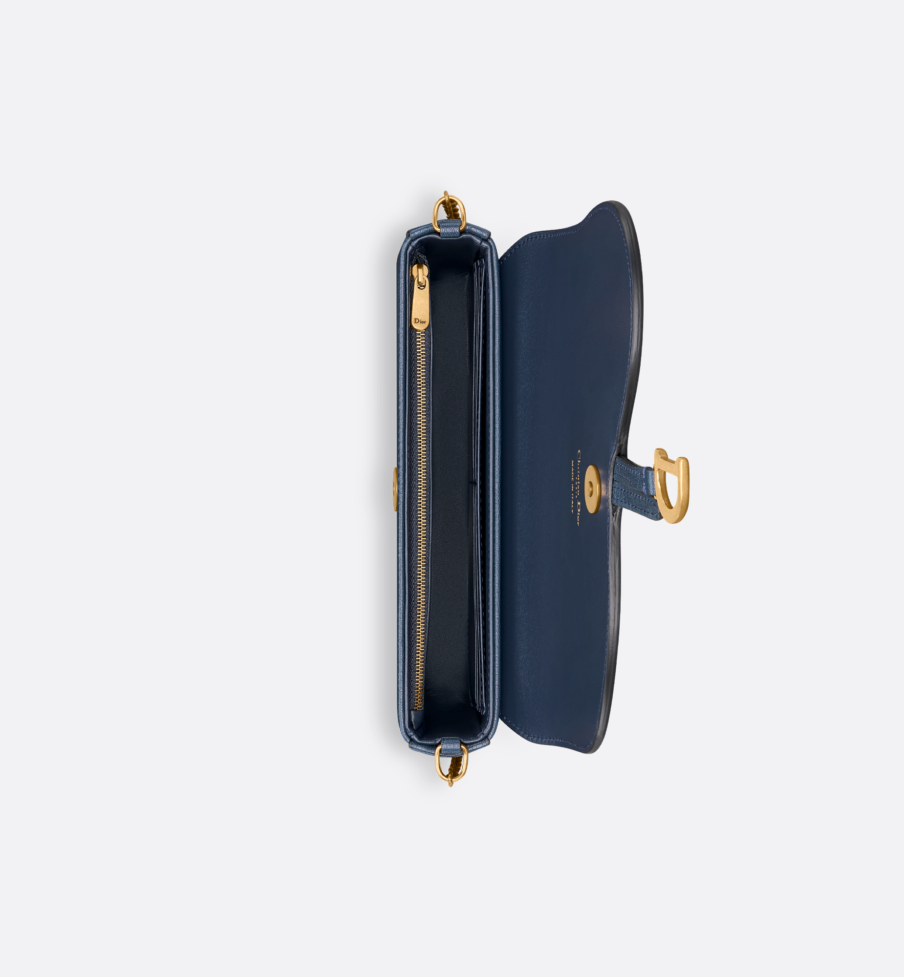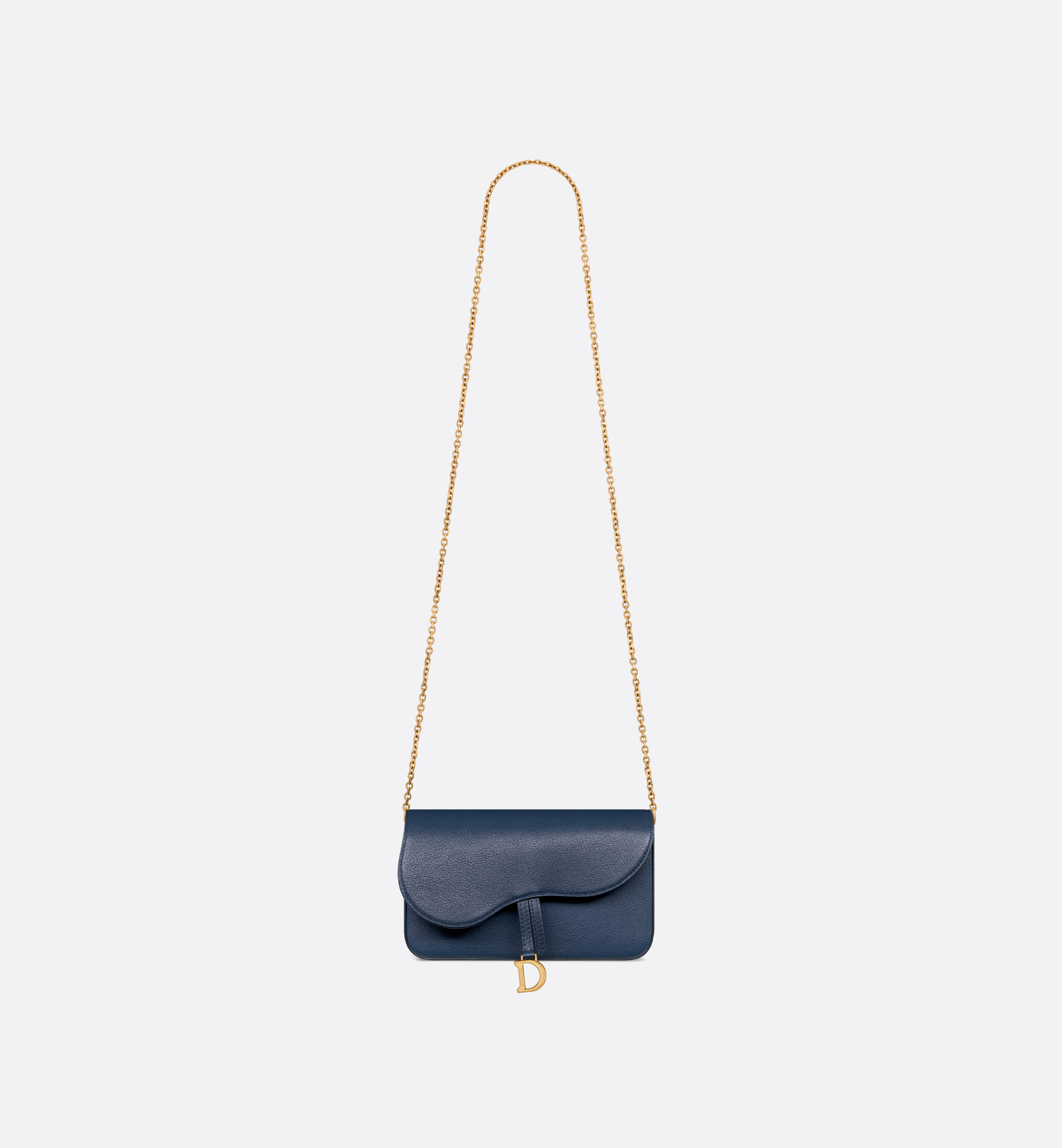 The medium Saddle pouch with chain is a modern and practical design with smooth and harmonious lines. Crafted in deep ocean blue goatskin, it features an asymmetric flap and an antique gold-finish metal D stirrup. The spacious interior will accommodate all the essentials, while the chain allows it to be worn over the shoulder or crossbody. The pouch can be paired with other Saddle creations. Main composition: goatskin. Lambskin and technical fabric lining. Flap closure. Front D stirrup. One compartment. Six card slots. One slip pocket. One zip pocket. Made in Italy