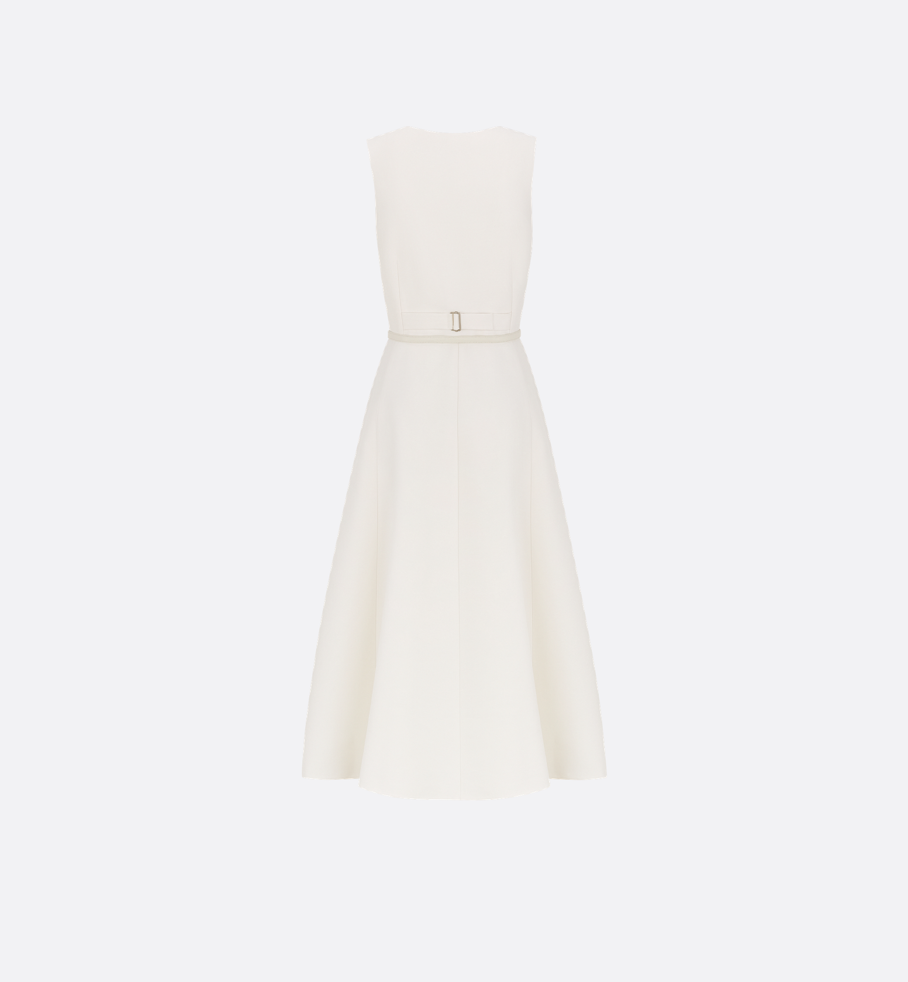 A hallmark Dior silhouette, the mid-length dress celebrates the House’s tailoring spirit. Crafted in white lightweight wool and silk shantung, it features an elegant, flared cut enhanced by a tonal belt highlighting the waist as well as by a tonal covered-button closure. Completed by piped pockets on the front, the dress will create a couture look. Tonal belt. Front button closure. Tonal covered buttons. Rear adjustment tab. Tonal lining. 84% wool, 16% silk and lining: 100% silk. Made in France