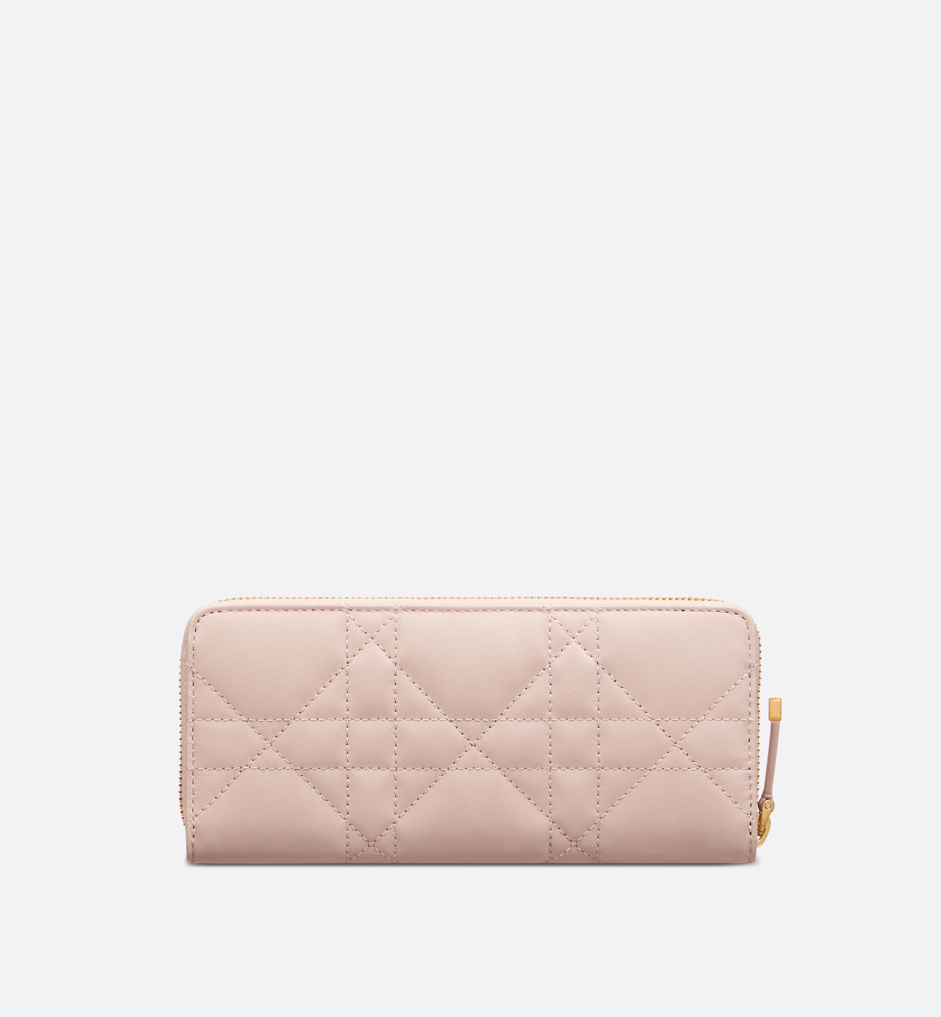 The Miss Caro Voyageur slim wallet features an elegant and practical design. Crafted in powder pink lambskin, it is enhanced by a Macrocannage quilted effect and accented by an antique gold-finish metal CD signature on the front. The chic and spacious companion can accommodate daily essentials. It can be coordinated with other accessories from the same line and will fit into any bag. Main composition: lambskin. Lambskin and technical fabric lining. CD signature on the front. Two compartments. Eight card slots. Two slip pockets. One zip pocket. Made in Italy