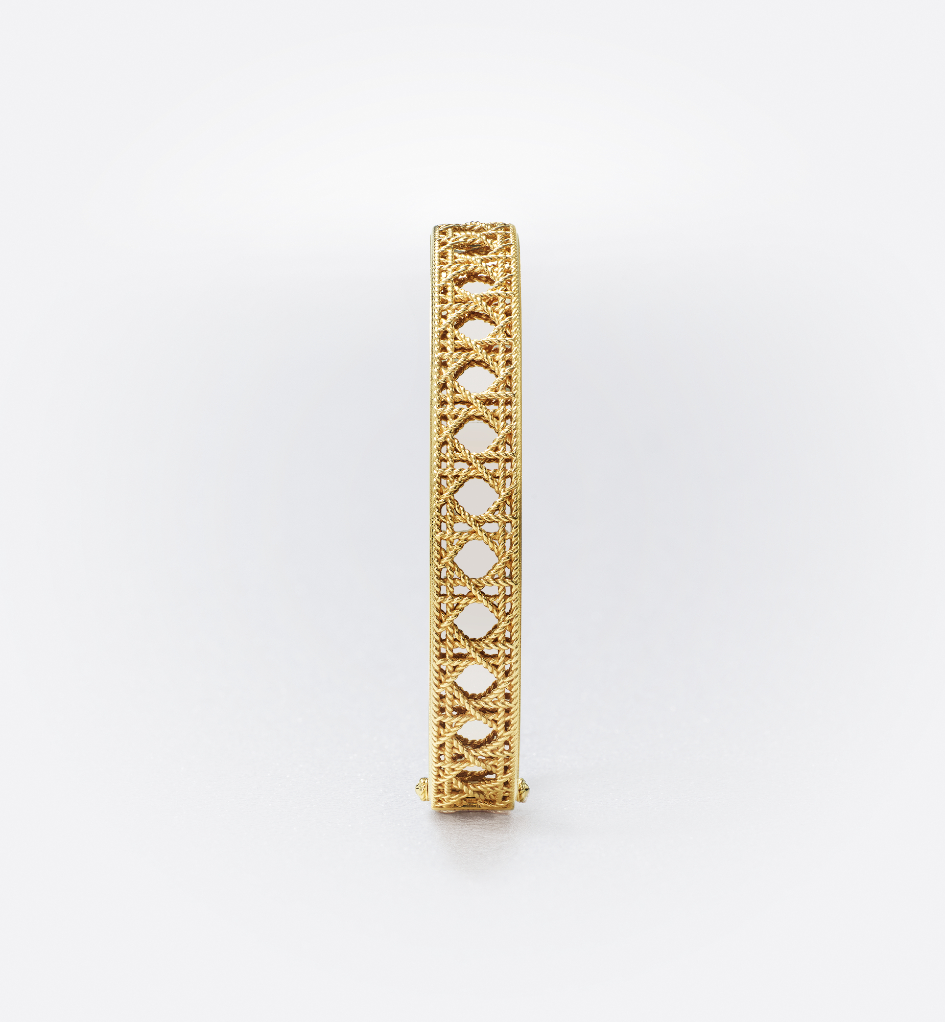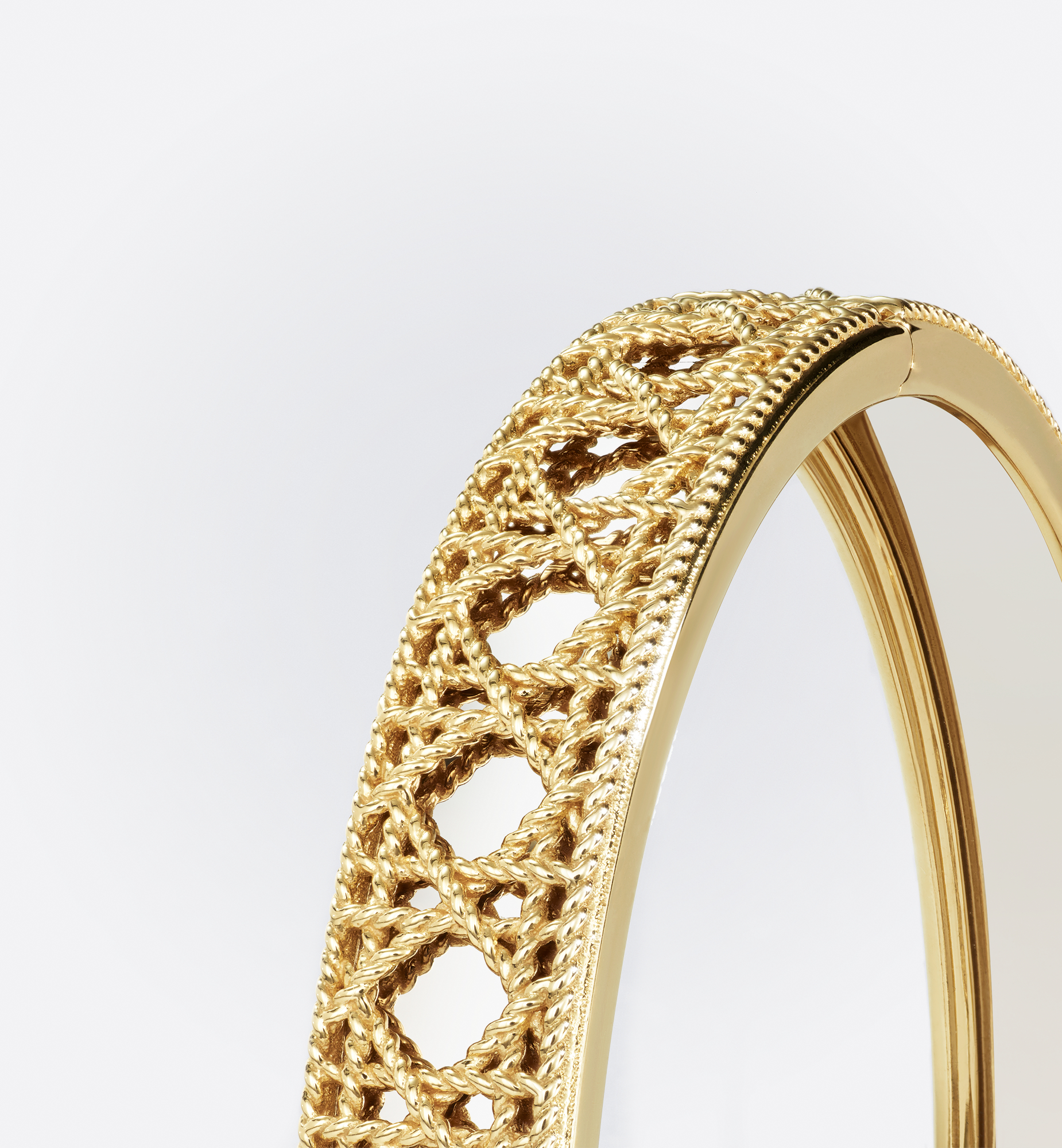 The My Dior collection by Victoire de Castellane is reinvented with a series of infinitely precious jewelry pieces. In an ode to the art of detail, a tangle of golden threads is woven together like meticulously interlaced sprigs of straw into a subtle mesh, revealing the iconic Cannage, accented by a strip of shiny gold. The craftsmanship is an homage to Dior’s refined style. Combining shades of gold, the My Dior design highlights the radiance of white gold, while the iconic Cannage lines appear in yellow gold for a luminous and quintessential Dior style. 18K yellow gold, 18K white gold. We recommend styling My Dior bracelets together to create a unique look. The bracelets also pair well with creations from the My Dior collection