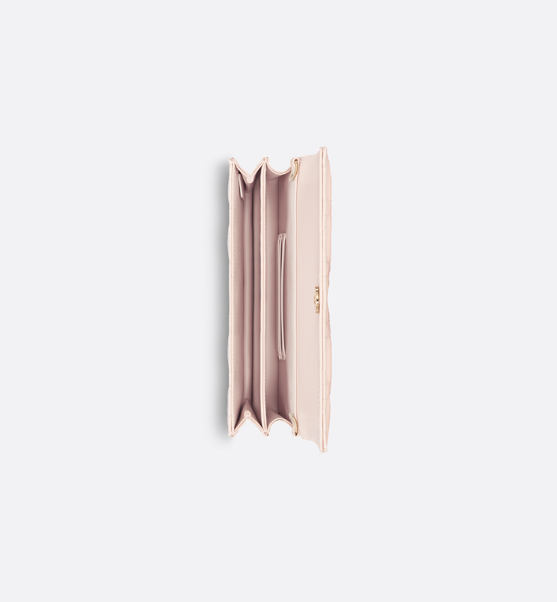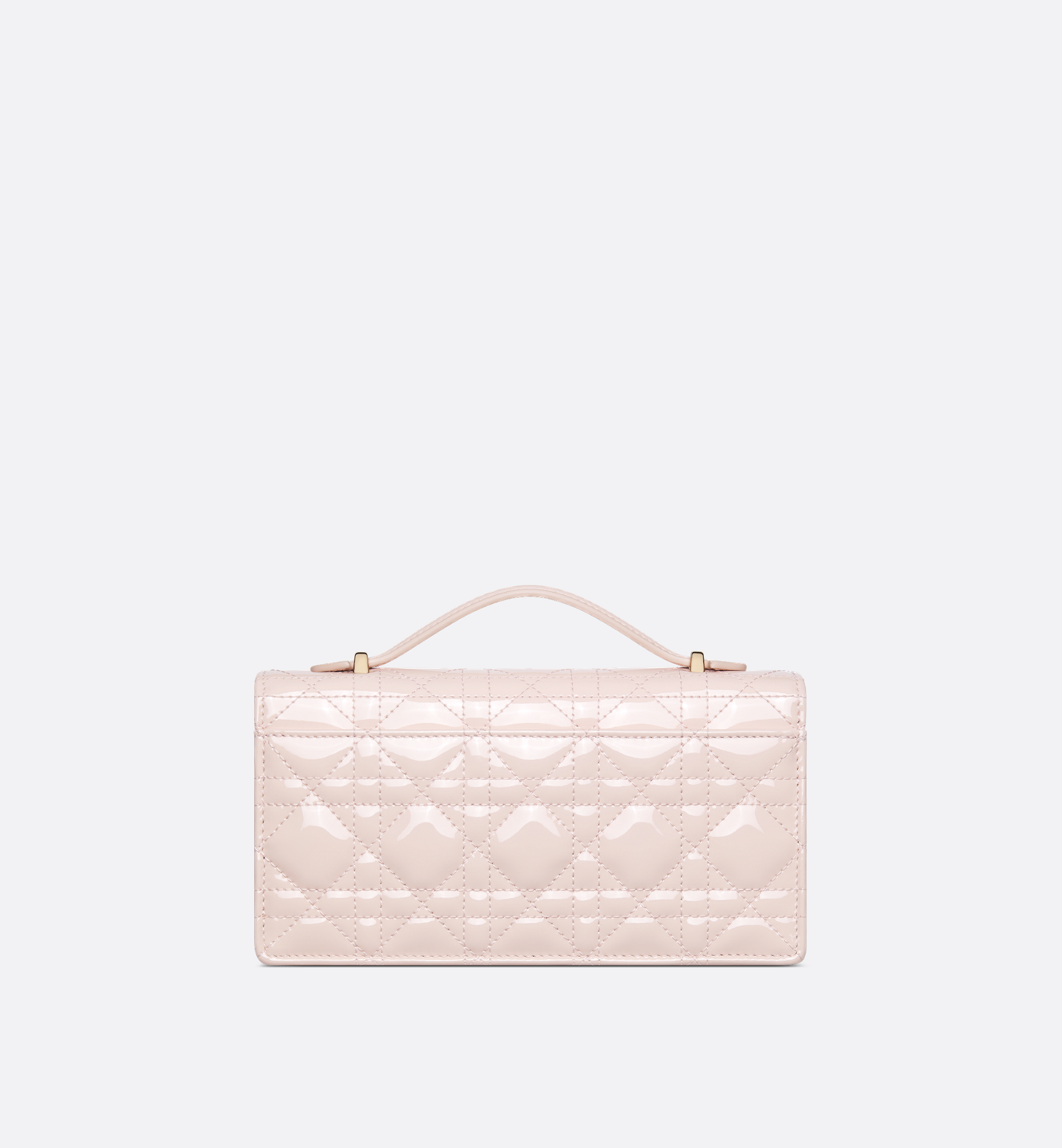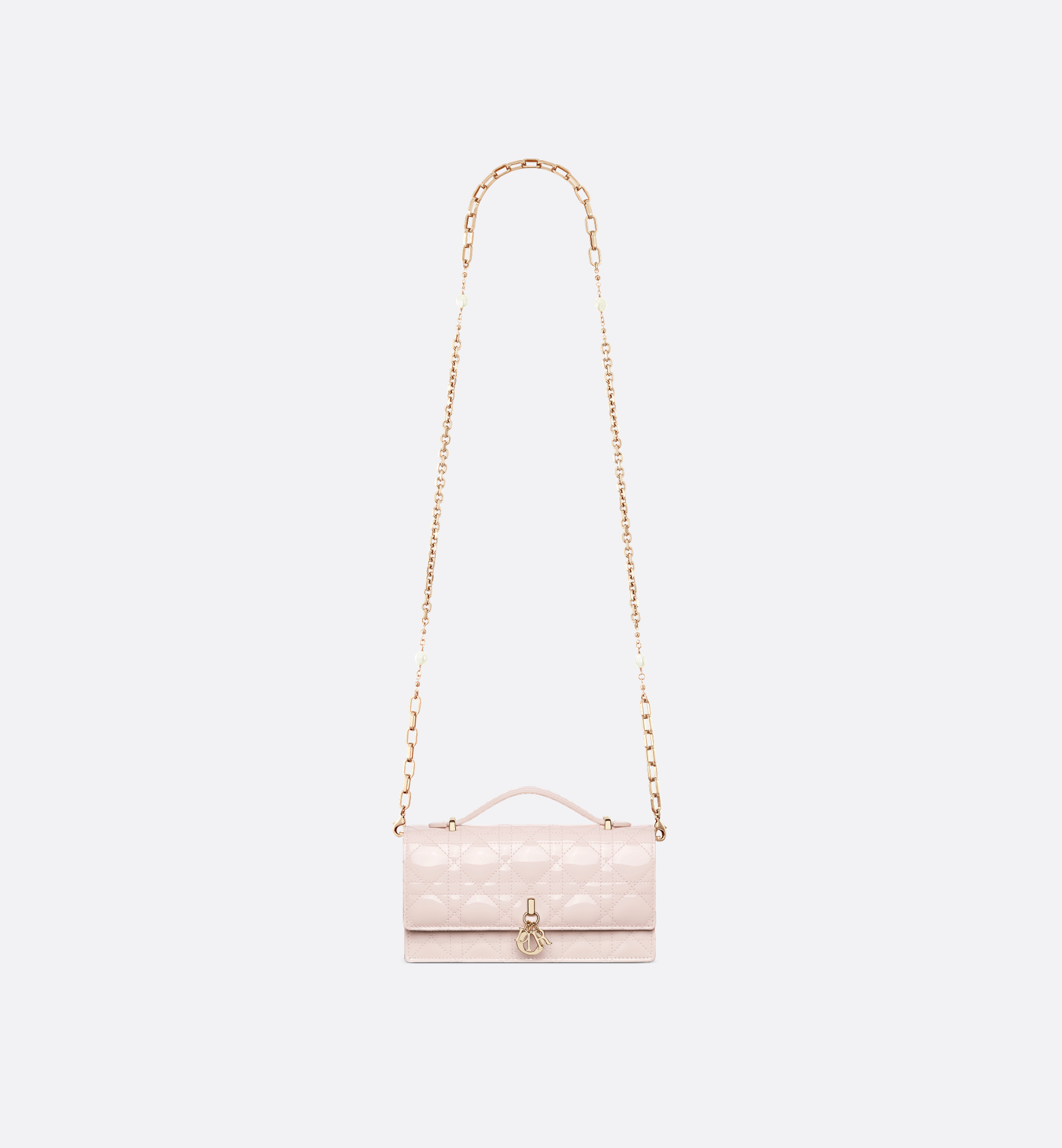 The My Dior mini bag elevates the line with an elegant and functional design. Crafted in powder pink patent calfskin with Cannage stitching, it features a flap enhanced by D.I.O.R. charms on the front. Equipped with compartments and card slots, the functional accessory will hold all the essentials and is the ideal day and evening companion. A top handle completed by a removable chain punctuated with resin pearls allows the bag to be carried by hand or worn crossbody. Main composition: calfskin. Lambskin and technical fabric lining. Front D.I.O.R. charms. Flap closure. Two interior compartments. Rear slip pocket. Three card slots. Folding leather top handle. Removable jewel chain. Made in Italy