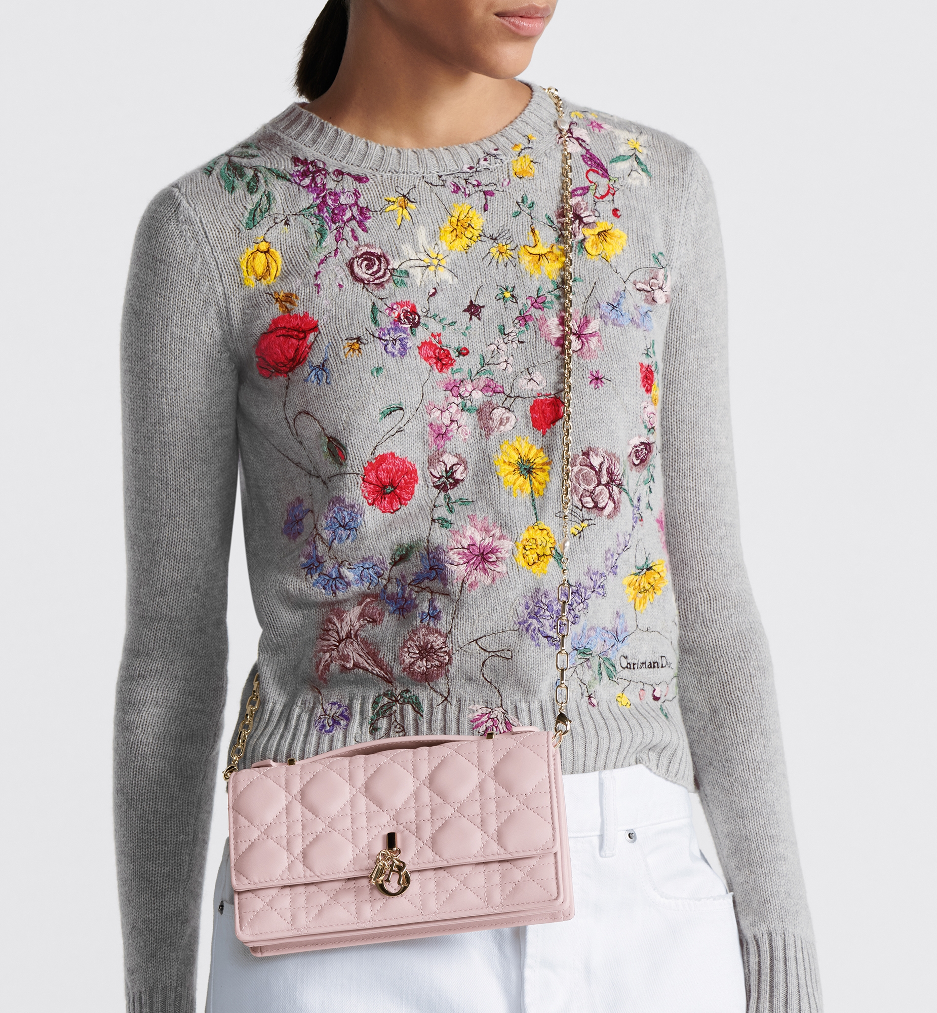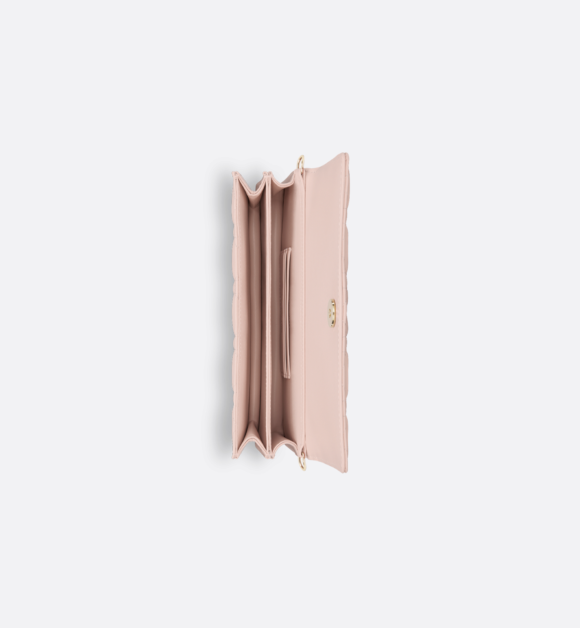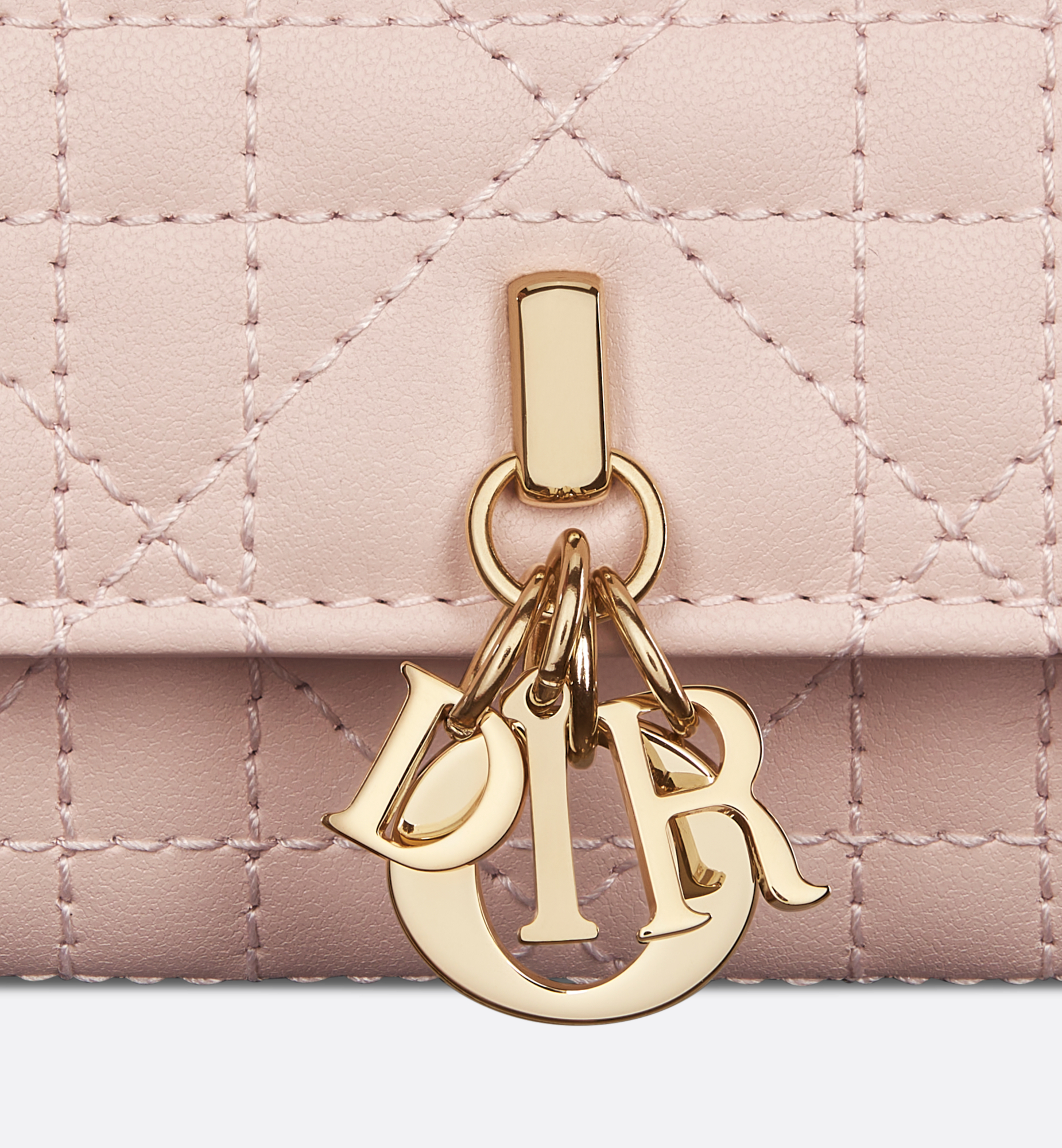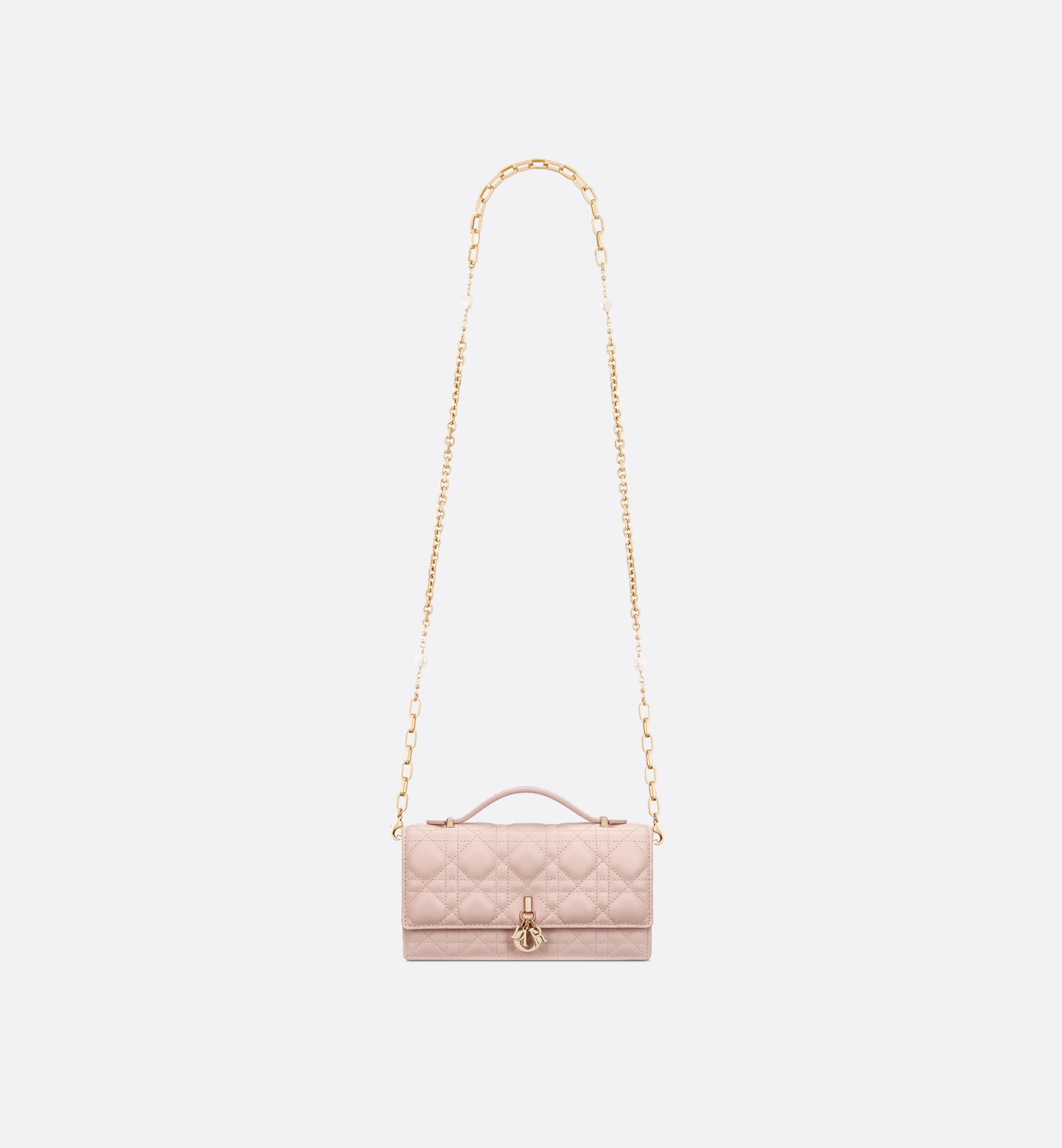 The My Dior mini bag expands the line with an elegant and functional design. Crafted in powder pink Cannage lambskin, it features a flap enhanced by D.I.O.R. charms on the front. Equipped with compartments and card slots, the functional accessory will hold any essentials and is the ideal day and evening companion. A top handle completed by a removable chain punctuated with resin pearls allows the bag to be carried by hand or worn crossbody. Main composition: lambskin. Lambskin and technical fabric lining. Front D.I.O.R. charms. Flap closure. Two interior compartments. Rear slip pocket. Three card slots. Folding leather top handle. Removable jewel chain. Made in Italy