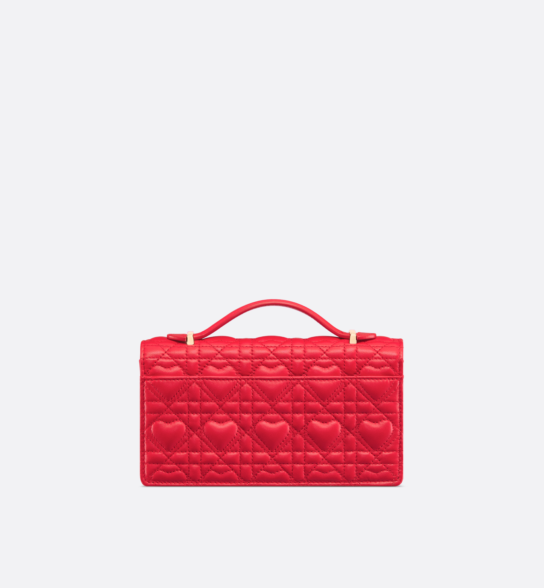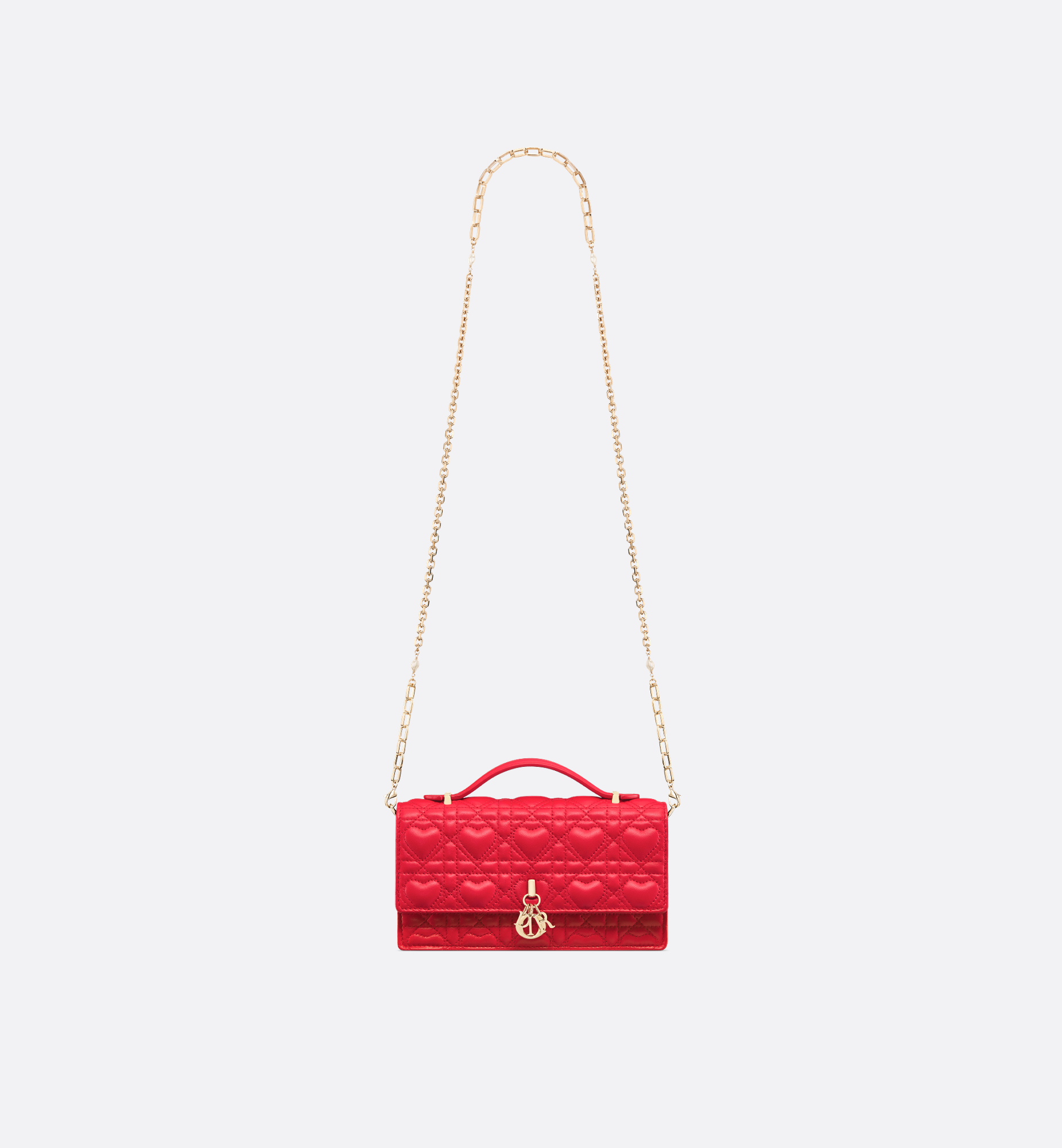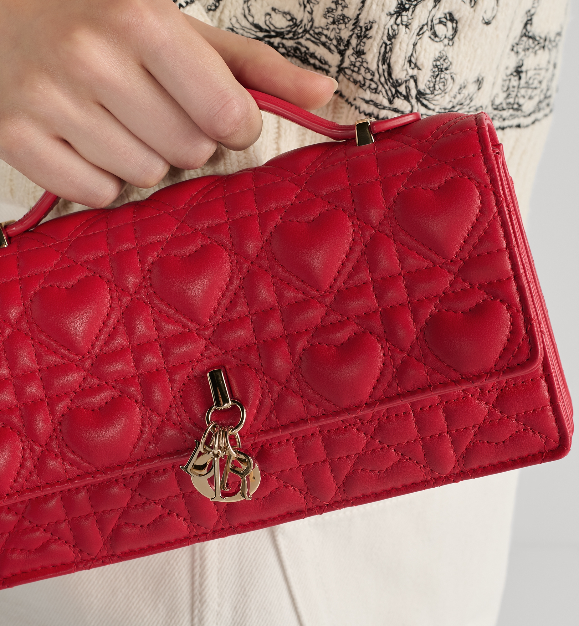 The My Dior mini bag elevates the line with an elegant and functional design. Crafted in Monsignore red lambskin with Cannage stitching enhanced by a heart motif, it features a flap with D.I.O.R. charms on the front. Equipped with compartments and card slots, the practical accessory will hold all the essentials and be the ideal day and evening companion. A top handle completed by a removable chain punctuated with resin pearls allows the bag to be carried by hand or worn crossbody. Main composition: lambskin. Lambskin and technical fabric lining. Front D.I.O.R. charms. Flap closure. Two interior compartments. Rear slip pocket. Three card slots. Folding leather top handle. Removable jewel chain. Made in Italy