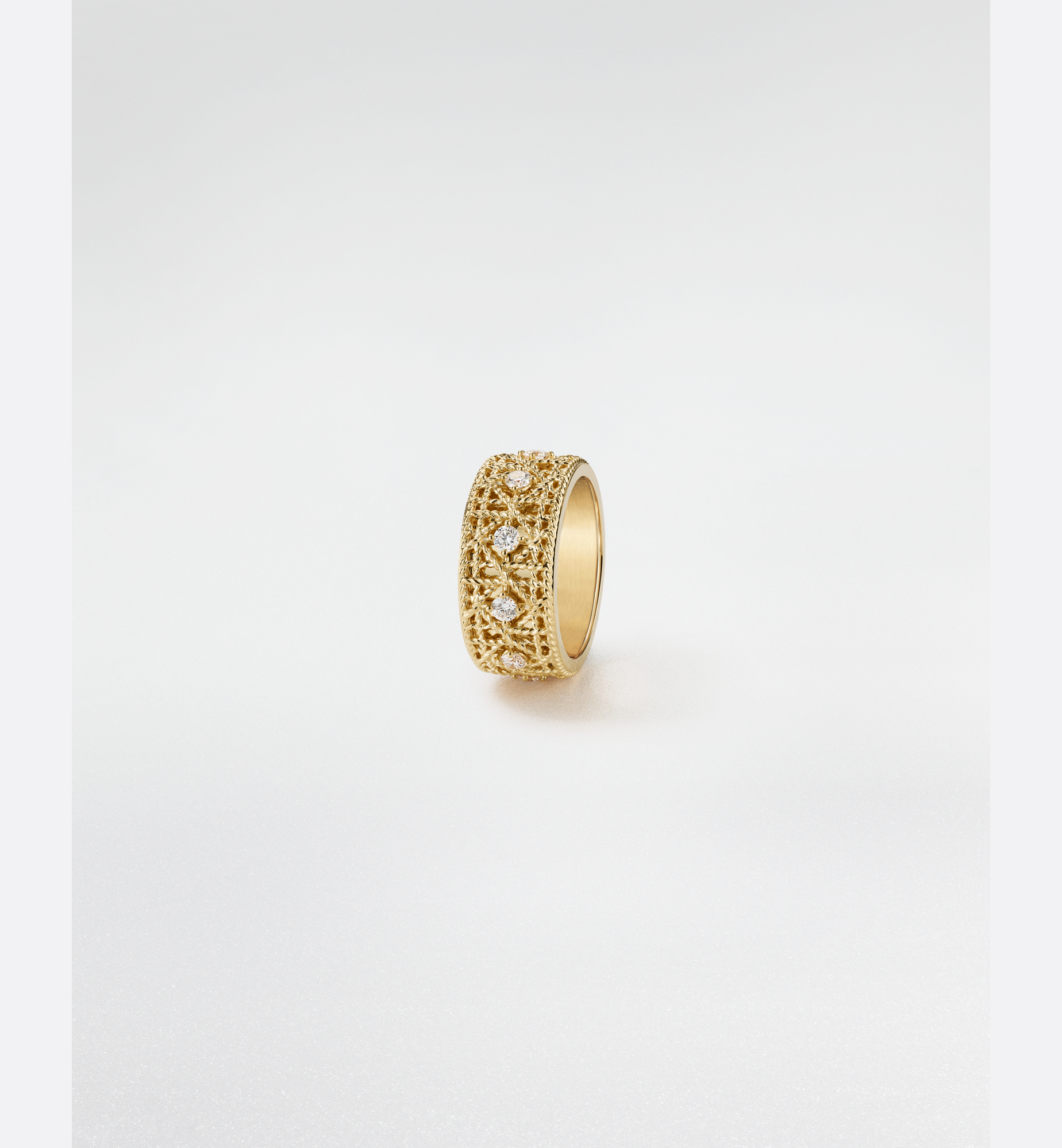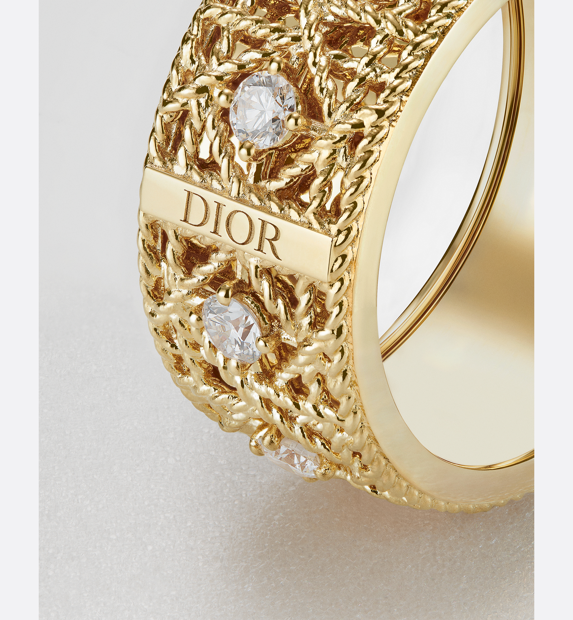 The My Dior collection by Victoire de Castellane is reinvented with a series of infinitely precious jewelry pieces. In an ode to the art of detail, a tangle of golden threads is woven together like meticulously interlaced sprigs of straw into a subtle mesh, revealing the iconic Cannage, accented by a strip of shiny gold. The craftsmanship is an homage to Dior’s refined style. The monochrome designs of the My Dior line play with the concepts of contrast, brilliance and sleek graphics in a tribute to Dior’s timeless elegance. Featuring pink gold, yellow gold or white gold, the pieces are also occasionally adorned with diamonds. 18K yellow gold. Diamonds (0.60 ct*)