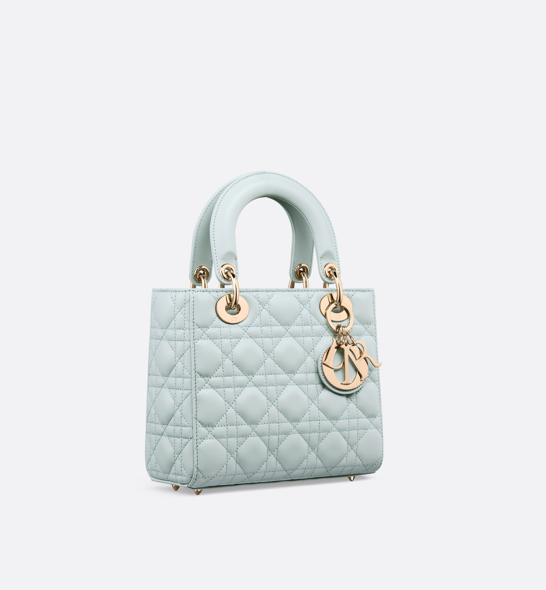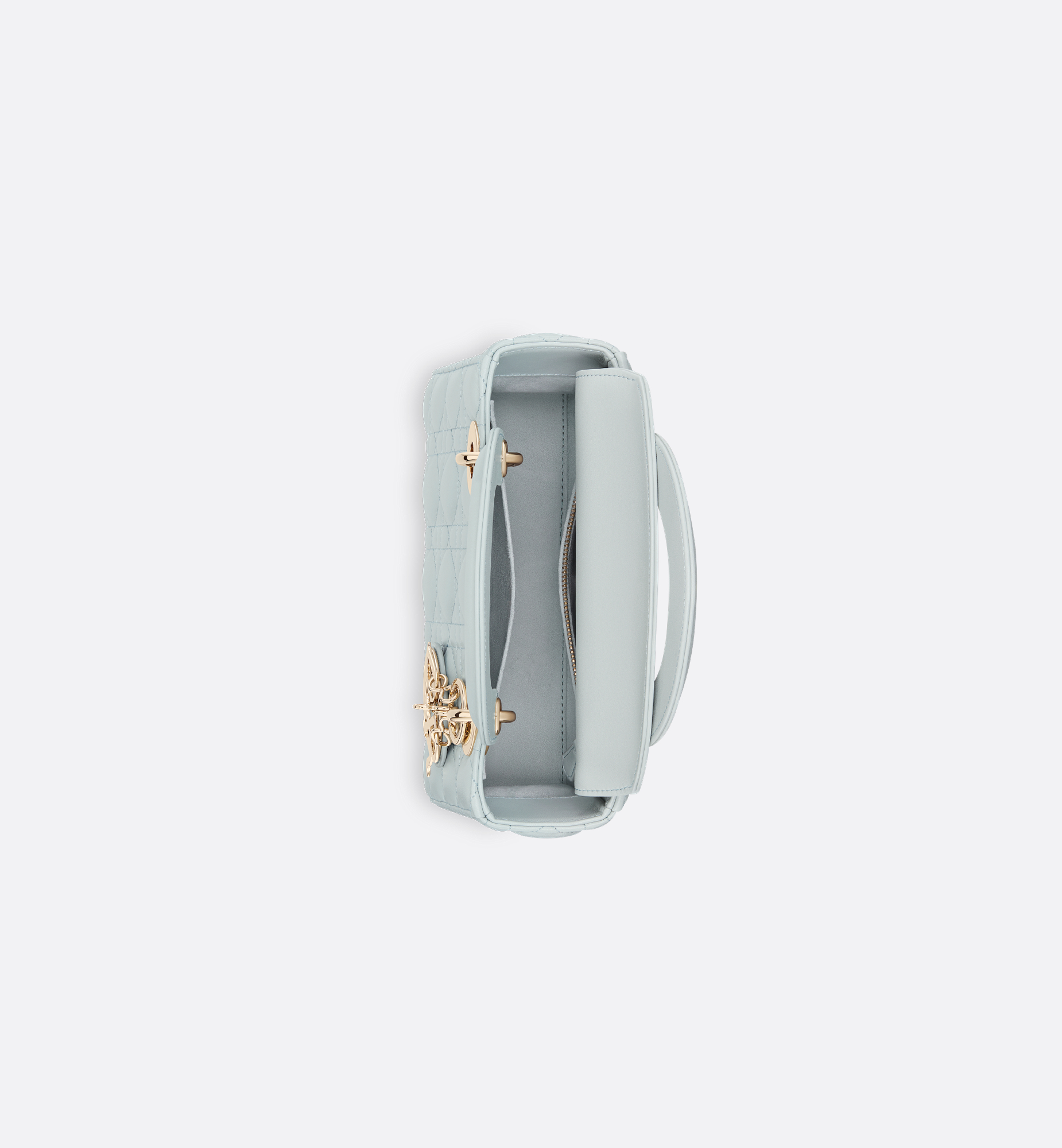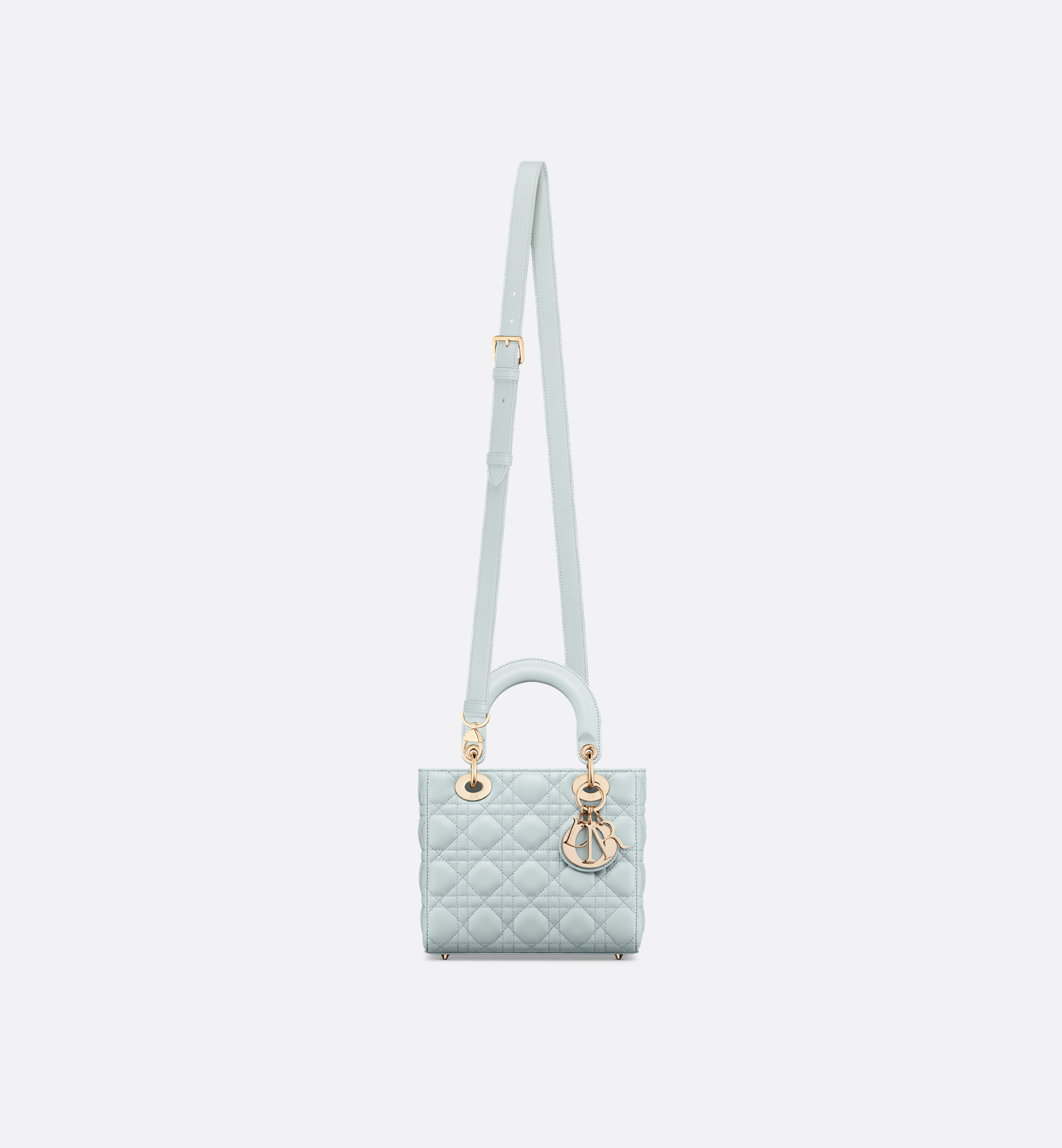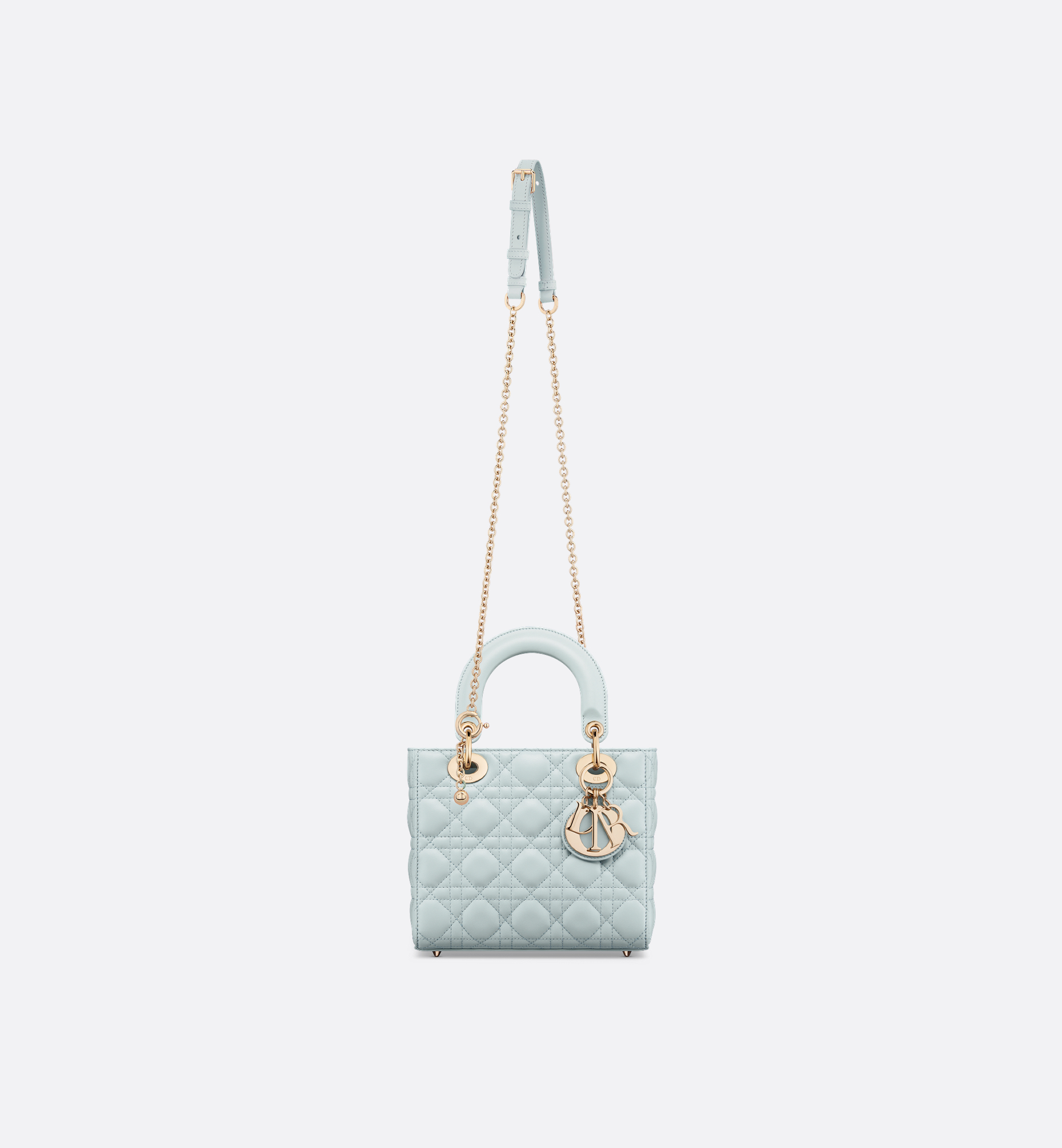 The My Lady Dior and I bag epitomizes the House’s vision of elegance and beauty. Sleek and refined, the timeless creation is revisited in a customizable format. Constructed in placid blue lambskin, it showcases iconic Cannage topstitching, while pale gold-finish metal D.I.O.R. charms further illuminate the silhouette. Featuring a chain that can be customized with cubes, together with an adjustable and removable strap, the style may be carried by hand or worn crossbody. Customizable design exclusively available in Dior boutiques. Main composition: lambskin. Goatskin and lambskin lining. Chain customization only available in Dior boutiques, with four cubes included. Adjustable and removable leather shoulder strap. Interior zip pocket. Interior slip pocket. The bag may be paired with the House’s different embroidered straps. Dust bag included. Made in Italy