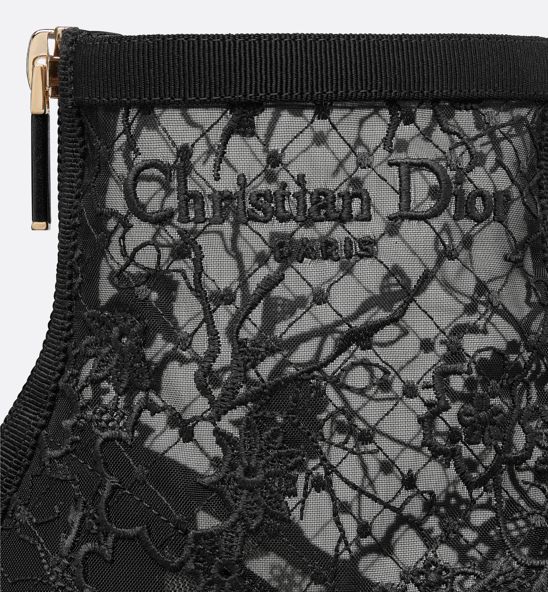 The Naughtily-D ankle boot showcases simple, elegant lines. Offering a sophisticated sheer aesthetic, the transparent mesh upper is enhanced by the gradient effect of Pietro Ruffo’s Millefiori motif embroidery. The delicate, lace-like black pattern is inspired by baroque paintings. An embroidered Christian Dior Paris signature and 3-cm (1-inch) block heel complete the graceful design, which can be paired with other Millefiori creations for a signature look. Main composition: technical fabric and cotton. Technical fabric, goatskin and cotton lining. Embroidered Christian Dior Paris signature. Rear zip closure. Padded calfskin insole. Leather sole with engraved star, Christian Dior’s lucky symbol. Made in Italy