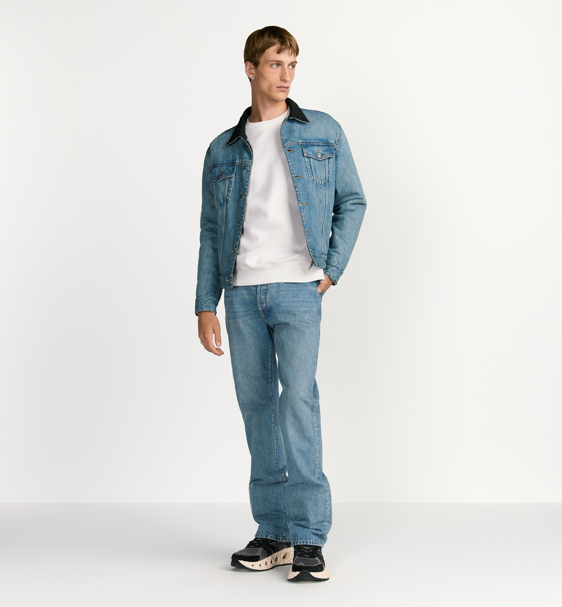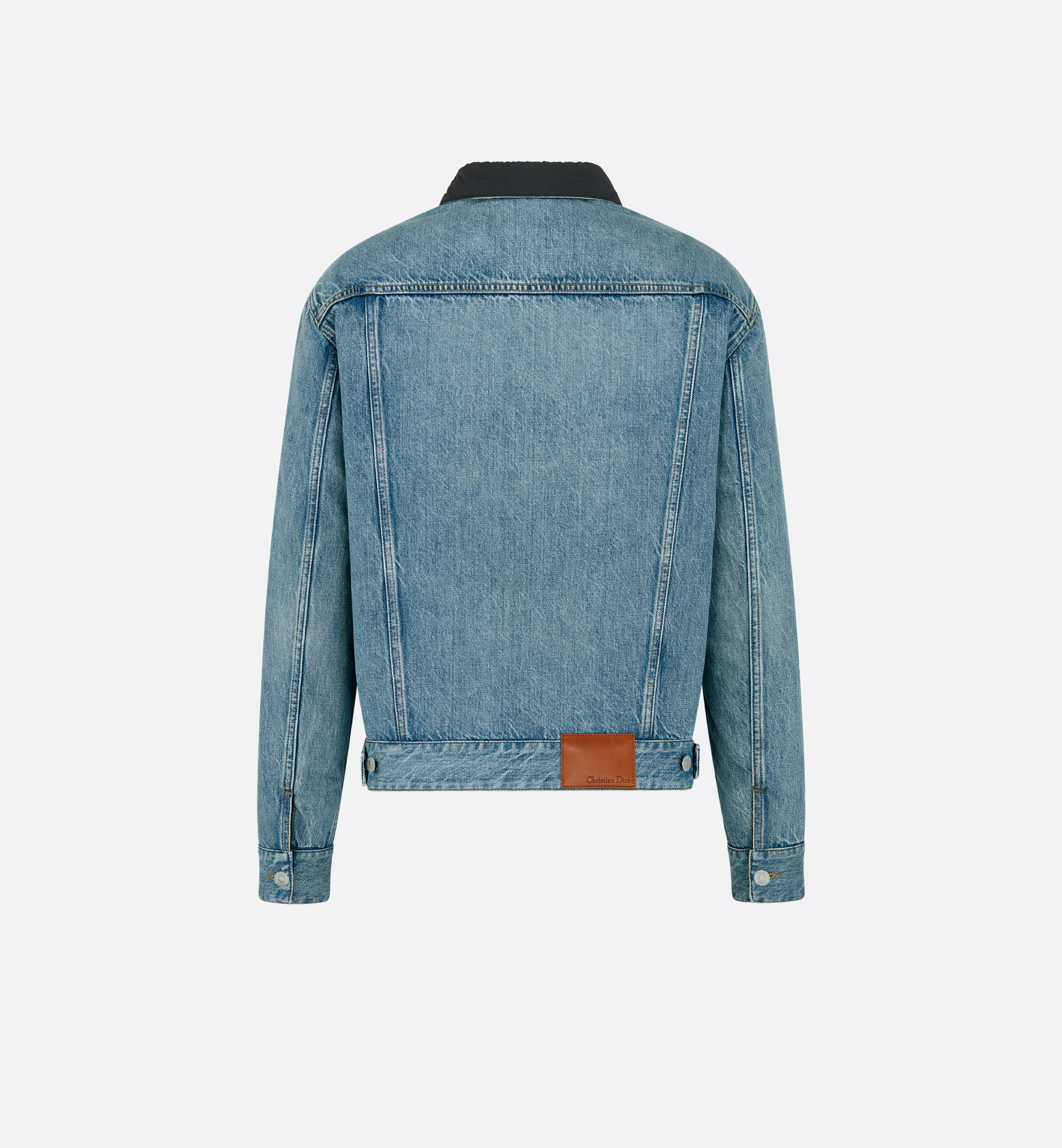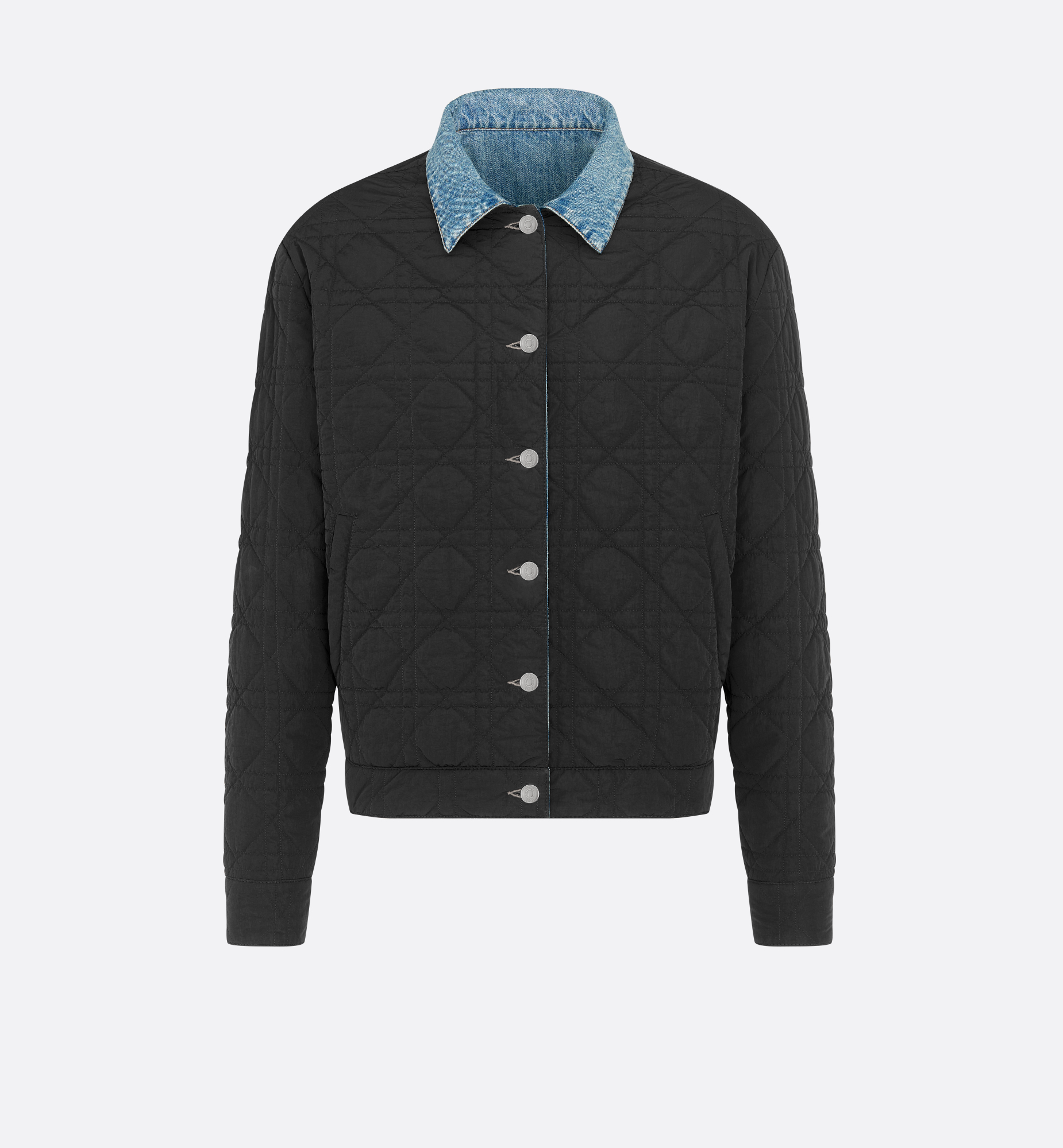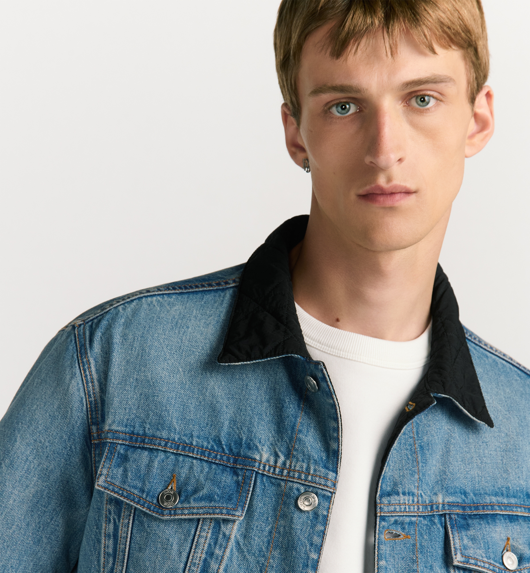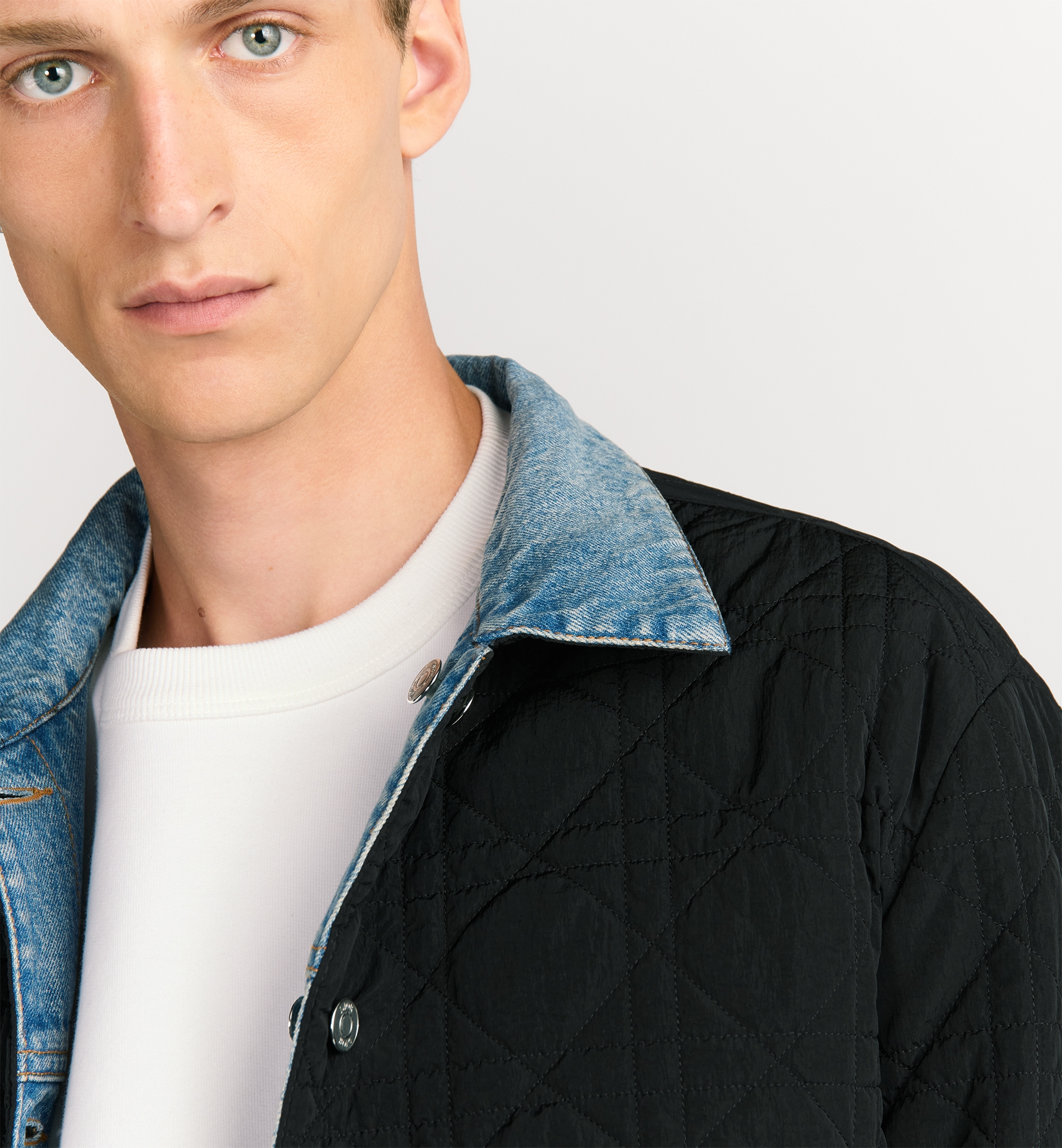 New for Spring 2026, the reversible Cannage jean jacket offers a casual chic take on one of the House’s iconic motifs. Made in blue cotton twill, it is distinguished by the reverse side in quilted Cannage technical fabric and by the Dior embroidery. A Christian Dior Couture signature leather jacron label, chest flap pockets and a metal button closure finish the silhouette. The jacket can be paired with the coordinating jeans to complete the look. Reversible style. Quilted Cannage collar and interior. Leather jacron label with Christian Dior Couture signature. Dior-engraved metal button closure. Chest flap pockets. 100% cotton and interior: 100% polyester. Made in Italy