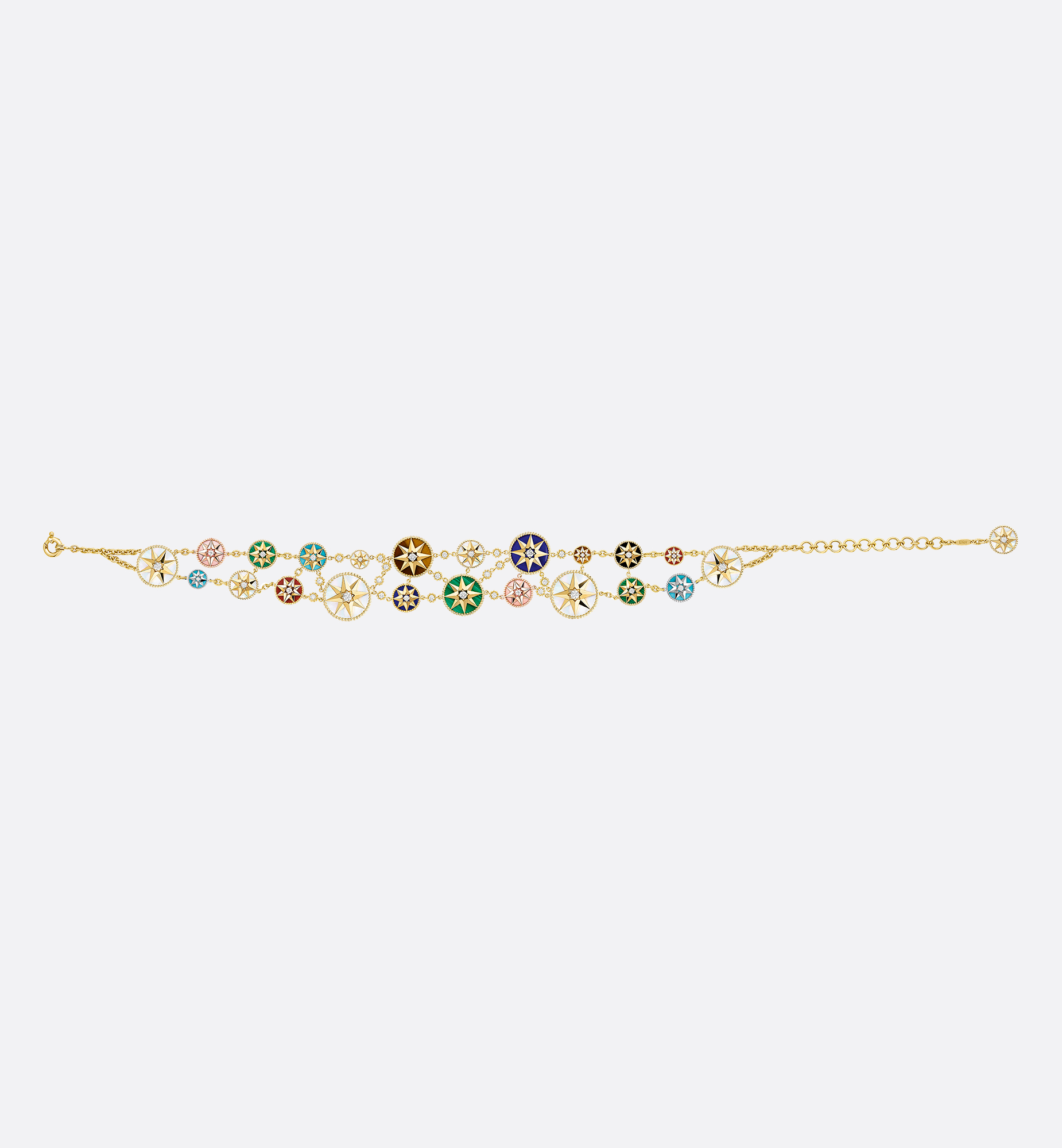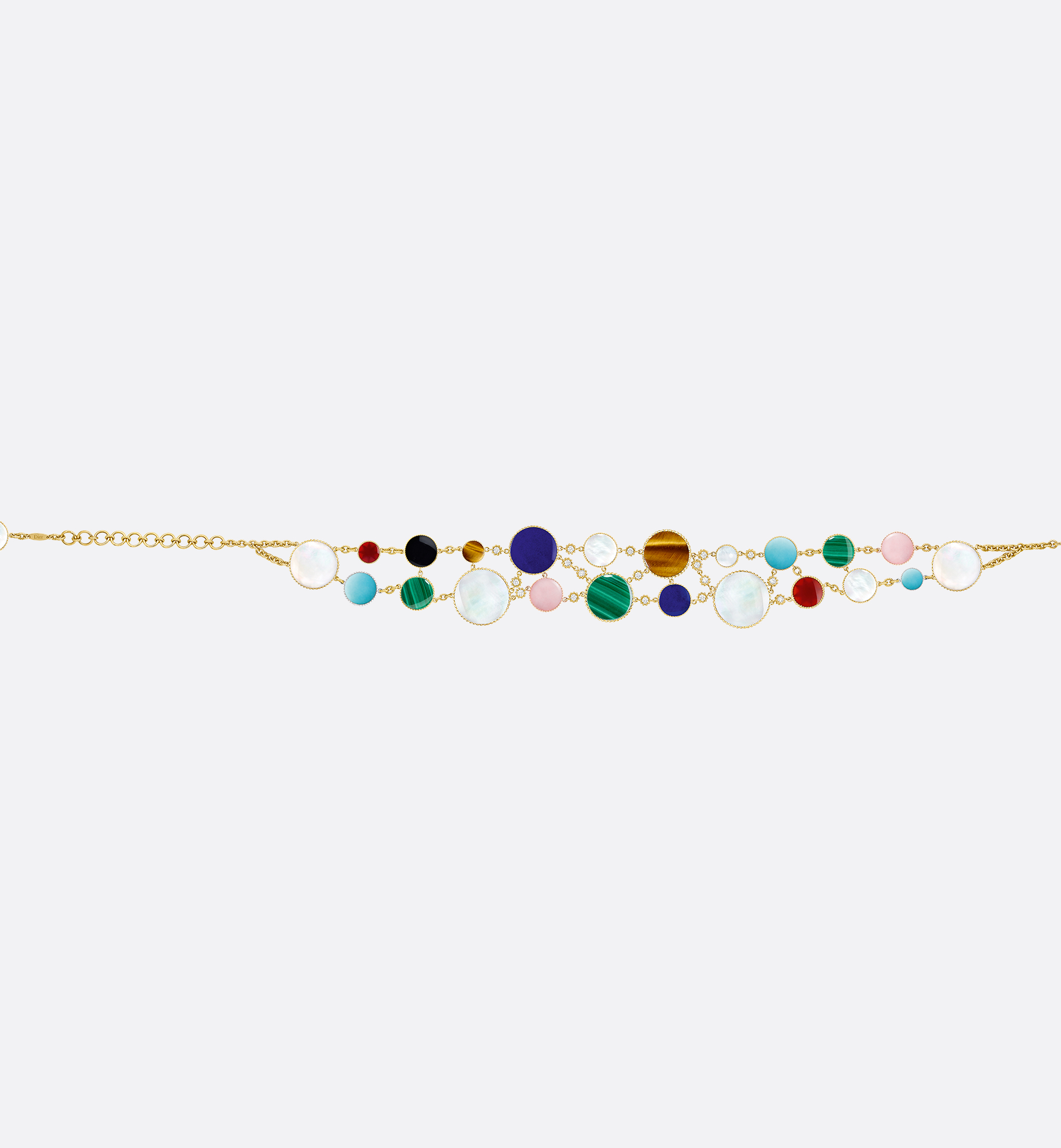 Victoire de Castellane reinterprets Mr. Dior’s lucky star in the form of a wind rose, an eight-pointed star design. A ring of beading encircles the motifs, which turn to switch between the gemstone or wind rose sides. 18K yellow gold, 18K pink gold and 18K white gold. Diamonds (2.03 ct*). Mother-of-pearl, lapis lazuli, malachite, turquoise, onyx, tiger eye, carnelian and pink opal. Motif diameters: 8, 12, 17 and 20 mm / 0.3, 0.5, 0.7 and 0.8 inch