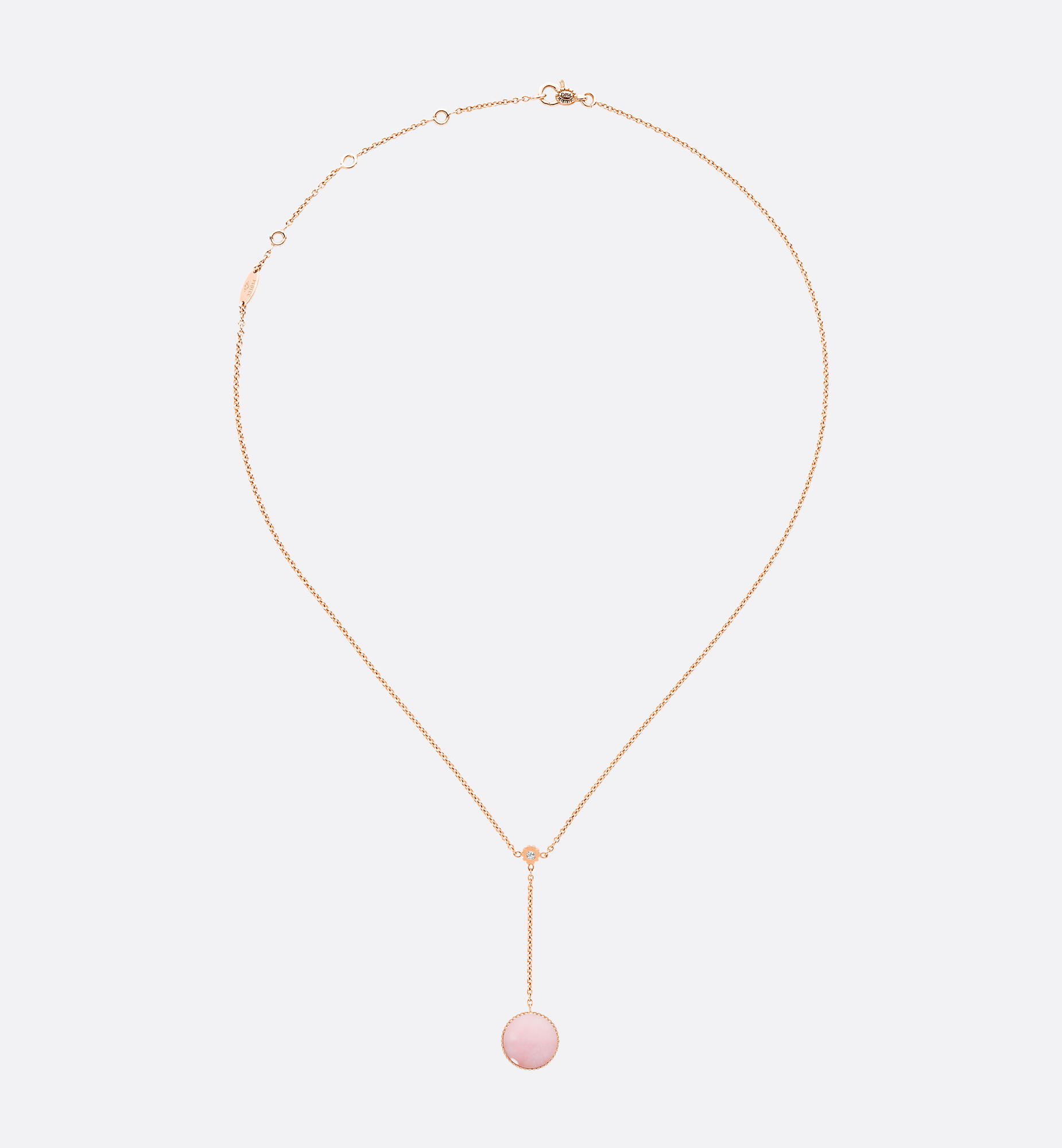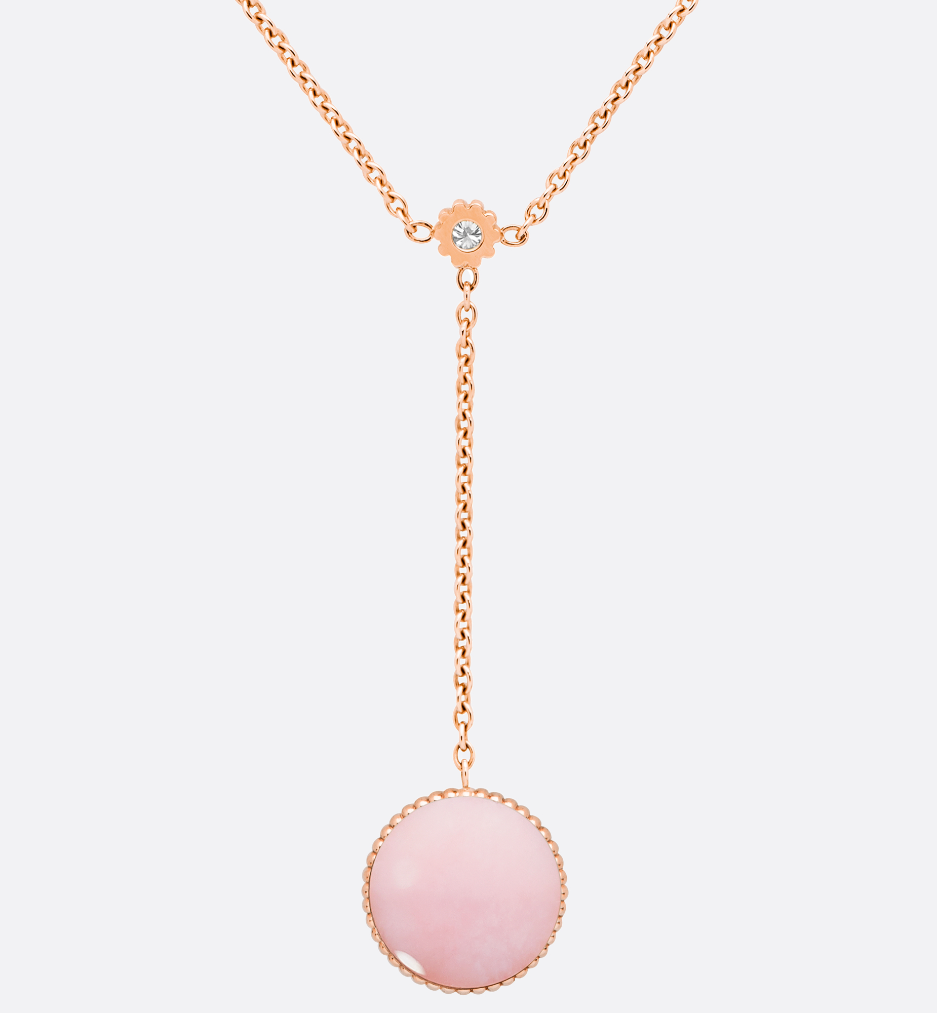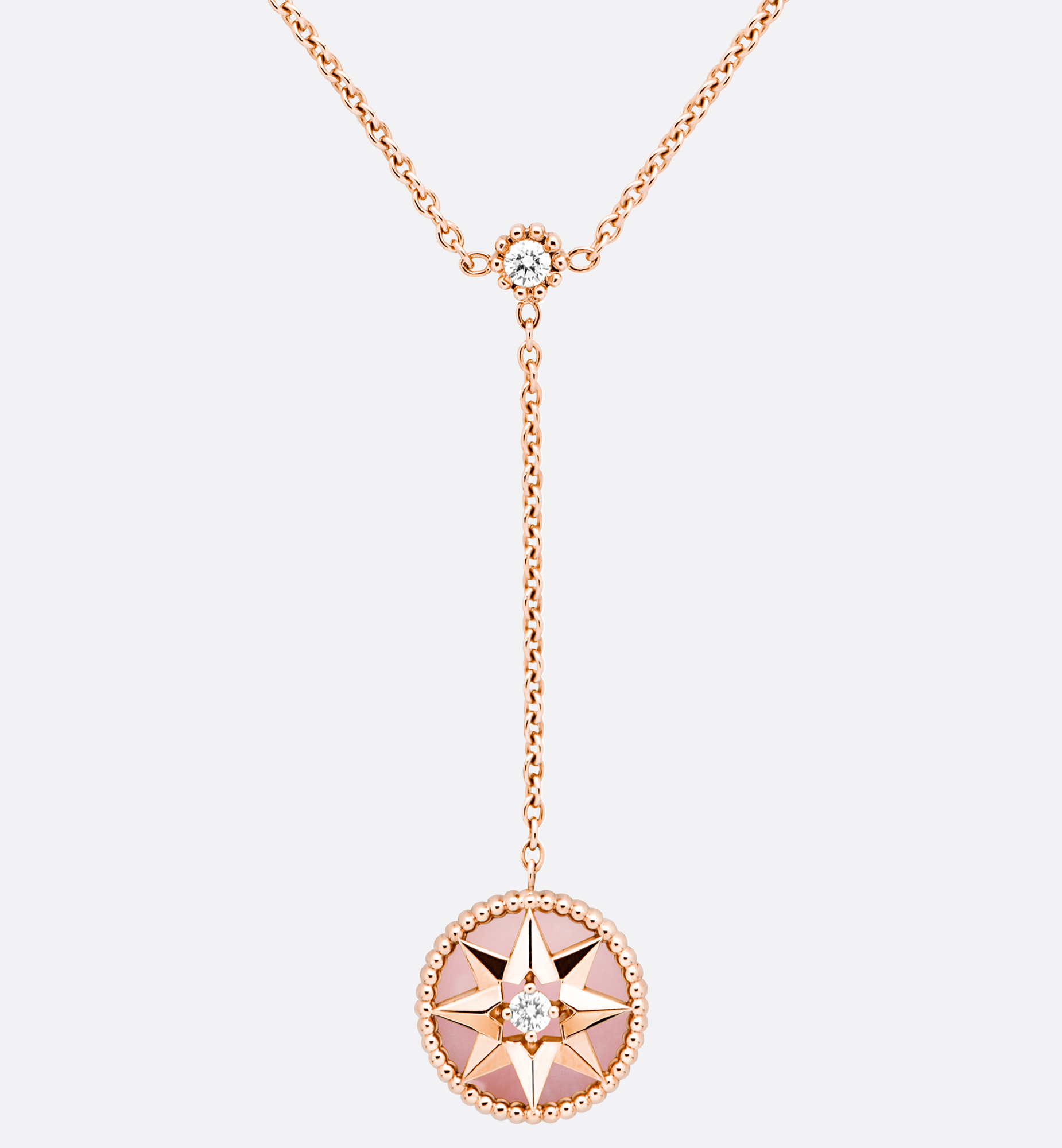Victoire de Castellane reinterprets Mr. Dior’s lucky star in the form of a wind rose, an eight-pointed star design. A ring of beading encircles the motif, which turns to switch between the gemstone or wind rose sides. 18K pink gold. Diamonds (0.10 ct*). Pink opal. Motif diameter: 12 mm / 0.5 inch