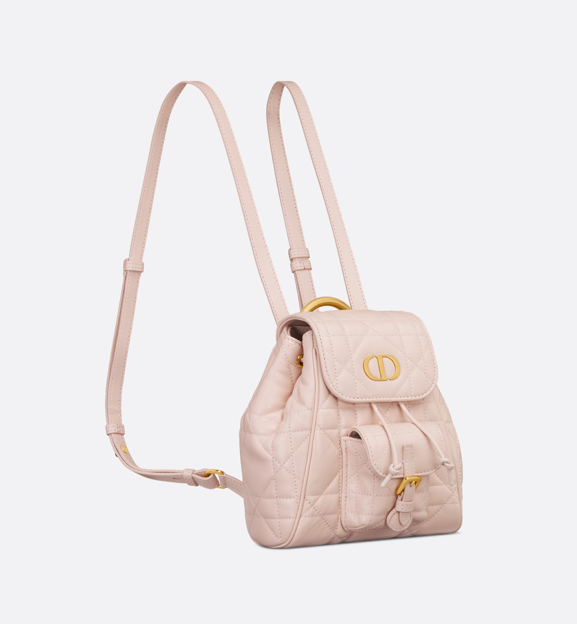 The Dior Caro backpack embodies modern and elegant style. Crafted in powder pink lambskin elevated by Macrocannage topstitching, the design features a flap adorned with an antique gold-finish metal CD signature that opens to reveal a drawstring main compartment, while a small flap pocket can hold all the essentials. The small backpack has a gold-finish handle and adjustable straps for added comfort. Main composition: lambskin and calfskin. Calfskin lining. CD signature on the front. Flap and drawstring closure. Front slip pocket with flap. Interior slip pocket. Antique gold-finish metal handle. Adjustable leather straps. Dust bag included. Made in Italy