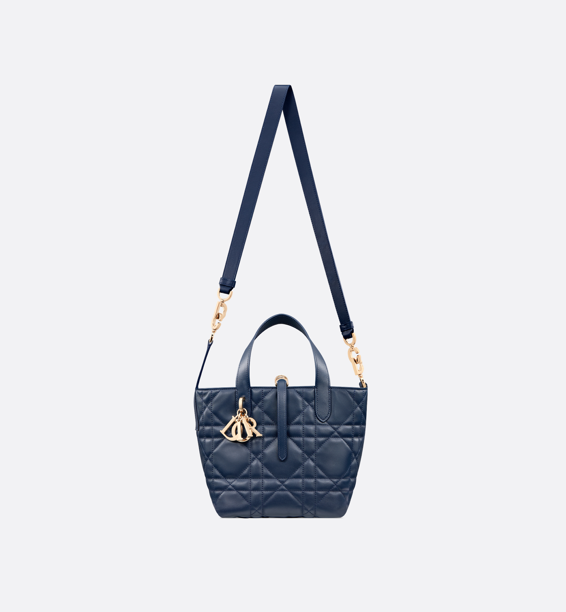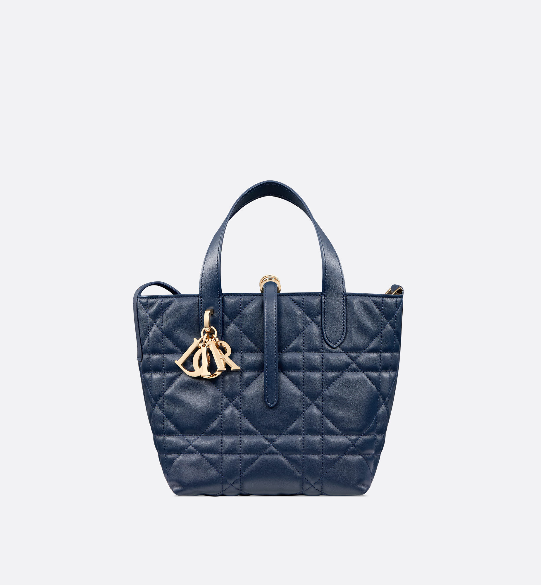 The Dior Toujours vertical tote bag is distinguished by a modern and practical design. Crafted in deep ocean blue calfskin with Macrocannage topstitching, it has a spacious interior compartment to accommodate all the essentials. Its thin leather strap closure keeps items secure, while the D of the CD Lock clasp twists to adjust the sides and enhance the bag’s silhouette. The leather top handles are completed by a removable leather strap, allowing the small bag to be carried by hand, worn over the shoulder or crossbody. Main composition: calfskin. Calfskin lining. Double closure: a thin lace-through strap and a Christian Dior Paris strap with a CD Lock clasp. D.I.O.R. charms. Interior slip pocket for cards. Leather top handles. Removable leather shoulder strap. Dust bag included. Made in Italy