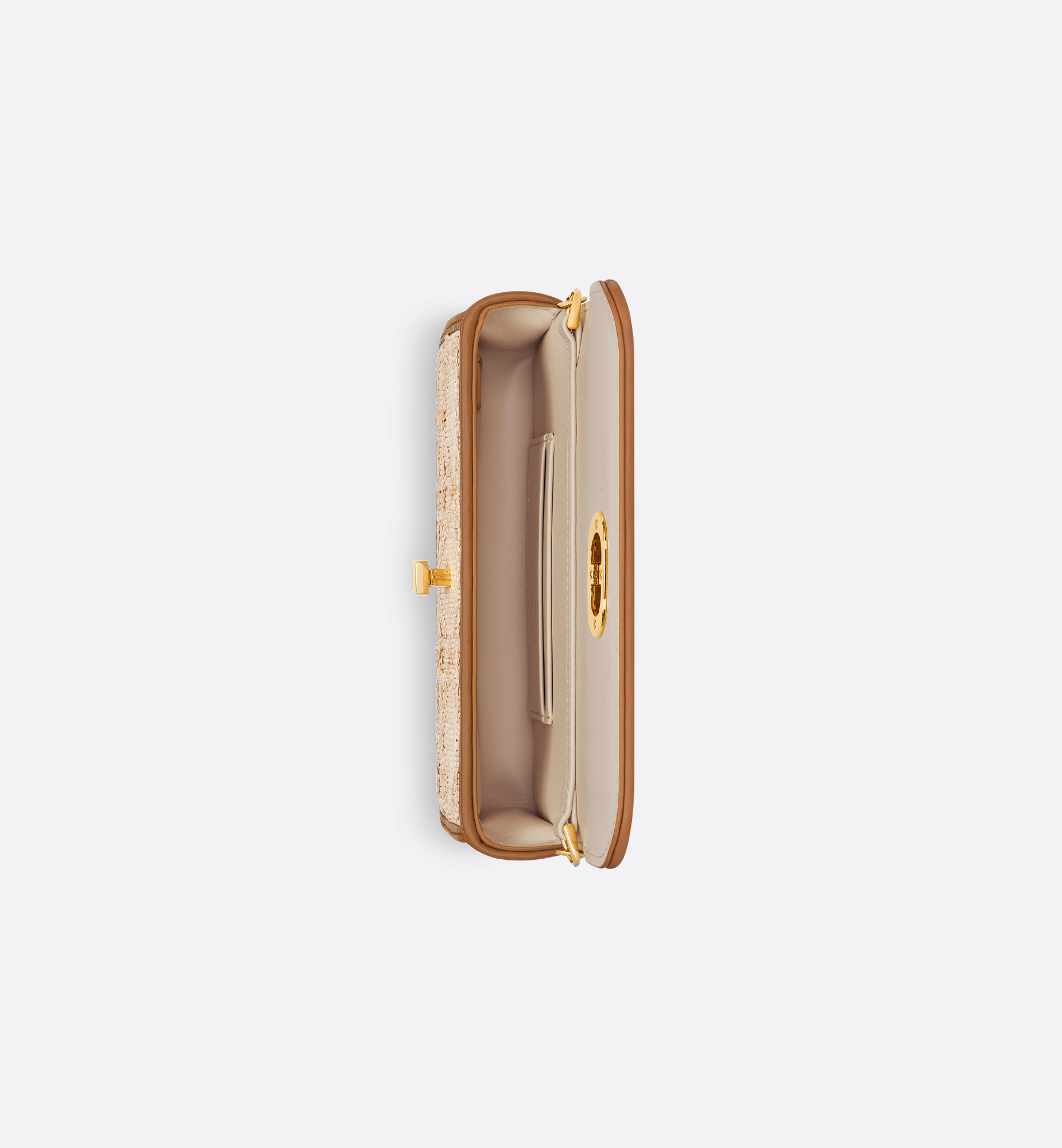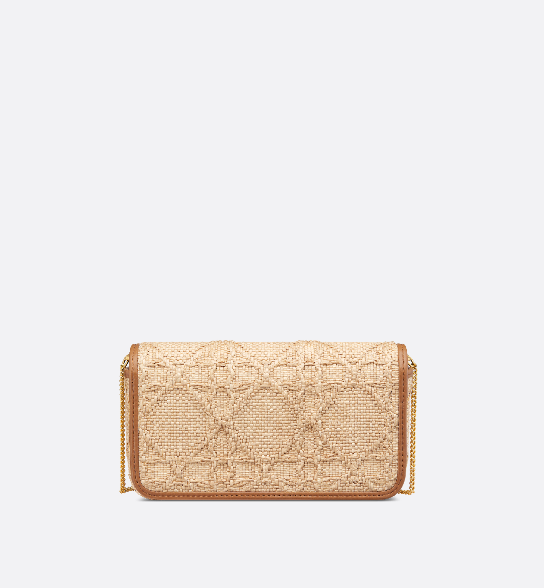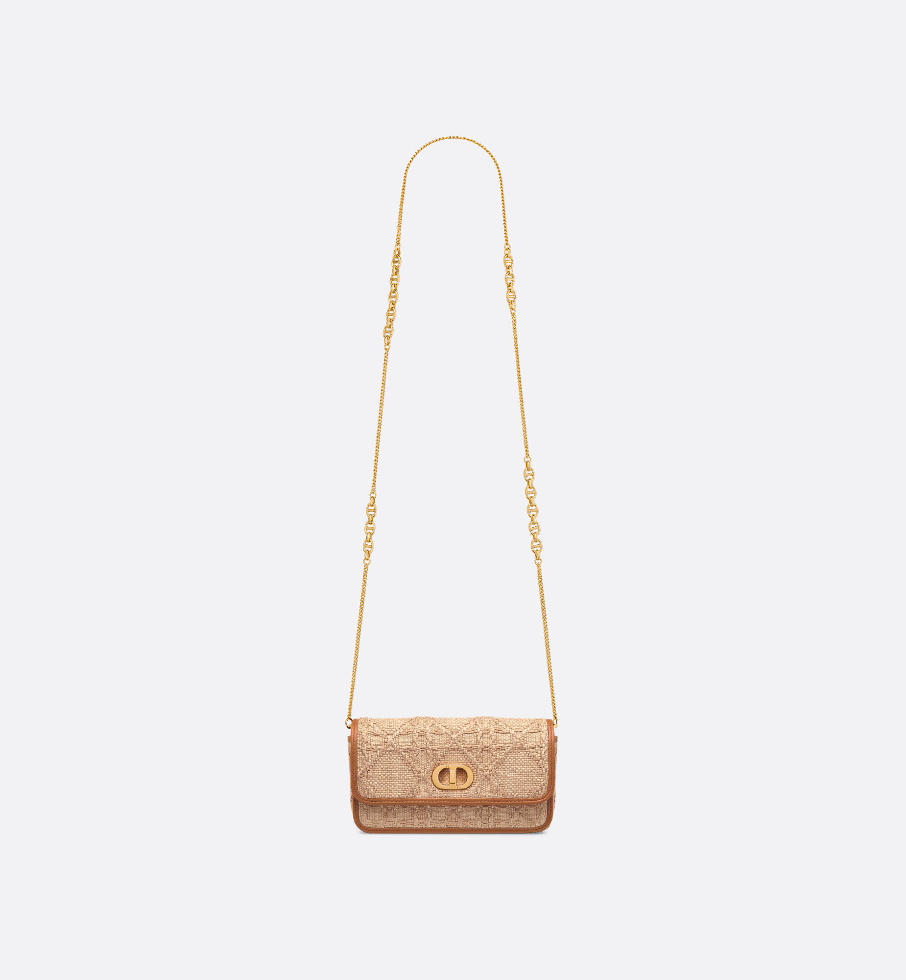 The Miss Caro pouch with chain is practical and graceful. Made in beige raffia displaying the iconic Cannage motif, it features a flap with a gold-finish metal CD twist clasp inspired by the seal of a Christian Dior perfume bottle, opening to reveal a compartment that will accommodate all the essentials. The chain strap allows the small pouch to be carried comfortably by hand, worn over the shoulder or crossbody as an ideal daily pouch. Main composition: cotton, calfskin and technical fabric. Calfskin and technical fabric lining. CD twist clasp. Flap closure. One compartment. Two card slots. Chain with gold-finish metal CD links. Made in Italy