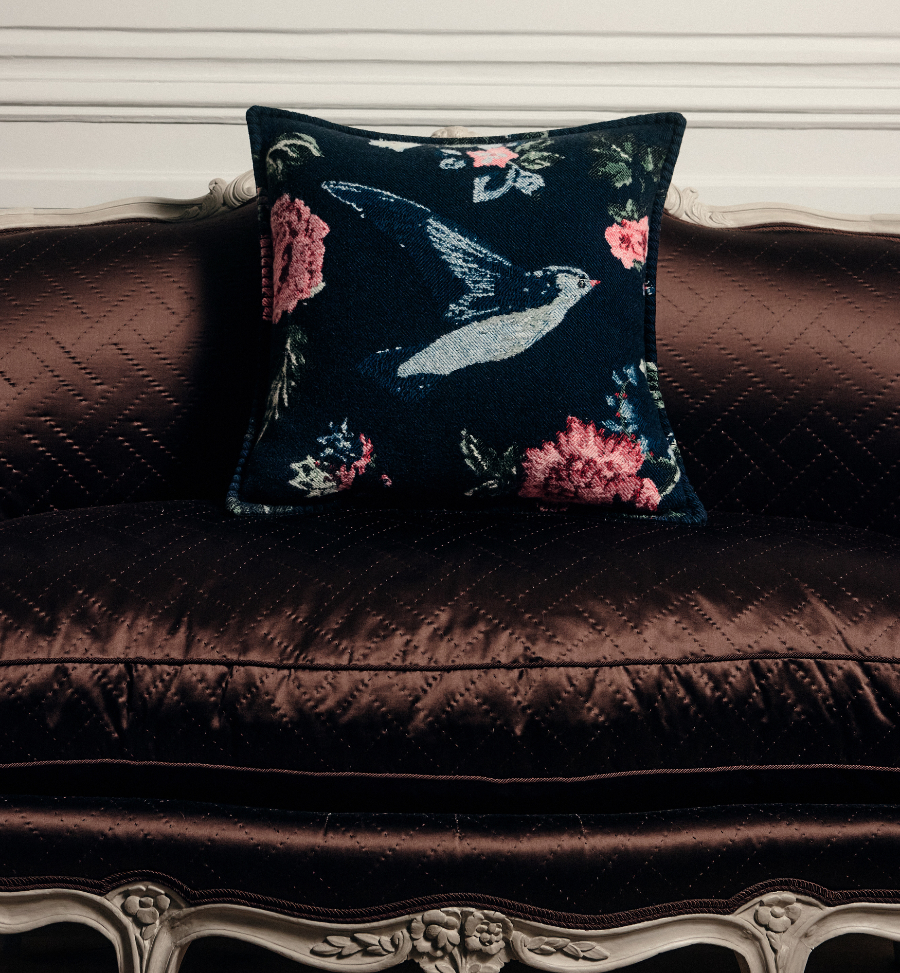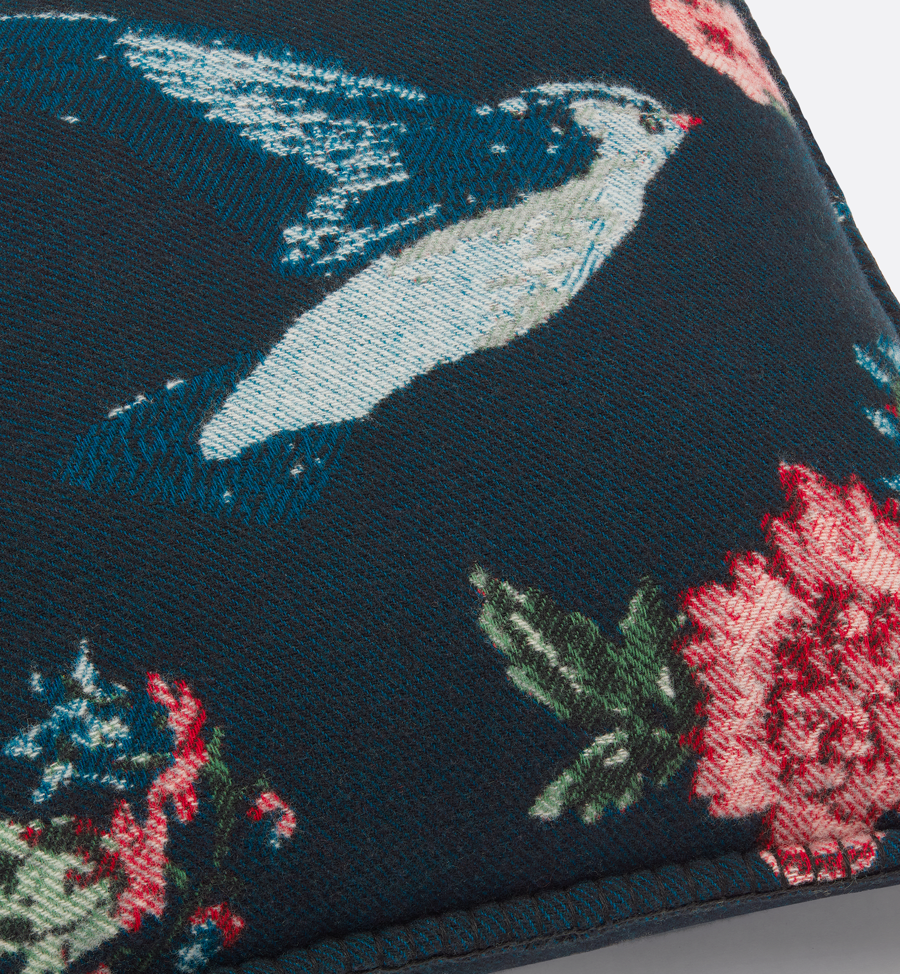 The square pillow is unveiled as part of the Ranelagh collection by Cordelia de Castellane in a poetic reinterpretation of Mr. Dior’s winter garden wall mural, paying rich homage to the many examples of House savoir-faire. Crafted in wool and cashmere jacquard, the deep blue pillow showcases a multicolor bird and flower motif. The creation will enhance any home with a touch of elegance and can be coordinated with other pieces from the Ranelagh collection for a timeless ode to nature. Main composition: 90% wool, 10% cashmere. Filling: 50% cotton, 50% polyester. Made in Scotland. Professional dry clean only. Do not iron