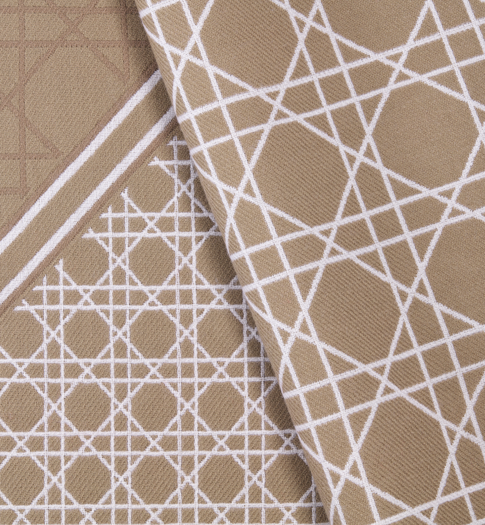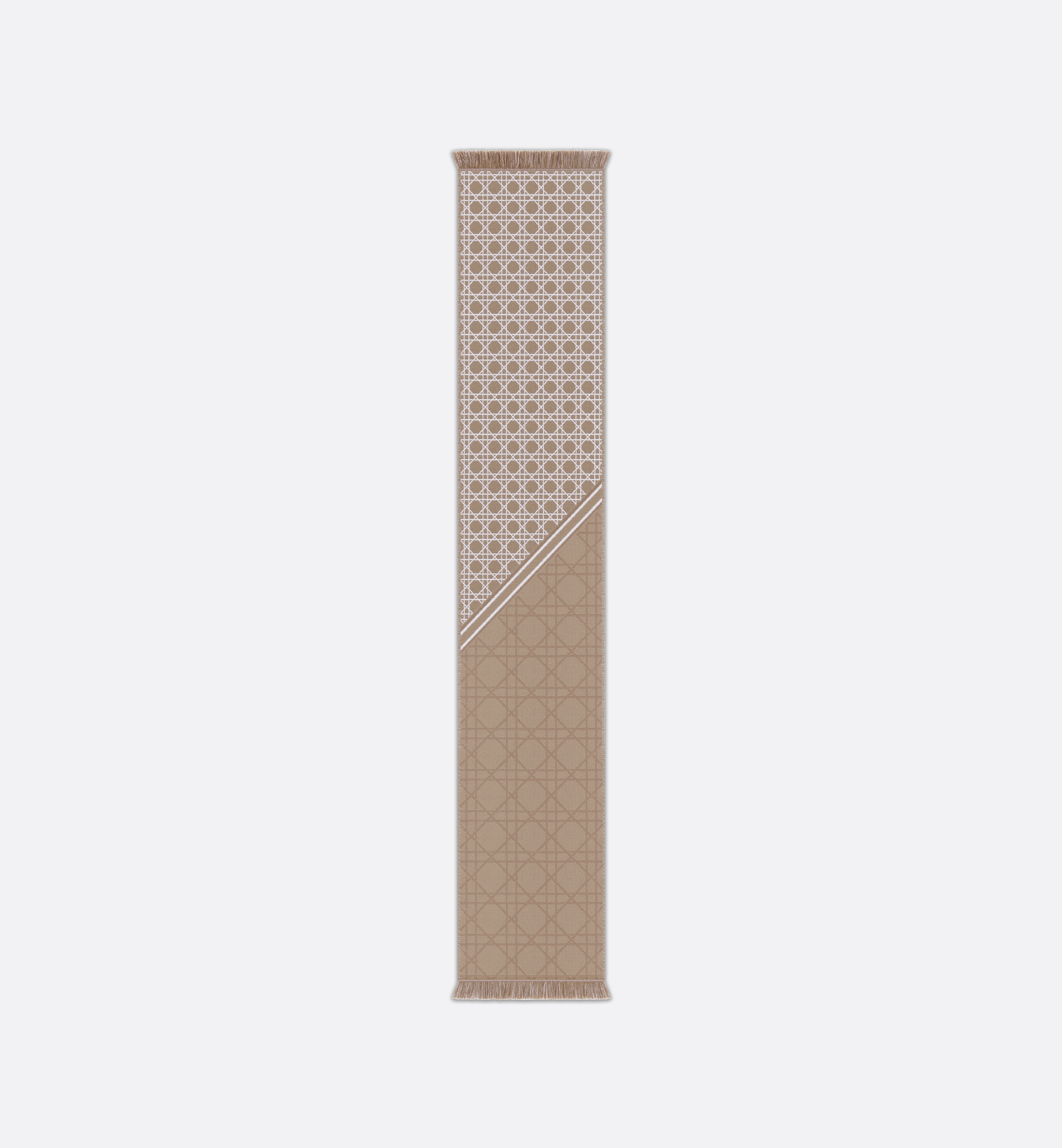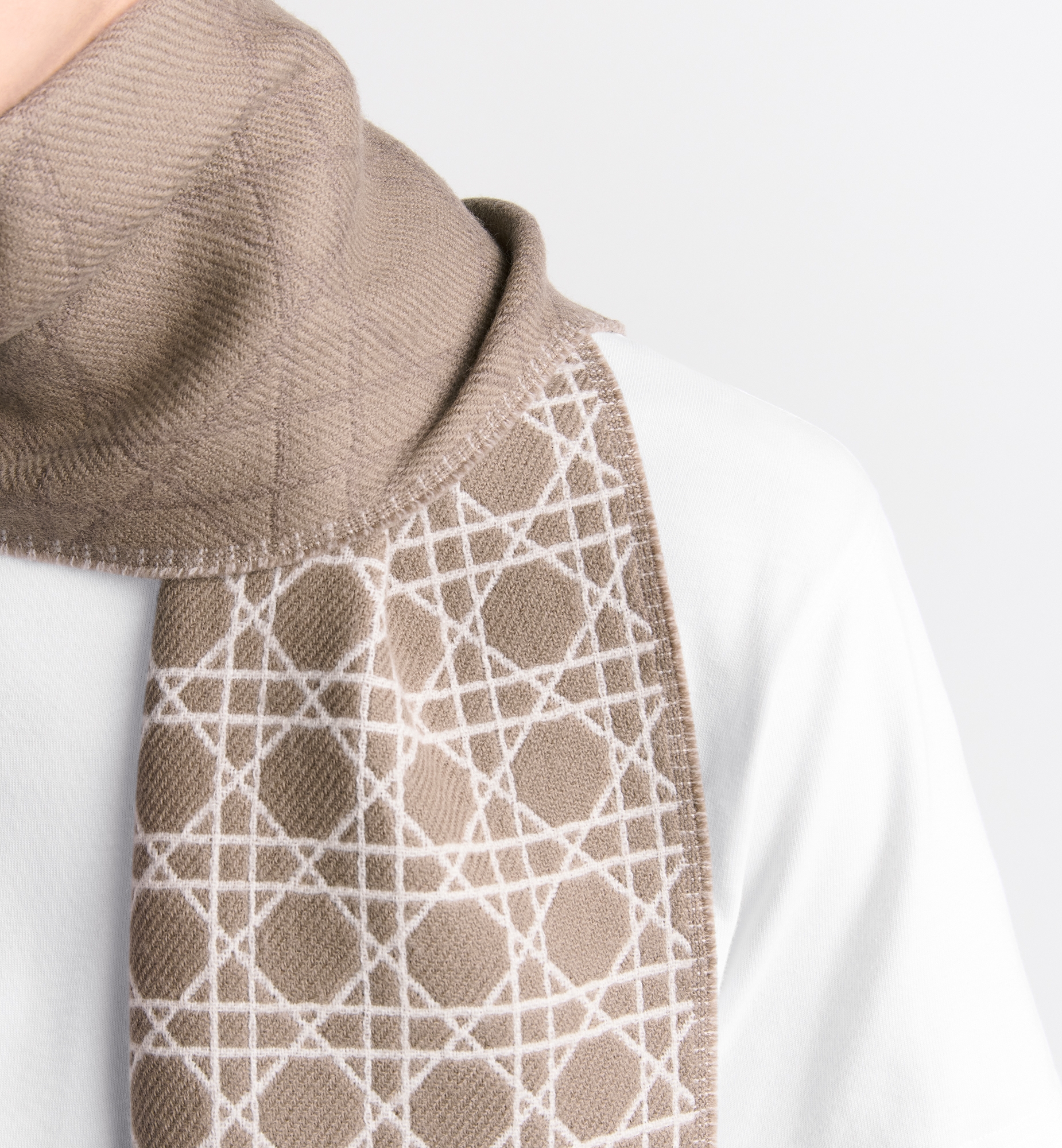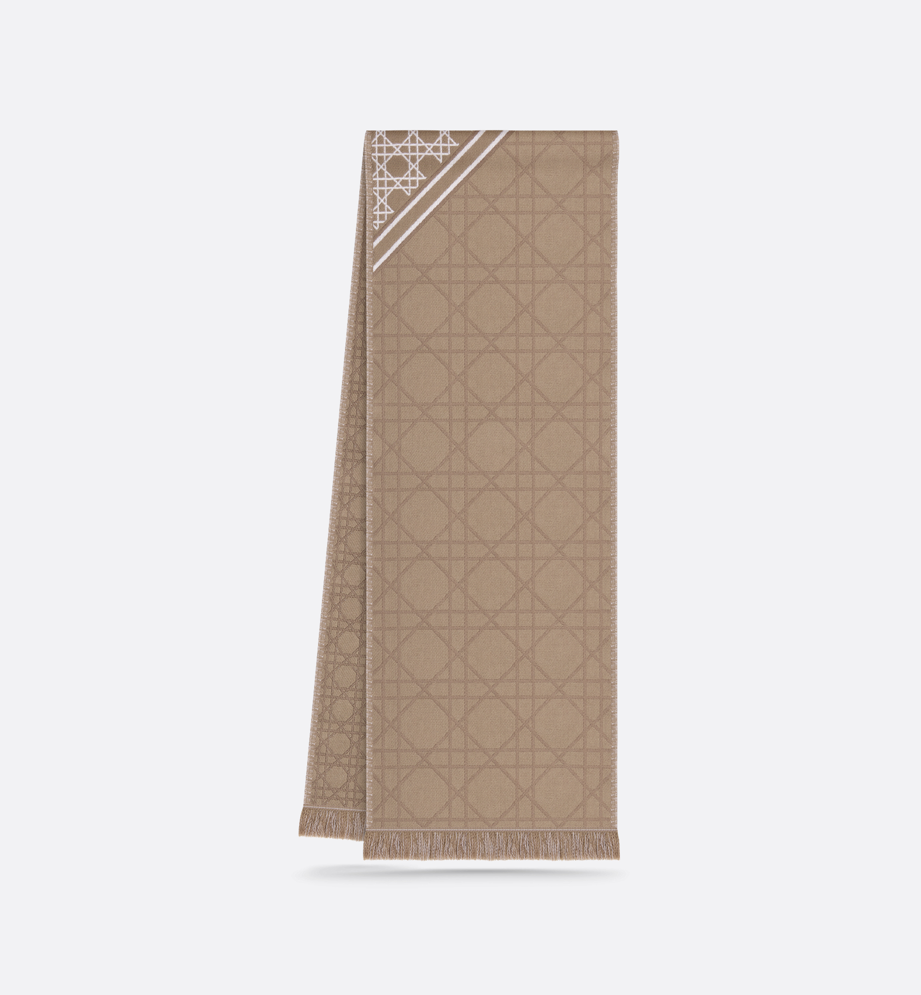 The scarf honors House heritage. Crafted in wool, the fringed-edge design features three stripes separating the contrasting Cannage motif from the tonal Maxicannage. Long and enveloping, the scarf can be worn around the neck or draped over the shoulders. Beige and white Cannage motif with white Maxicannage. Contrasting jacquard stripes with Christian Dior signature. Fringed edges. 100% wool. Made in Italy