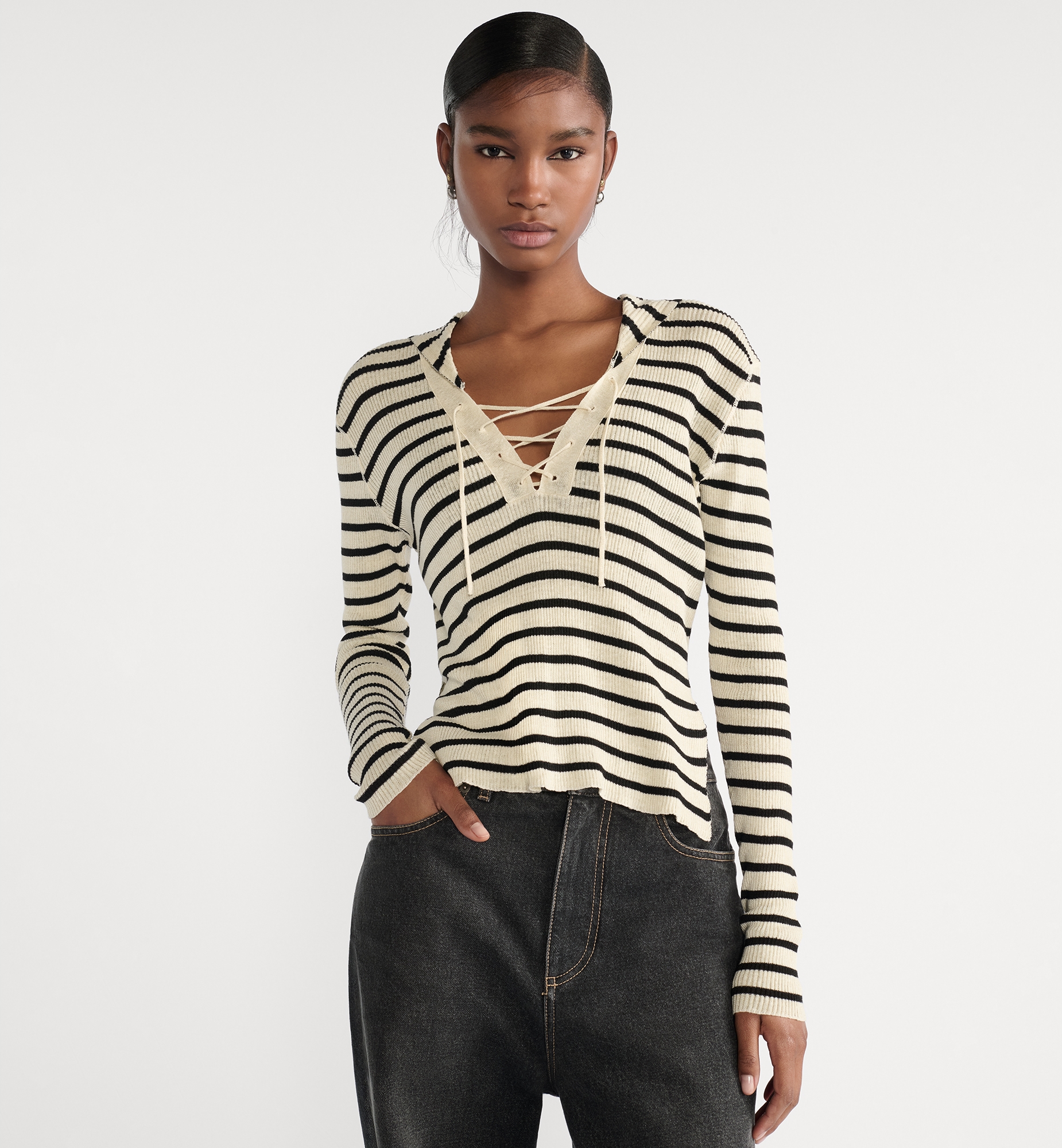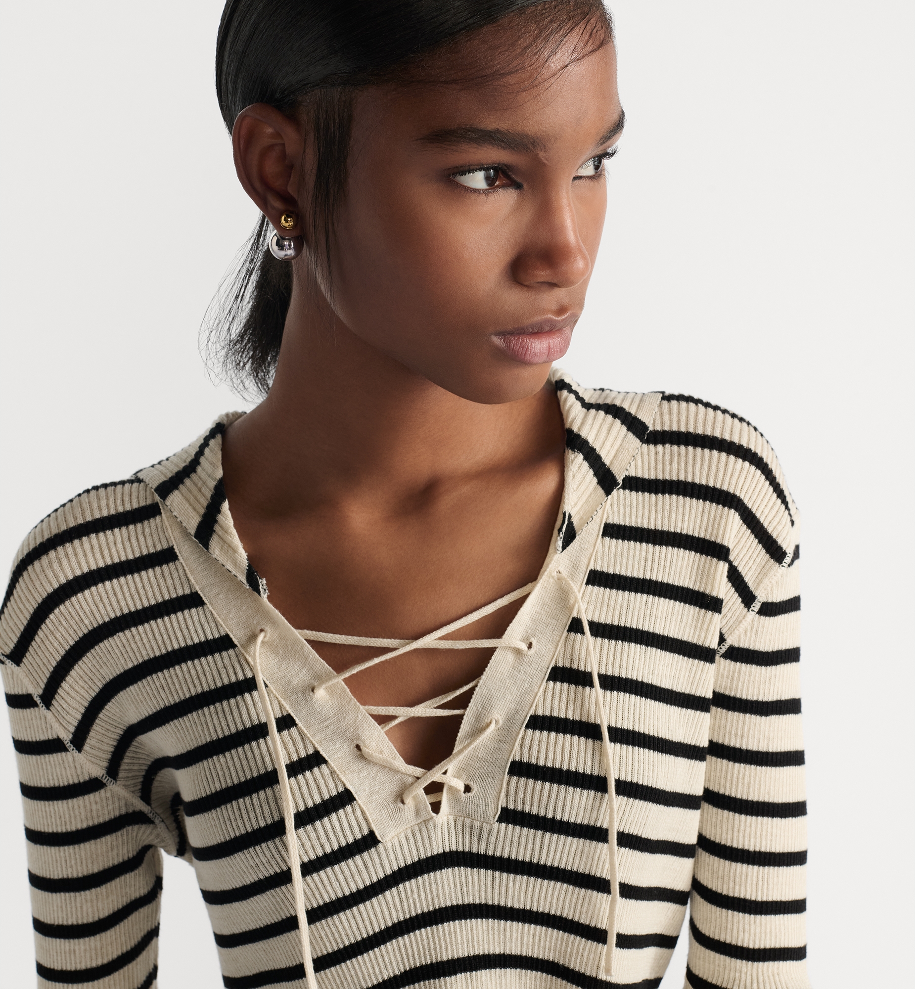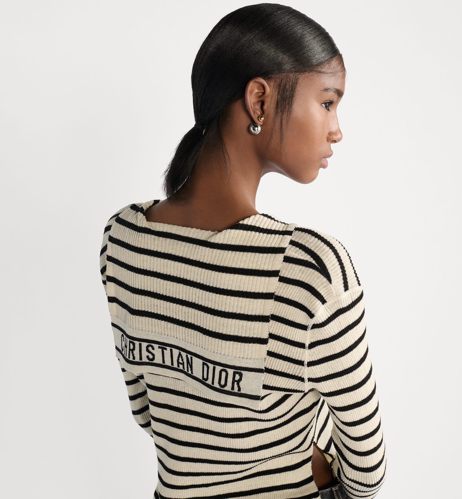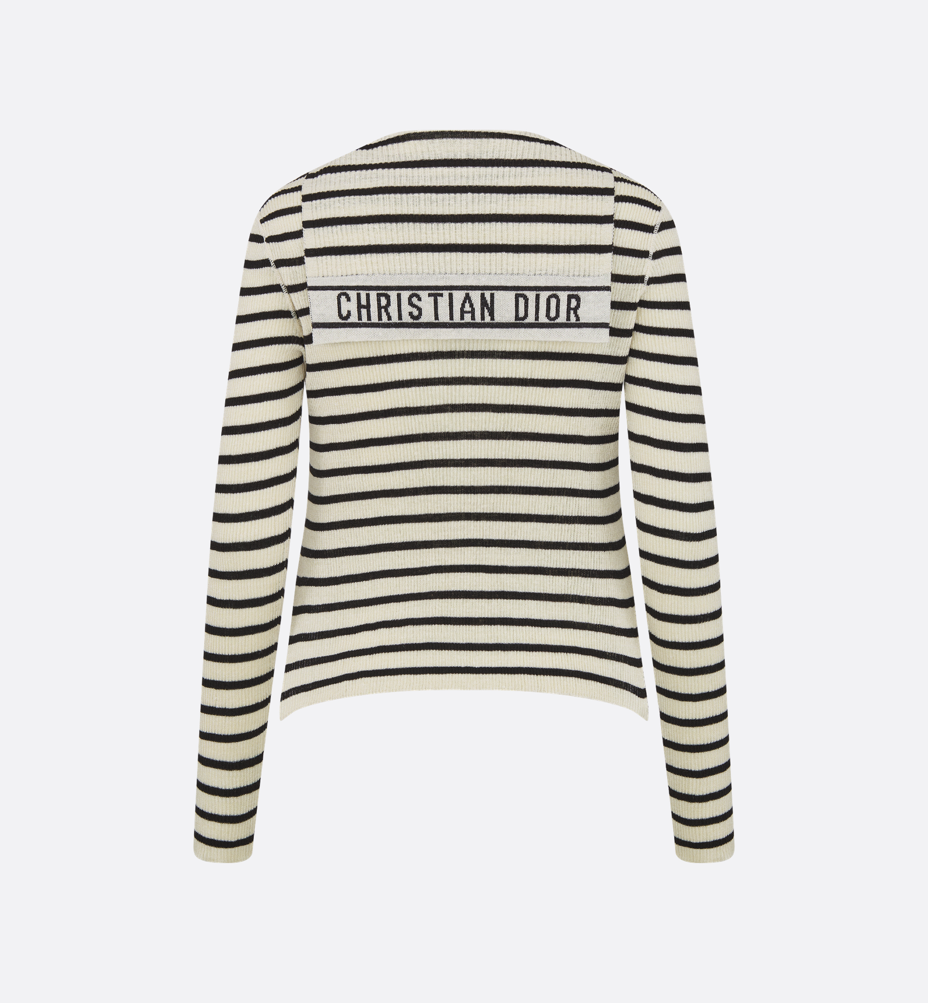 The sweater is a modern and elegant design. Crafted in a navy blue and white linen and silk knit with the D-Stripes motif, it features a fitted silhouette enhanced by a lace-up neckline, as well as the Christian Dior signature on the back. The sweater can be coordinated with jeans for a casual, refined look. Christian Dior signature on the back. Lace-up neckline. Unlined. 80% linen, 20% silk (14 gauge)*. Made in Italy. Treat with extra care and gently dry clean