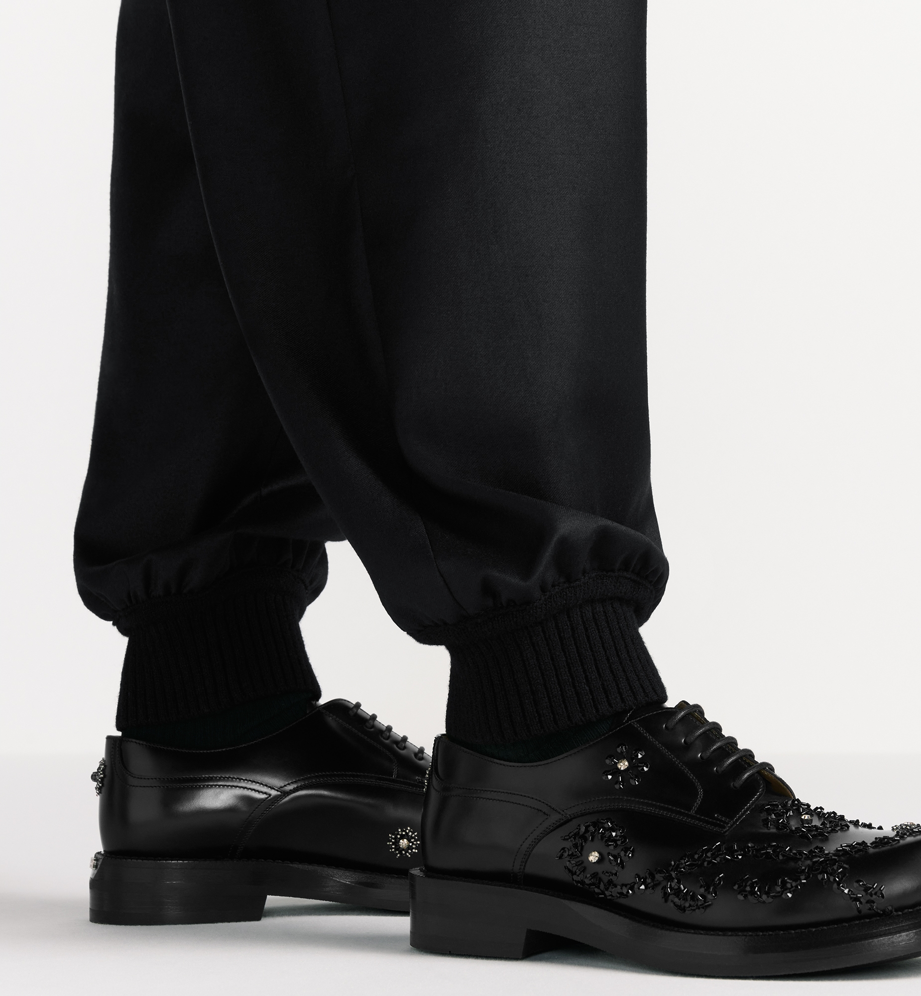 The track pants offer an elegant new take on a sportswear essential. Debuted at the Winter 2025-2026 Men’s Fashion Show, the pants are crafted in black wool and feature an elastic waistband, a rear zip pocket and ribbed cuffs. The track pants can be worn with one of the jackets from the collection. Elastic waistband. Side slit pockets and rear zip pocket. Ribbed ankle cuffs. 100% wool. Made in Italy