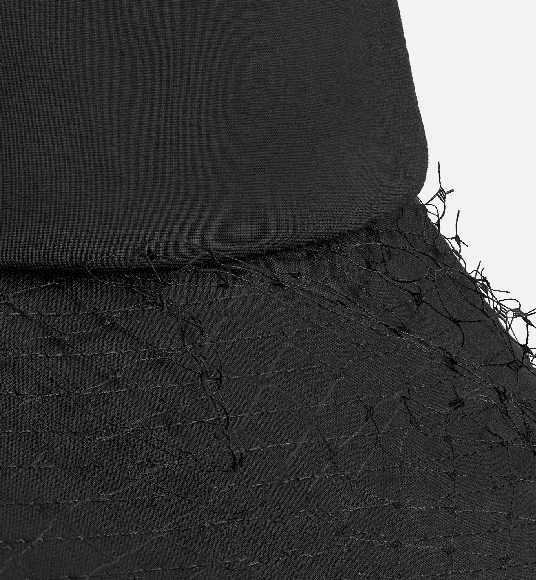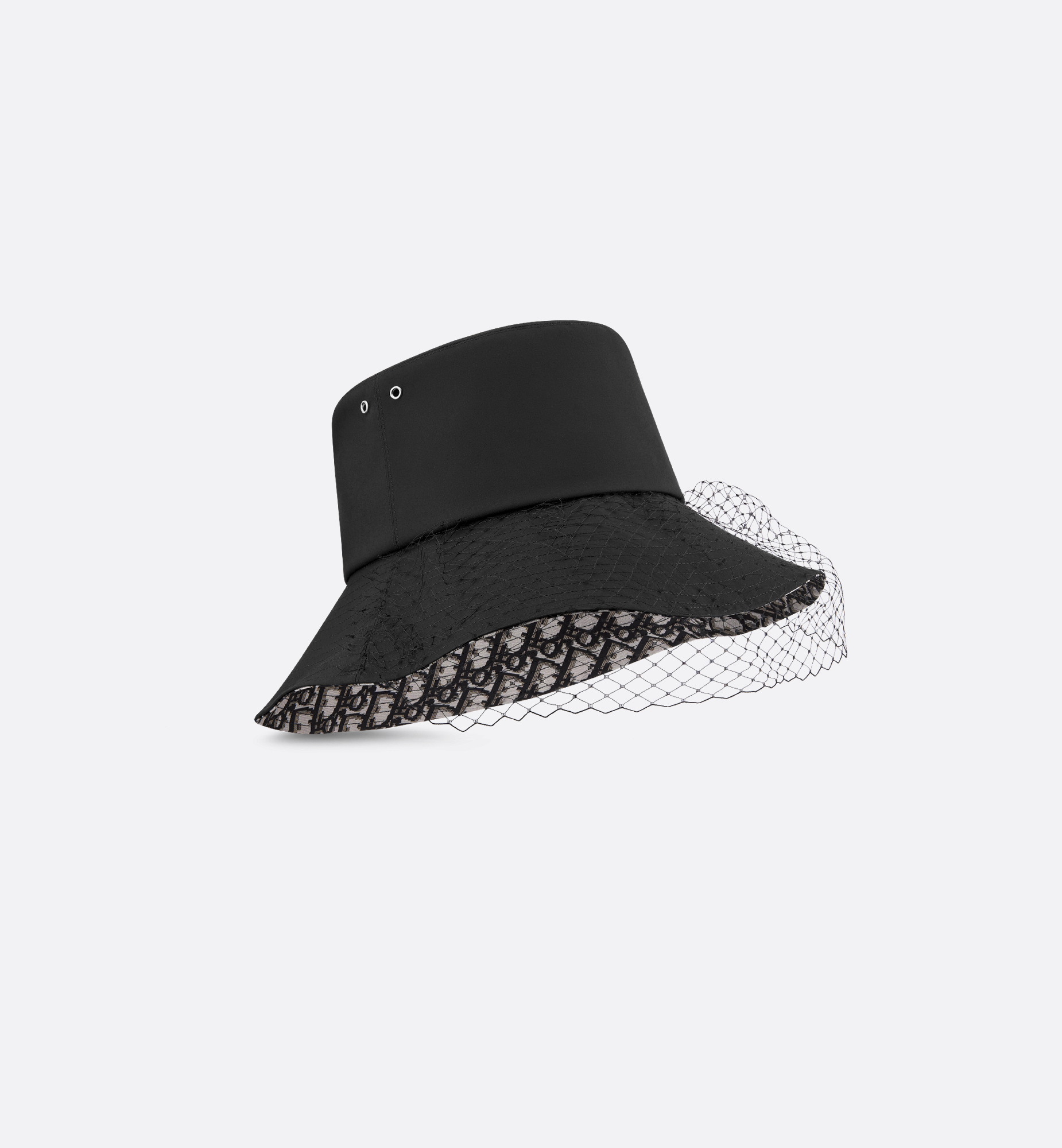 The bucket hat is completely reimagined by the House in a couture version. The hat is crafted in a black cotton blend, while a veil and contrasting brim with the black emblematic Dior Oblique motif lining elegantly complete the style. The large brim bucket hat will add the finishing touch to any day look. Large brim with topstitching. Brim lined with black Dior Oblique motif. 53% polyester, 42% cotton, 5% polyurethane. Veil: 100% nylon. Lining: 100% cotton. Made in Italy