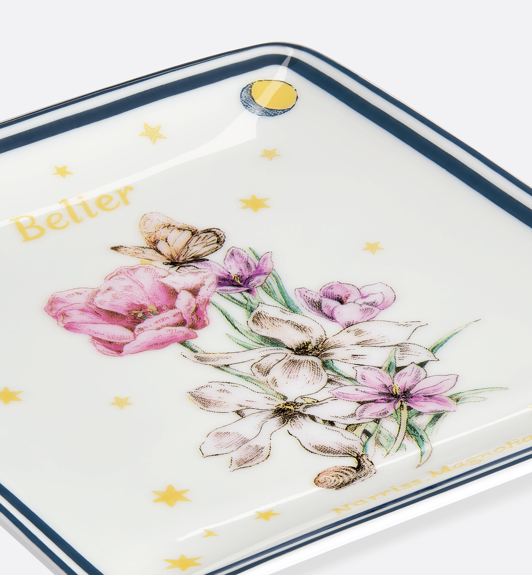 The trinket tray is unveiled as part of the Dior Lucky collection, drawing bold inspiration from Christian Dior’s lucky symbols. Crafted in ecru Limoges porcelain, the trinket tray is adorned with a multicolor Fleur du Zodiac motif representing the Aries sign. The design will enhance any home with the House’s iconic codes and can be coordinated with other unique creative pieces from the collection. 100% Limoges porcelain. Hand wash. Made in France