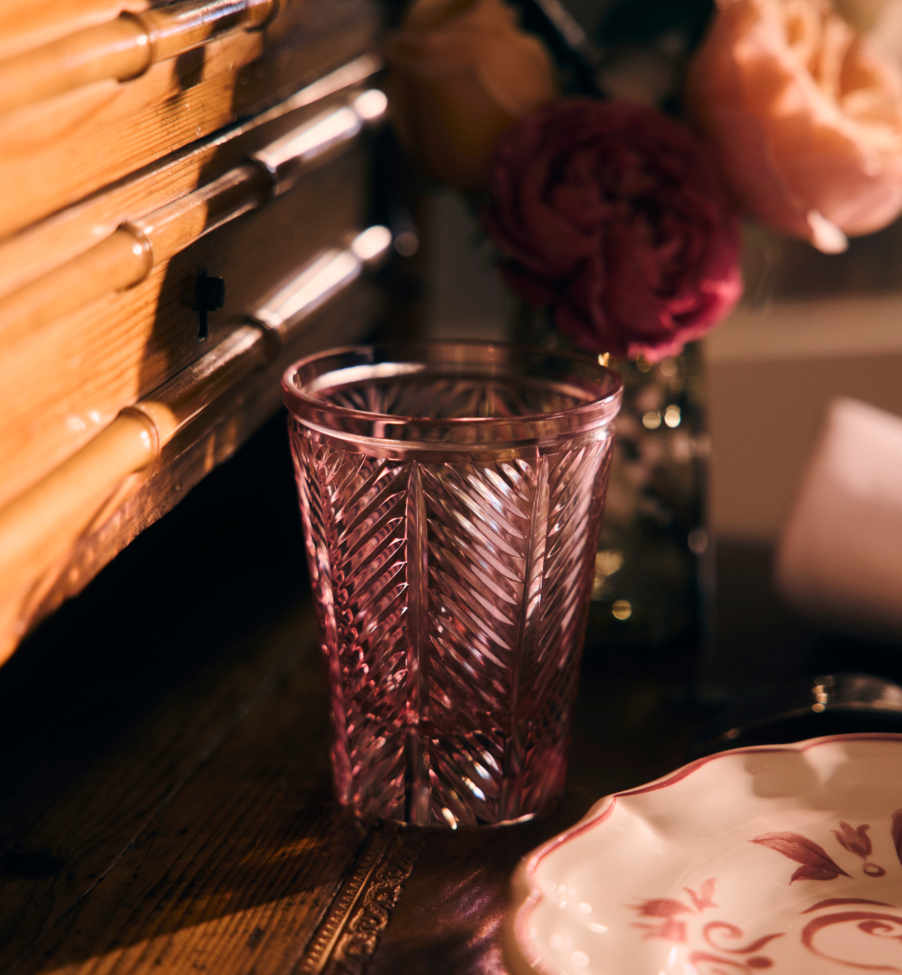 Pink crystal water glass with hand-engraved chevron motif. 100% crystal. Dishwasher safe. Made in France